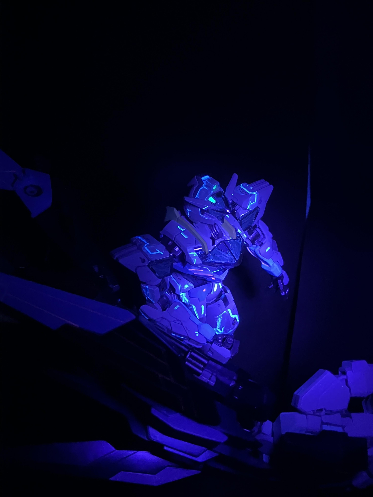 ホワイト部を蛍光ブルー、ブルー部を蛍光ピンクで墨入れしています。パーメット発光が表現できお気に入りです。