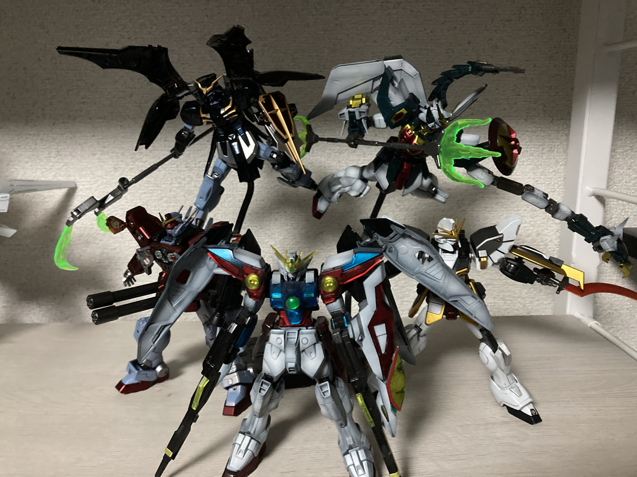 以前制作したhgウイングゼロに加え、アルトロン、デスサイズヘル、サンドロック改、ヘビーアームズを制作しました。