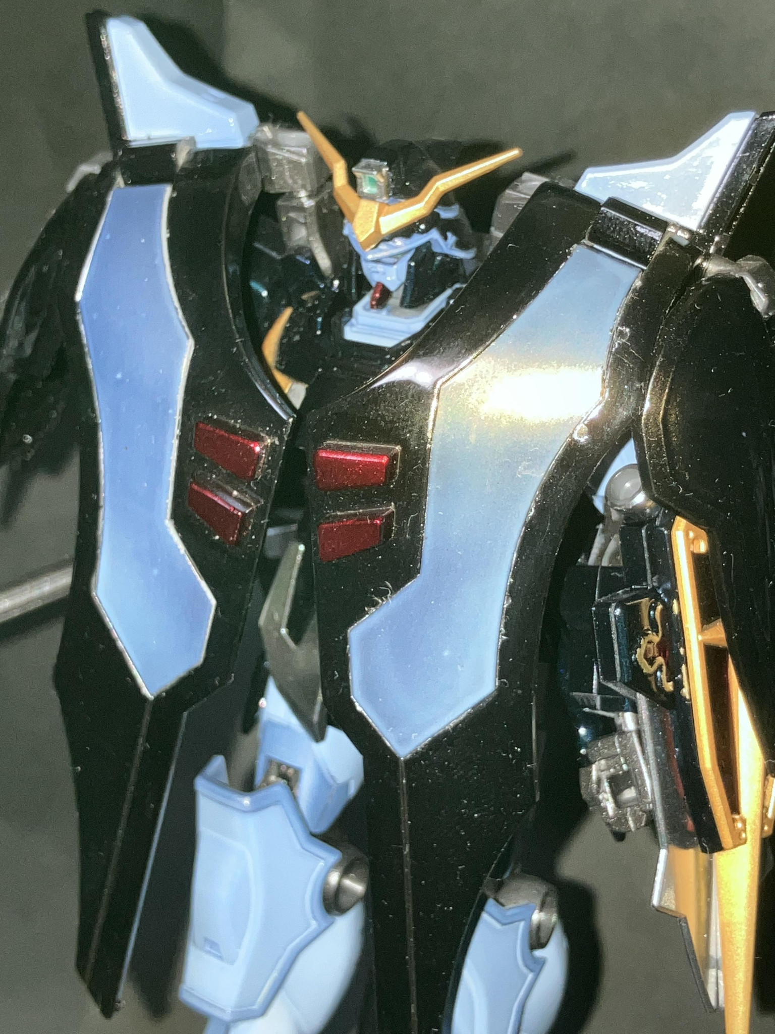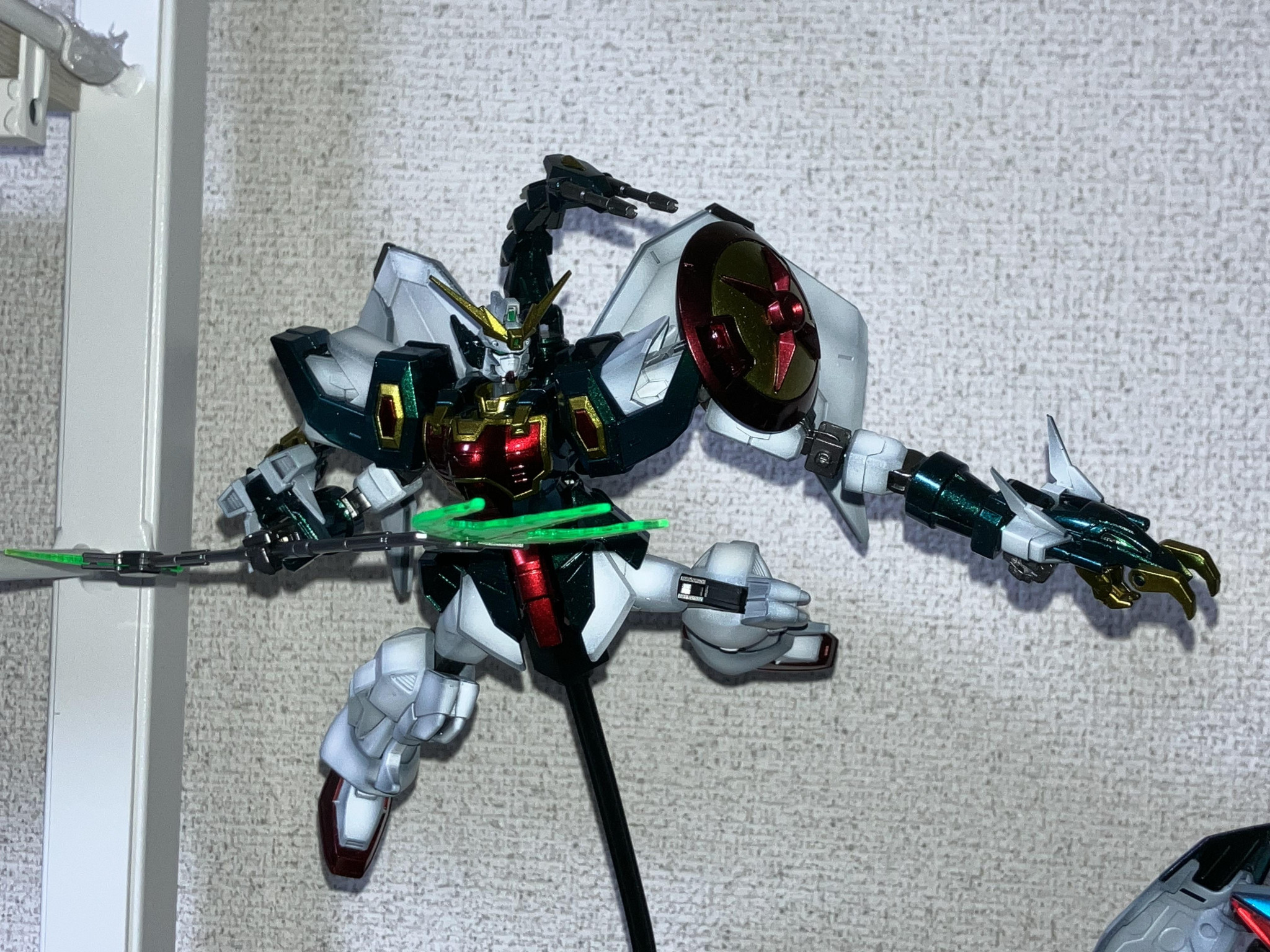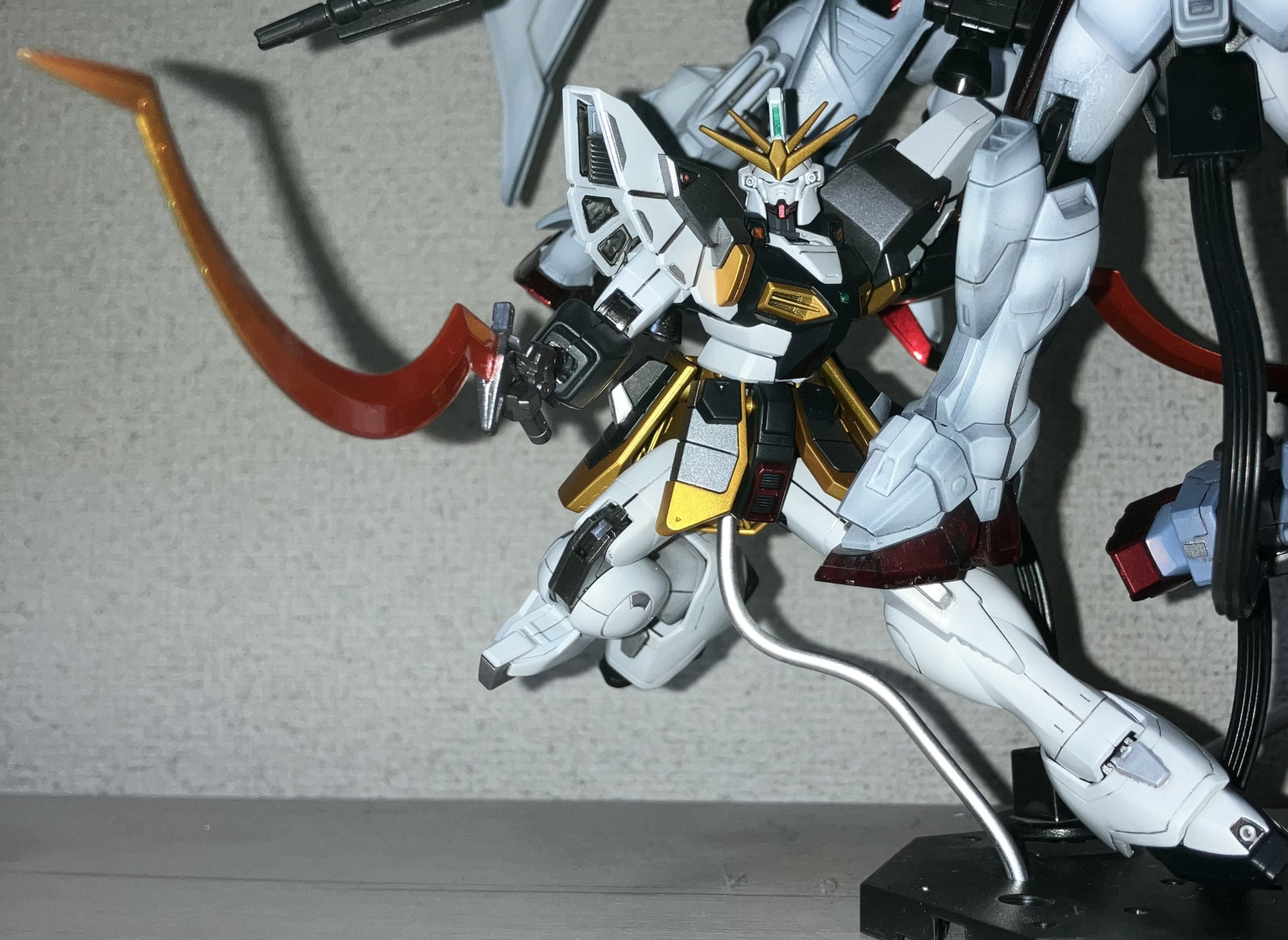 デスサイズヘルはアクティブクロークをボーンペイントのメッキにしましたが、フィニッシュクリアのブラックとホワイトの発色に苦戦し、塗膜が厚くなり組み立て時に割れてしまった箇所があります。しかしいい光沢なのでリベンジしたいです。