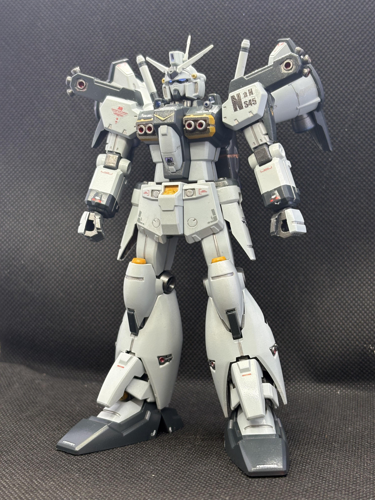 水転写式デカールは寄せ集めと余っている自作のやつ。関節やバーニアを避けて艶消し仕上げにしています。眼は金色の上に透明蛍光塗料。センサー類は水色のラピーテープをUVレジンで蓋しています。あとはバーニアっぽいところや頭部バルカンなどの穴あけくらいです。