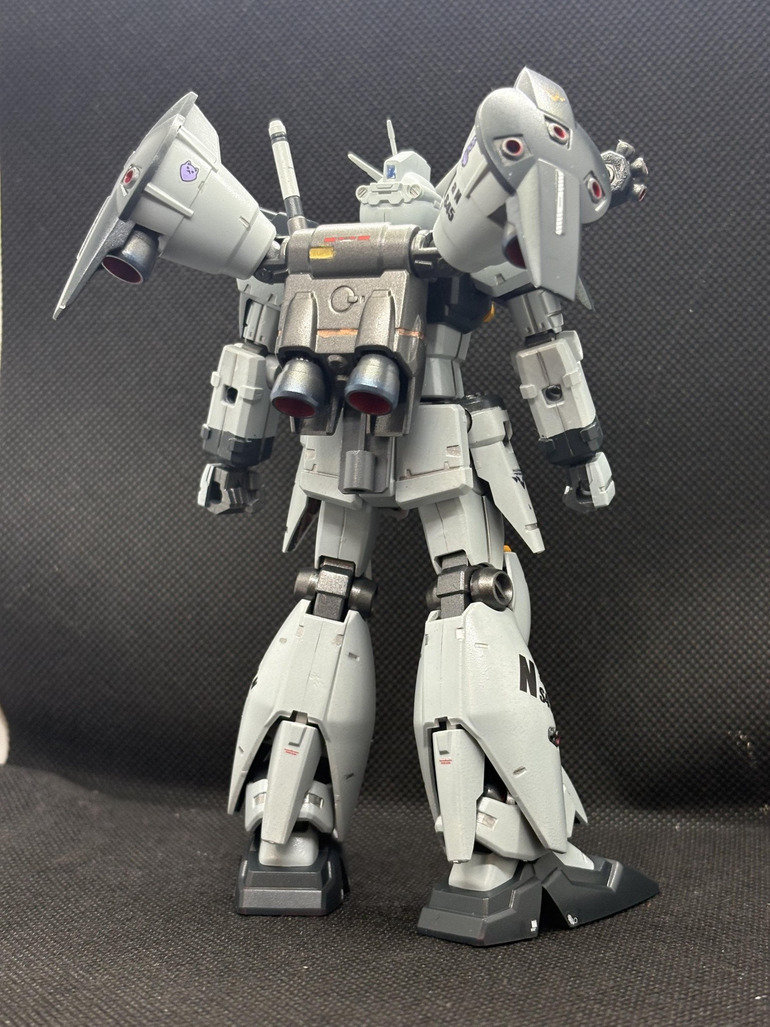 いつもの海軍風?配色です。肩のポリキャップをボールに替えています。ちょっとだけ可動範囲が良くなりますが保持力は下がりました。シールドをつけると結構厳しいかも。シールドは肩と干渉しないよう、穴を追加して取り付け位置を下げています。足裏の中央にどっかの余剰のバーニアとりつけていますが、写るアングルの写真撮ってませんでした。