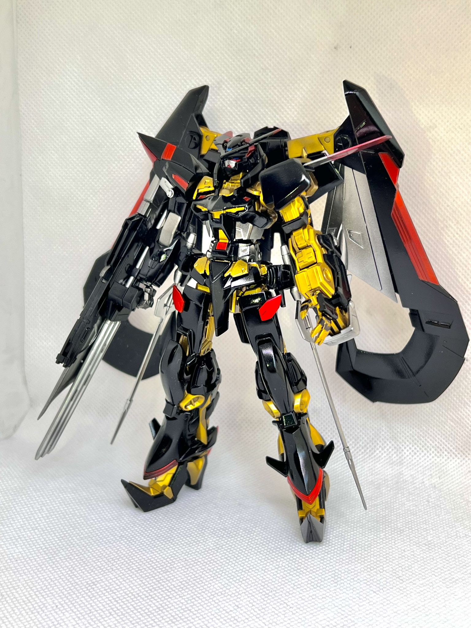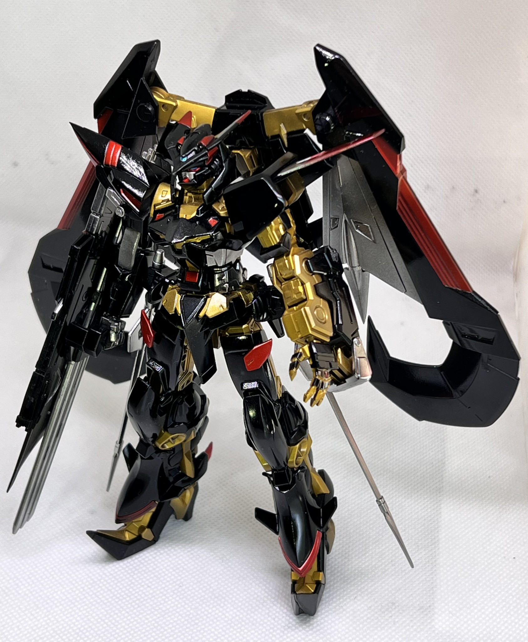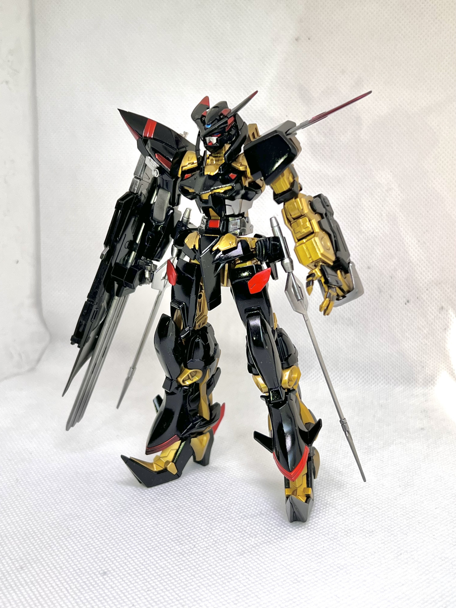 HGのガンダムアストレイゴールドフレーム天ミナをメタルビルド版同商品のアレンジを一部真似て武装も付け加え制作しました!