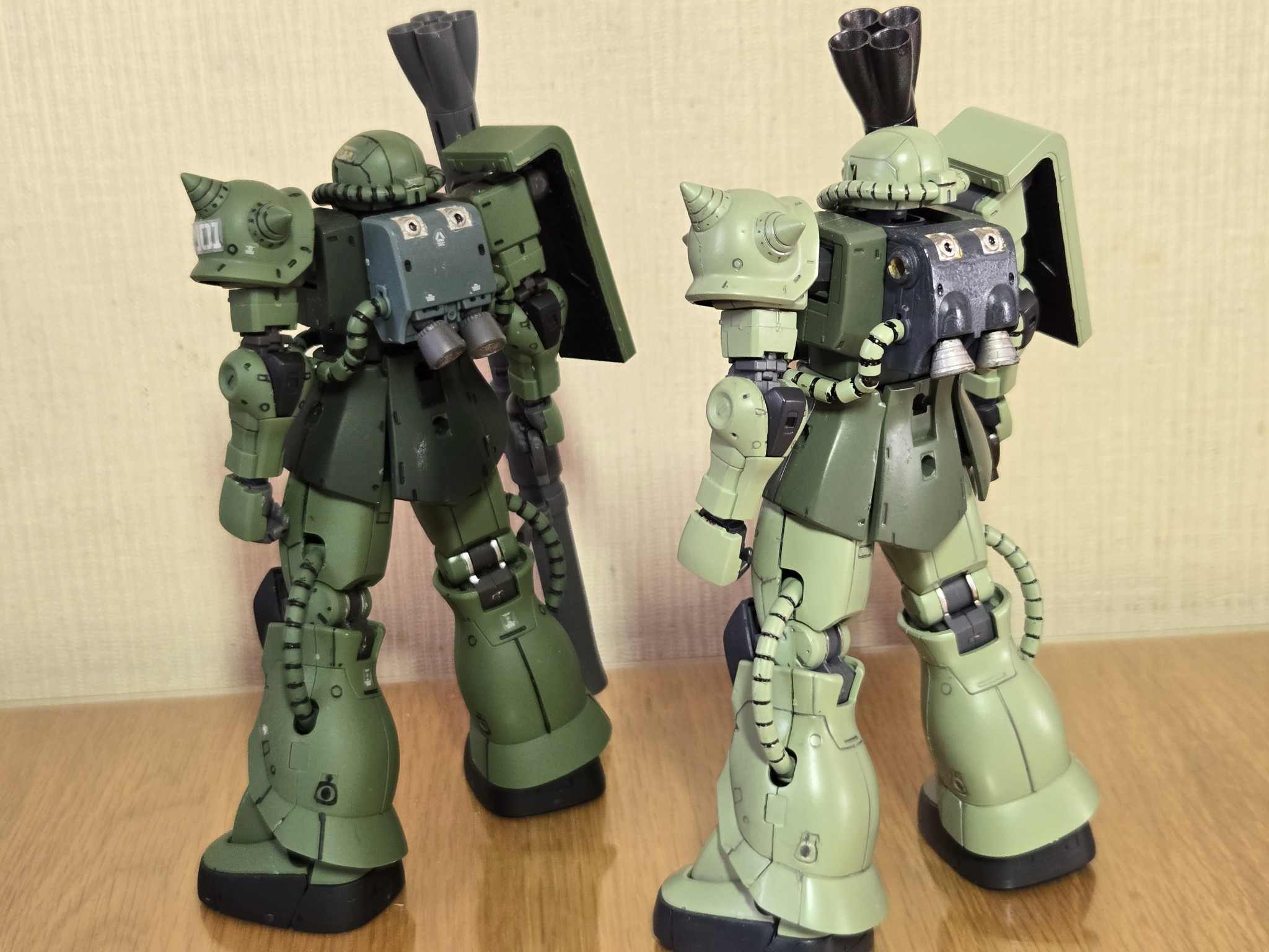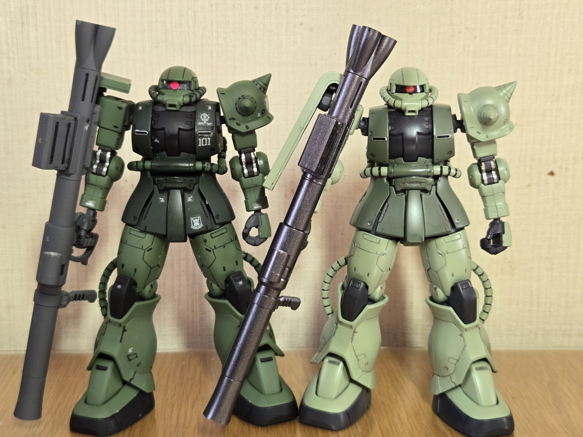 number16 HG 2025.11/24更新 オリジンカラーとアニメカラー 量産型ザク 64 16 いいねしたモデラー(16) 1 0 作品を共有 オリジン版モデルで、オリジンカラーとアニメカラーのザクを個別で紹介しましたが、両方並べたくて改めましての紹介しました。 好みは分かれるでしょうね~(笑)私はアニメカラーに一票です!やはり、小学生の時のザクの色は忘れられません。ザクは衝撃的な登場でした!でも、オリジン版は凄味がありますね。 どちらにも各々の良さがあります。✨️迫力のリアビュー!同じモデルでも色の違いで、大分印象が変わるものです👍 量産型ザク コメント コメントをして応援しよう コメントにはログインが必要です @fomp4310 1時間前 違いの分かるザク💦 number16 40年ぶりにガンフラ作成を復活しました。ファーストガンダム世代の私なので、その頃のMSが中心の作品になると思います。当時を思い出して、楽しみながら作っていますので、どうぞよろしくお願いします。 6 オリジン版 量産型ザク アニメカラー オリジン版モデルのアニメカラー版を作りました!やはり、ザクは… 5 オリジン版 量産型ザク デニム機 オリジン版モデルは濃いめのグリーンで渋いですね!ですから、敢… 8 オリジン版シャア専用ザク揃い踏み! シャアが搭乗するザクの進化を揃えました!個別には既に投稿しま… 5 ジム ガンダムの量産機と言われたMSですね!簡素化して、性能ダウン… number16さんのページ この作品をお薦め作品に設定する Please login to update your profile! Please login to update your profile! Please login to update your profile! Please login to update your profile!