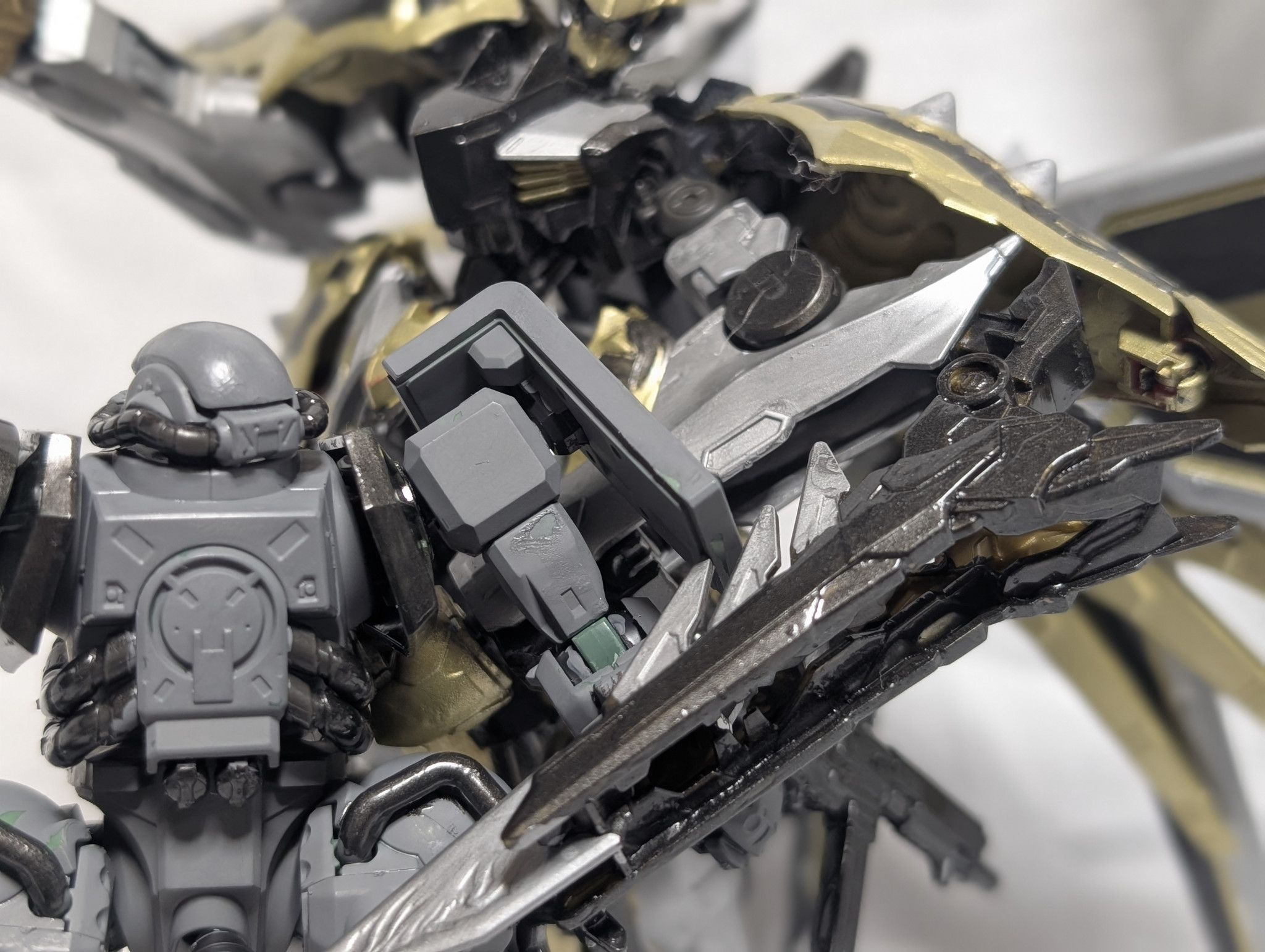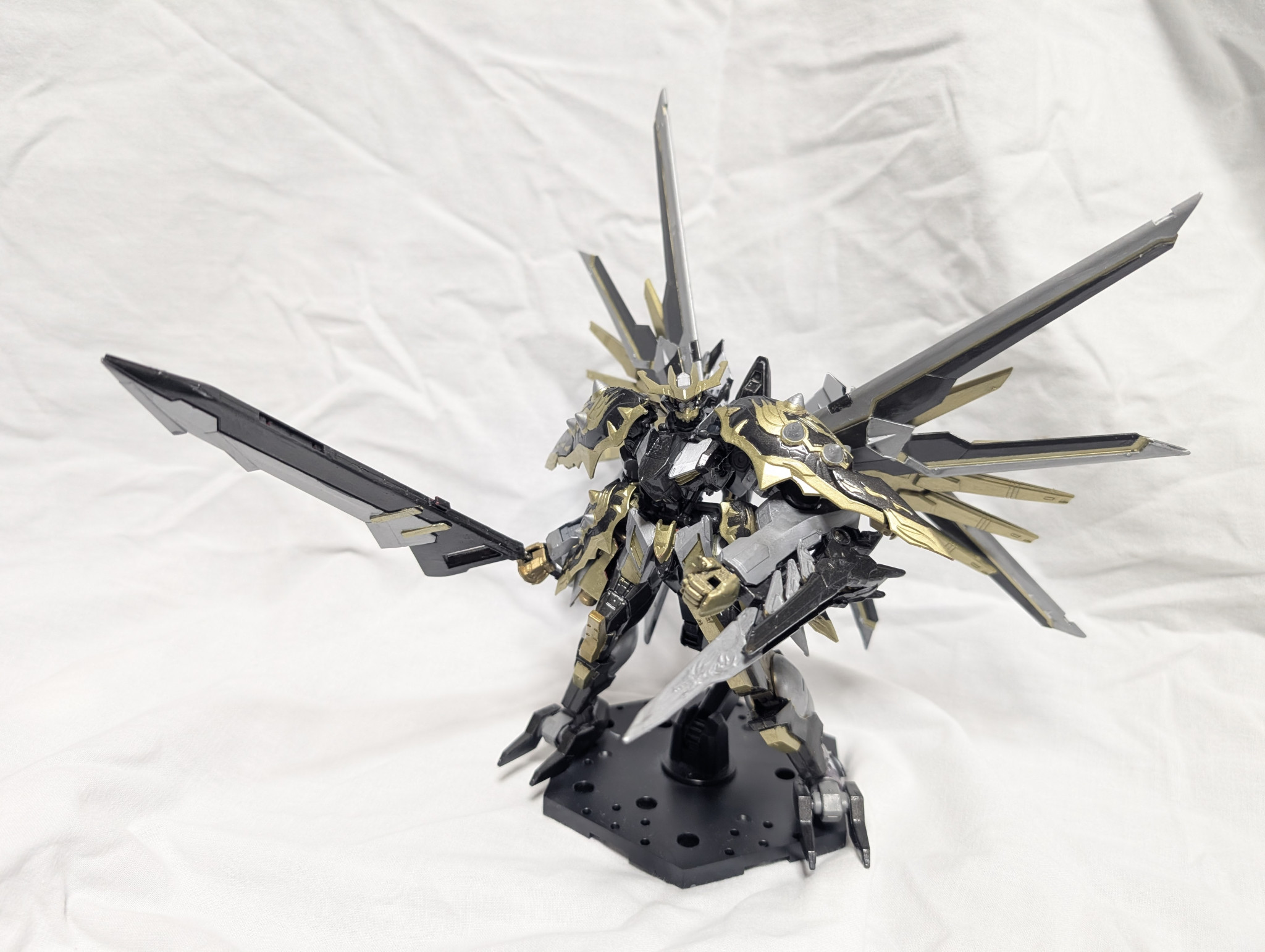 肩と腰に貂蝉クシャトリヤのシールド、背部にプライドディフェンサー、腕に龍尊劉備ユニコーンの龍締破刃を装備させ、脚部は、複数のパーツを組み合わせて作成しました。
