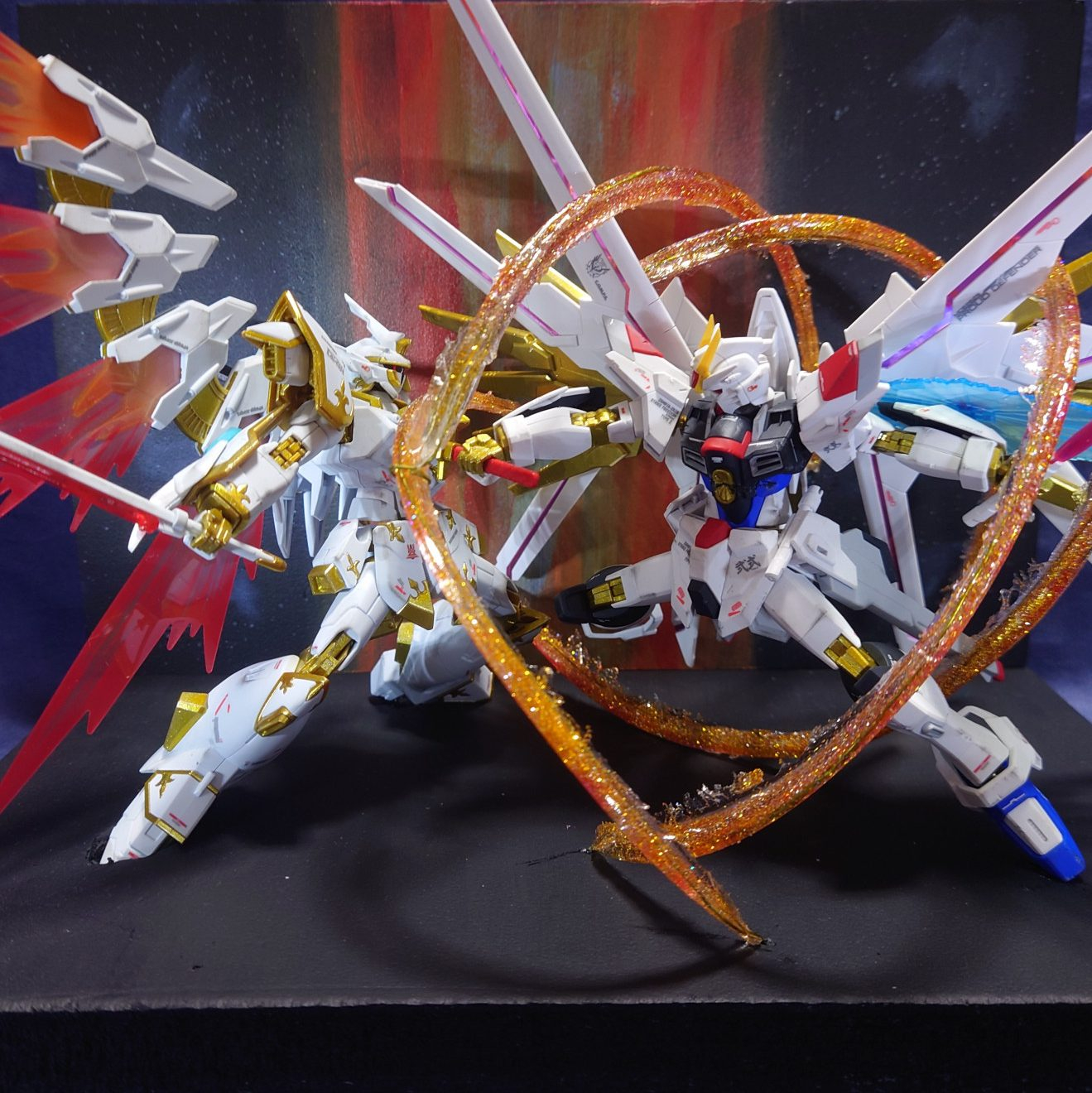 HGマイティーストライクフリーダムガンダムとブラックナイトスコートカルラを劇中の決着シーンを再現して作成しました!