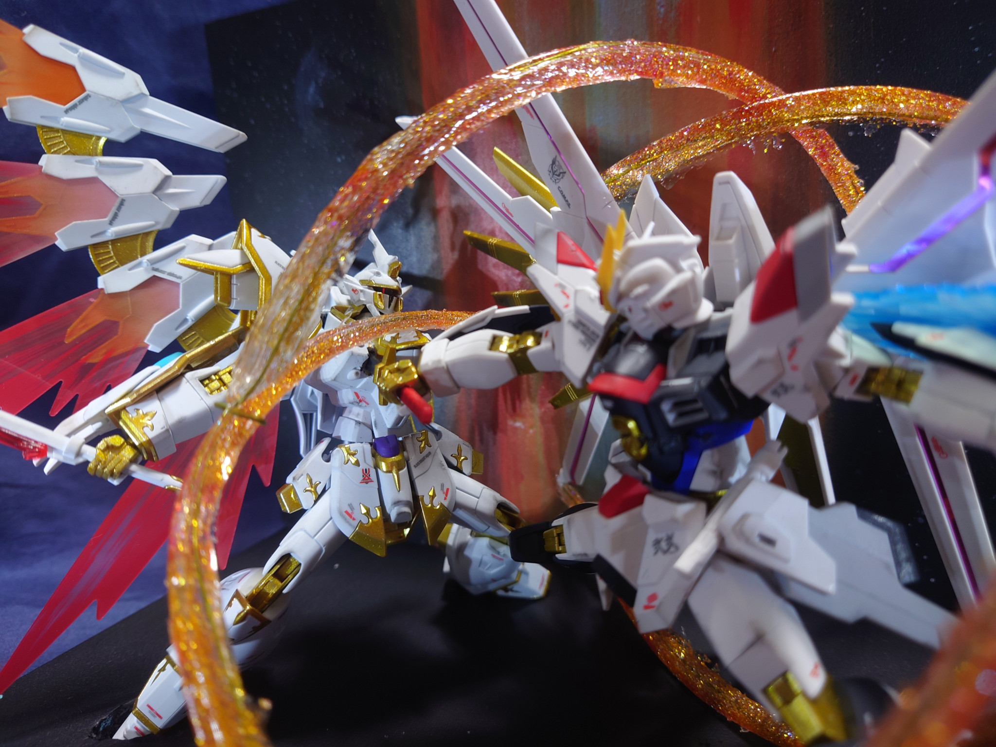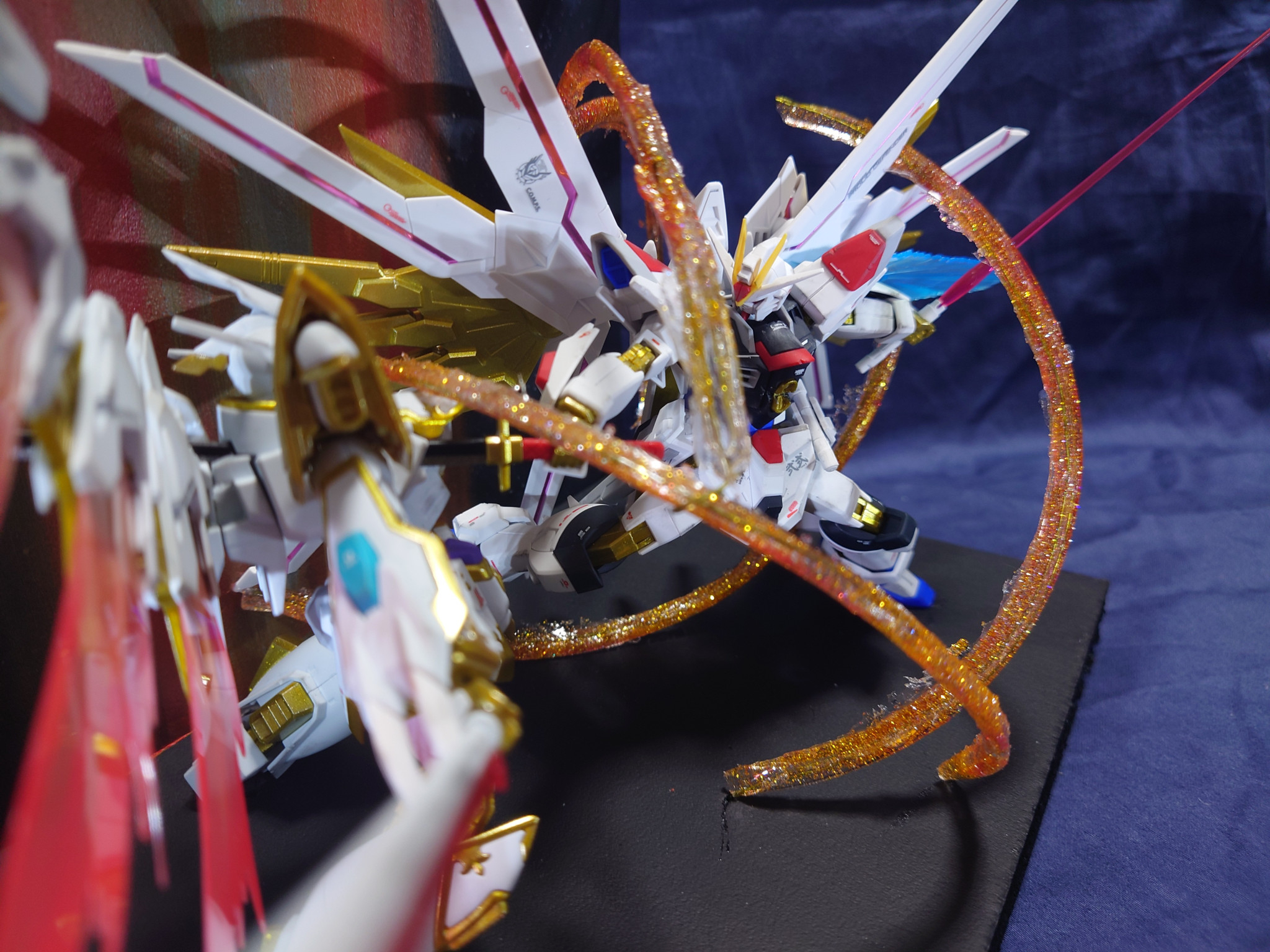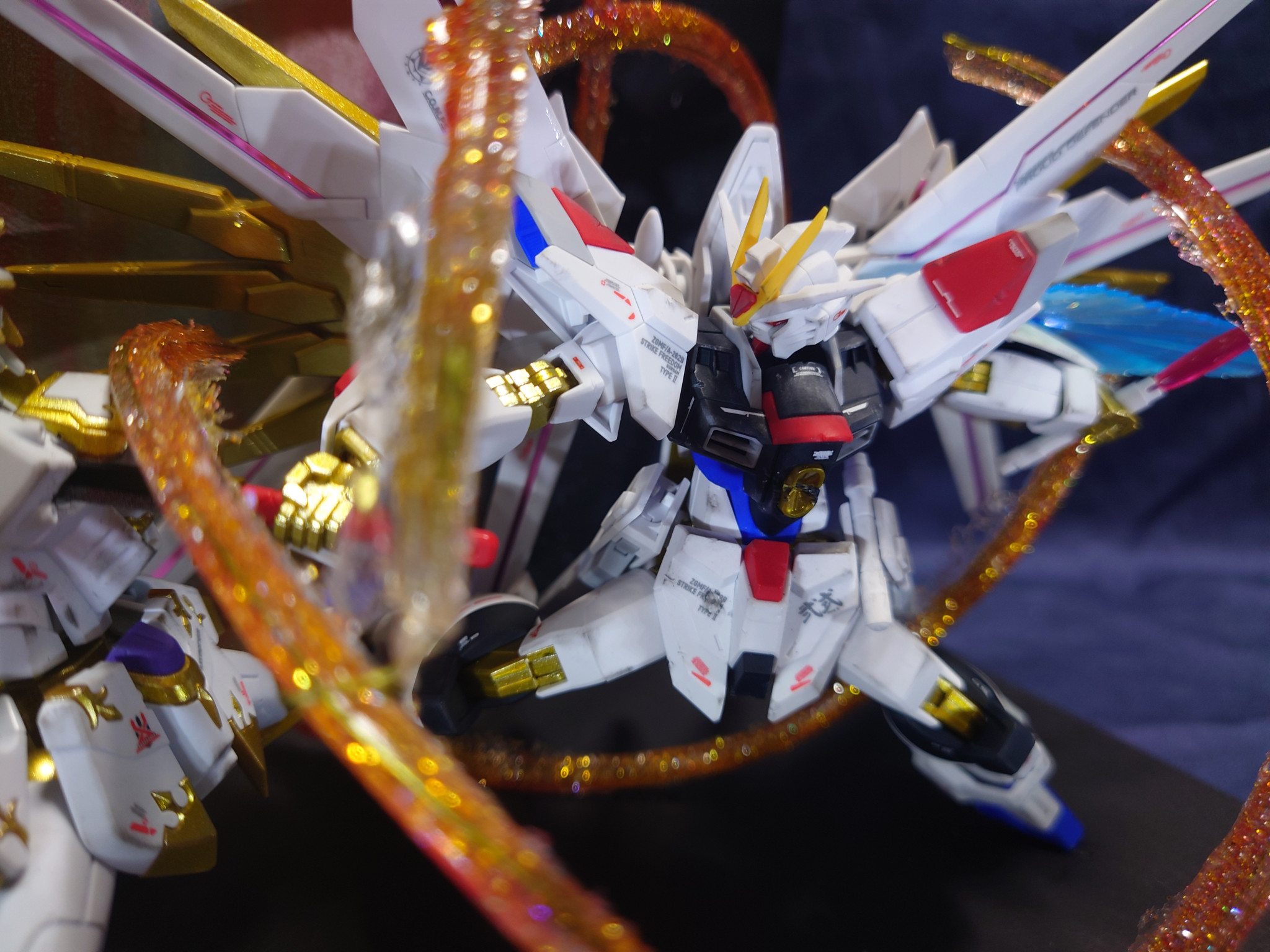 フリーダムが纏っている光の粒子?は針金を軸にレジンとラメ粒子で作成しています。