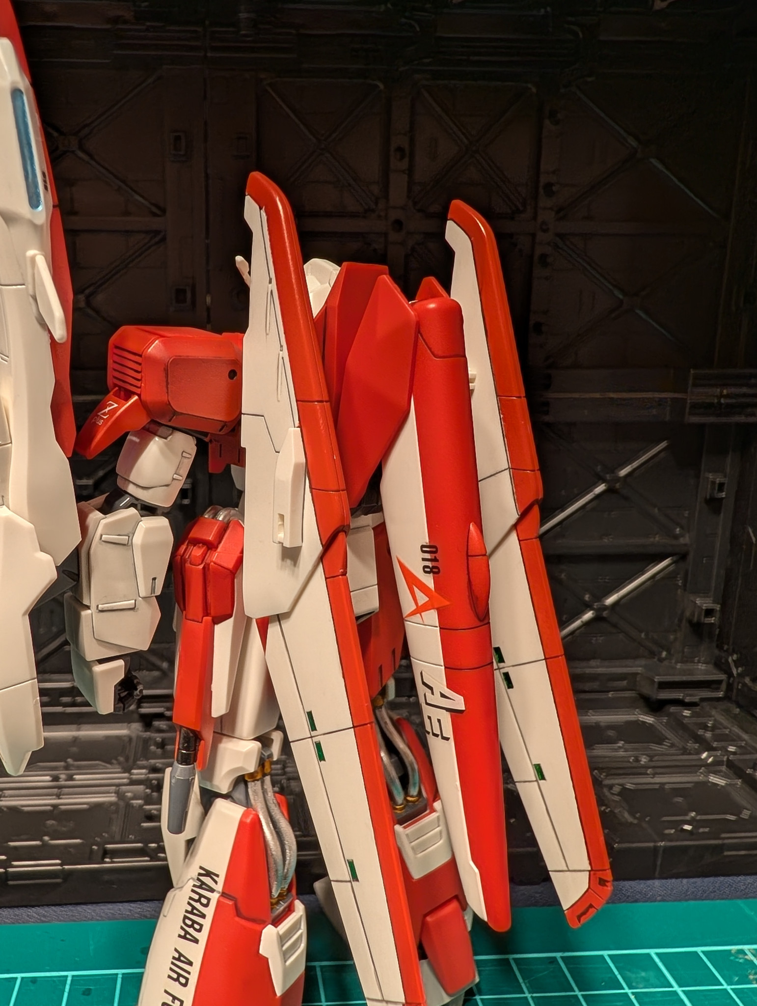 背中のウイングバインダーの塗り分け。スミ入れもキマった気がします。アナハイムエレクトロニクスのデカールもいいですね。