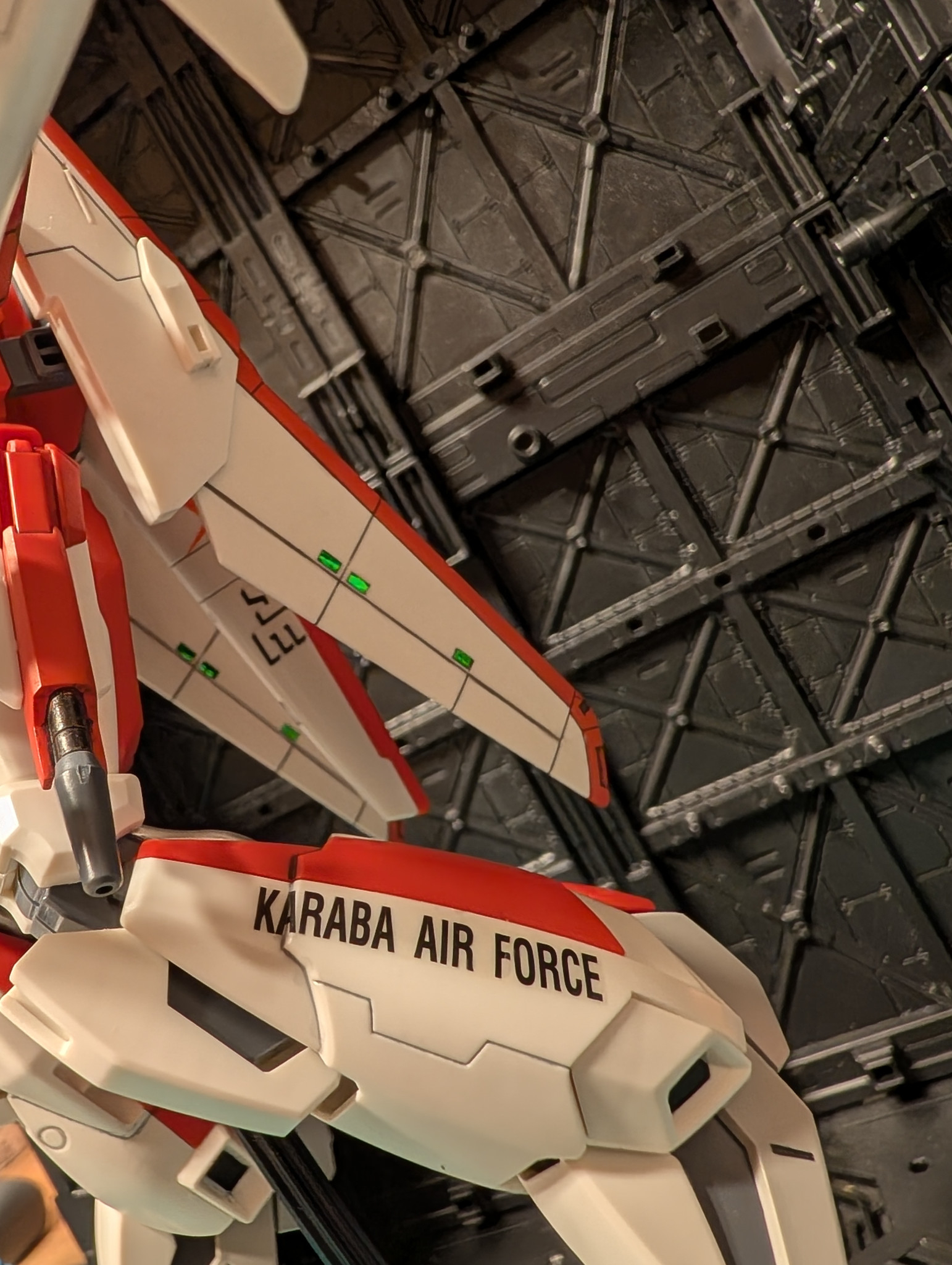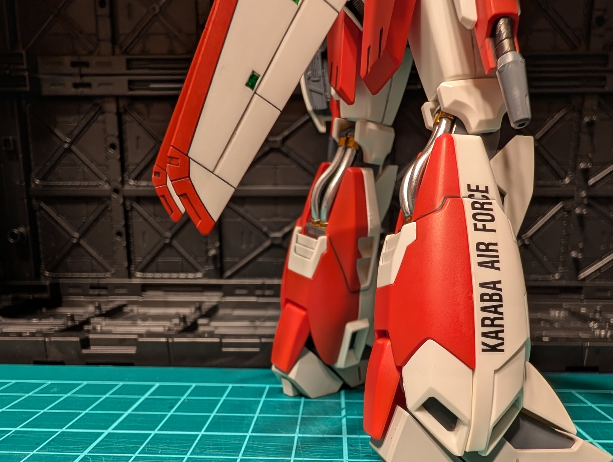 脚部はスラスターの中を黒に、膝裏のパイプもいつものシャインシルバーて塗り分け。足のカラバのデカールもいいですね。