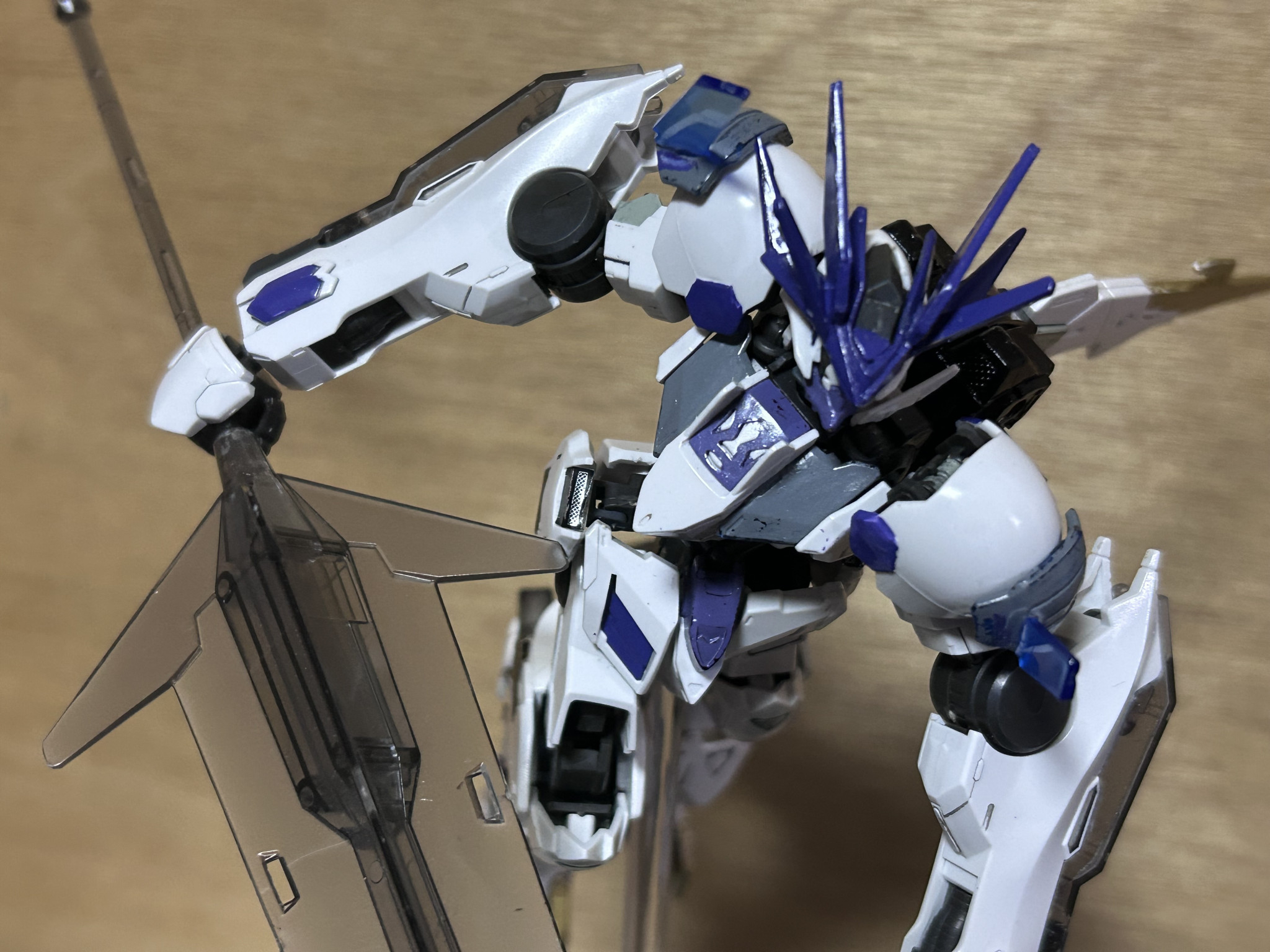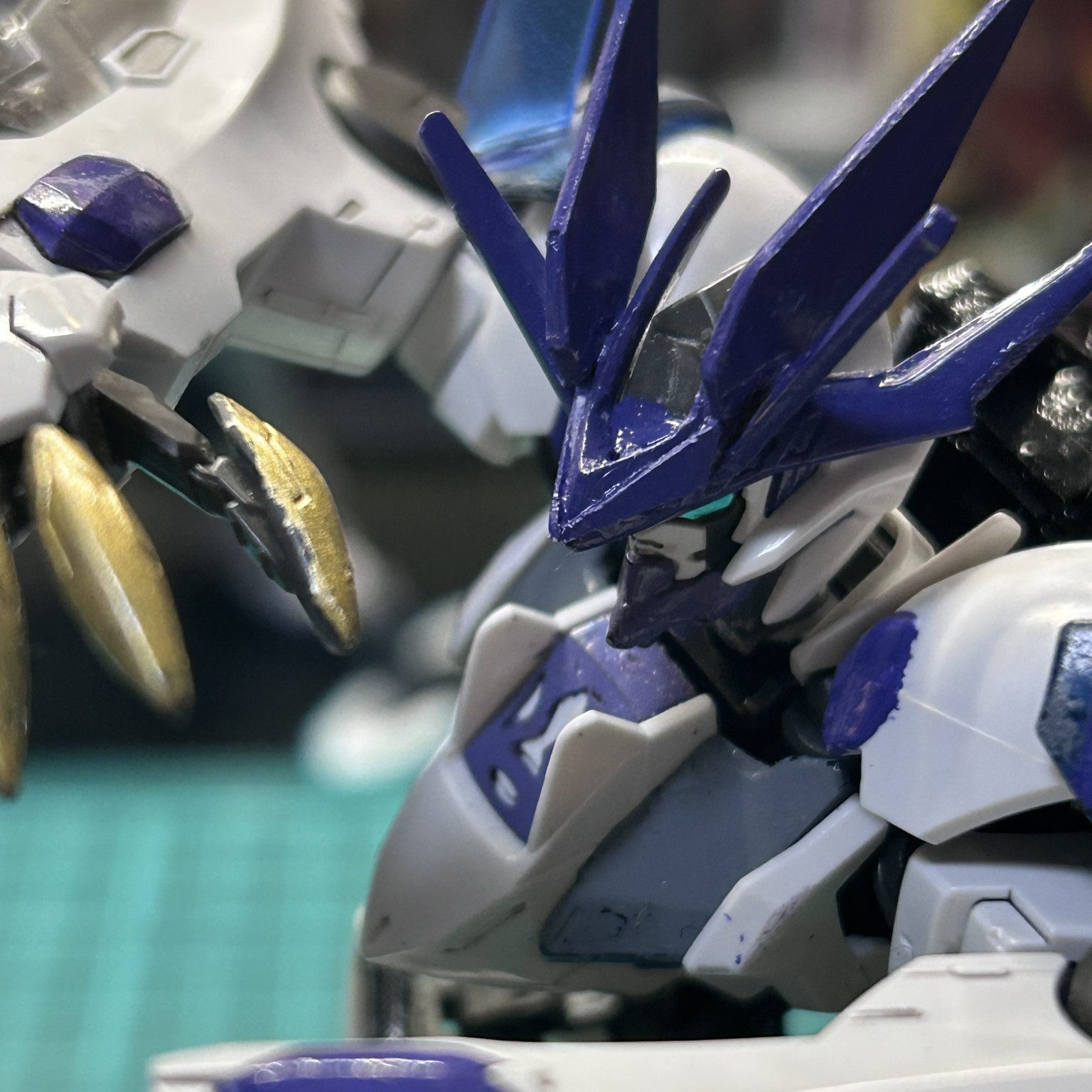全体的にバルバトスルプスレクスをG-3カラーっぽく塗ったように見えますが、一番特徴的なのが頭の角ですね