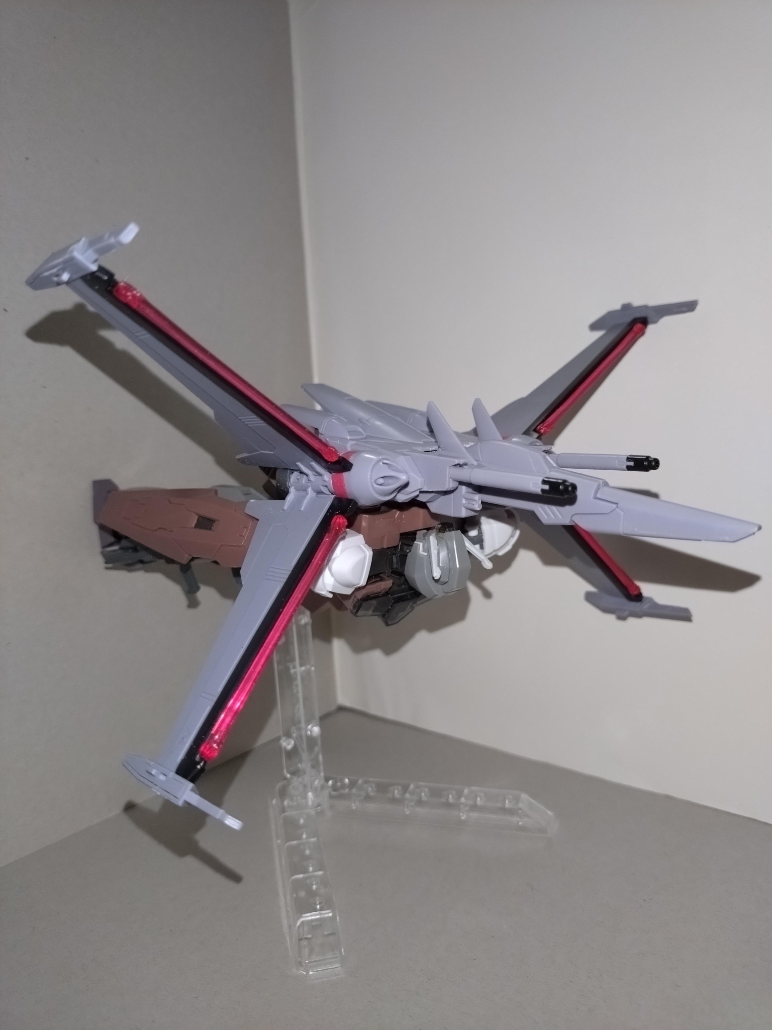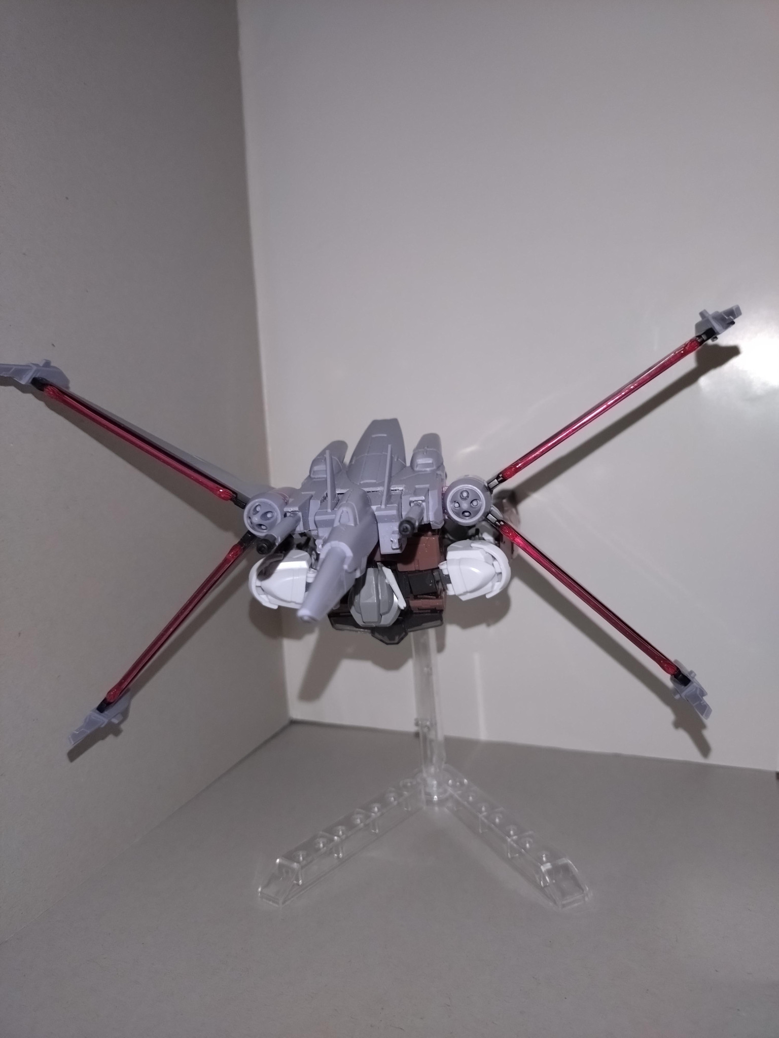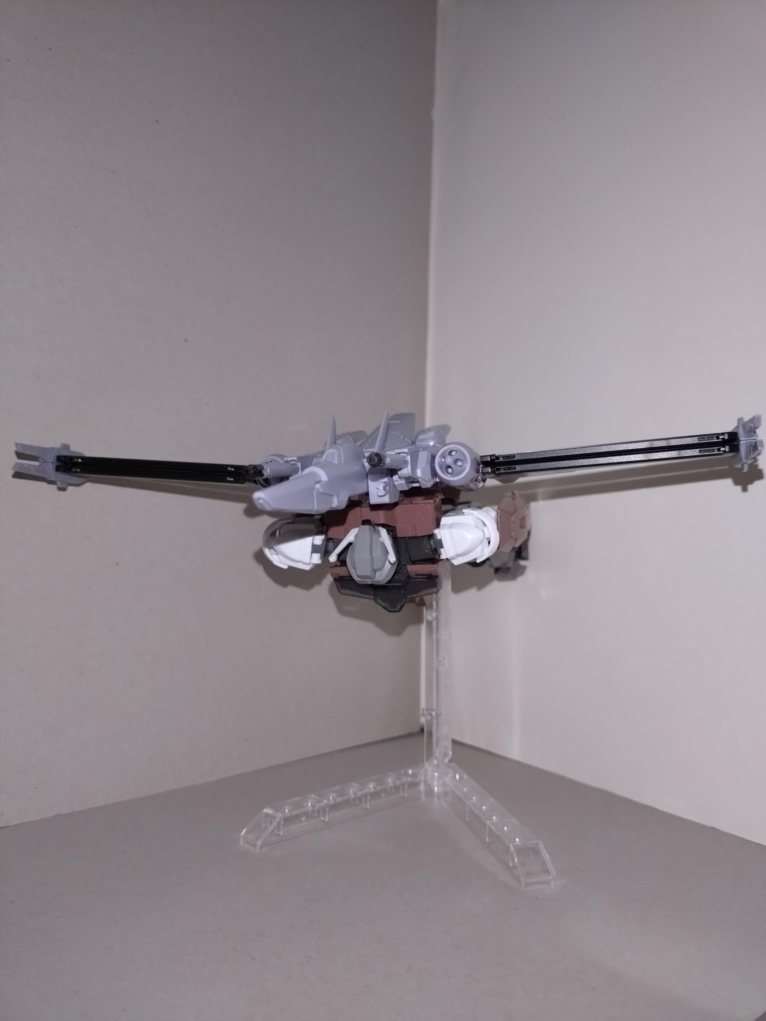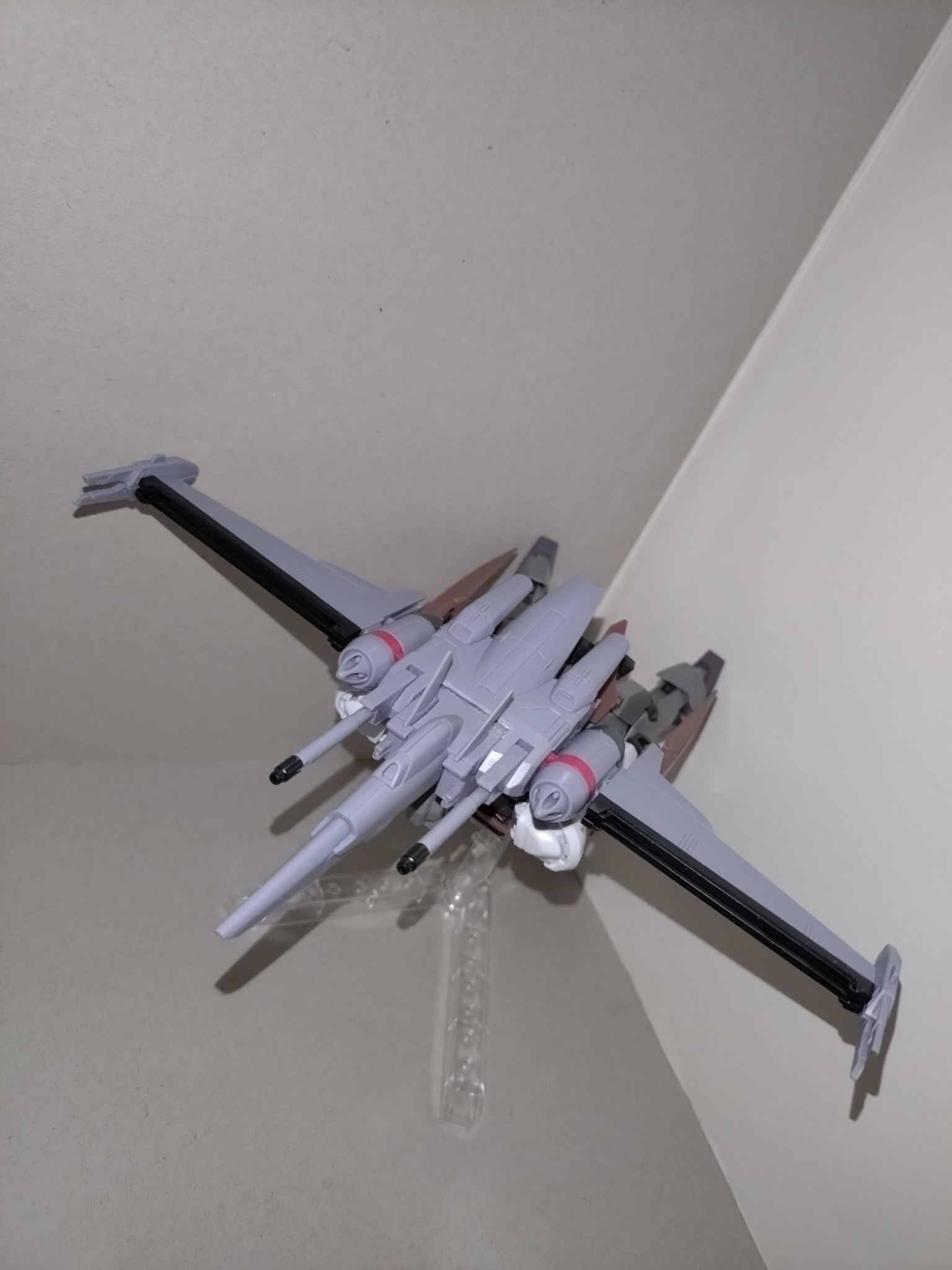 MS形態から、頭部と脚部を180°回転させ、背後にずらしていた機首を前に倒すと共に、主翼ブロックを90°回転させると、MA形態になる。