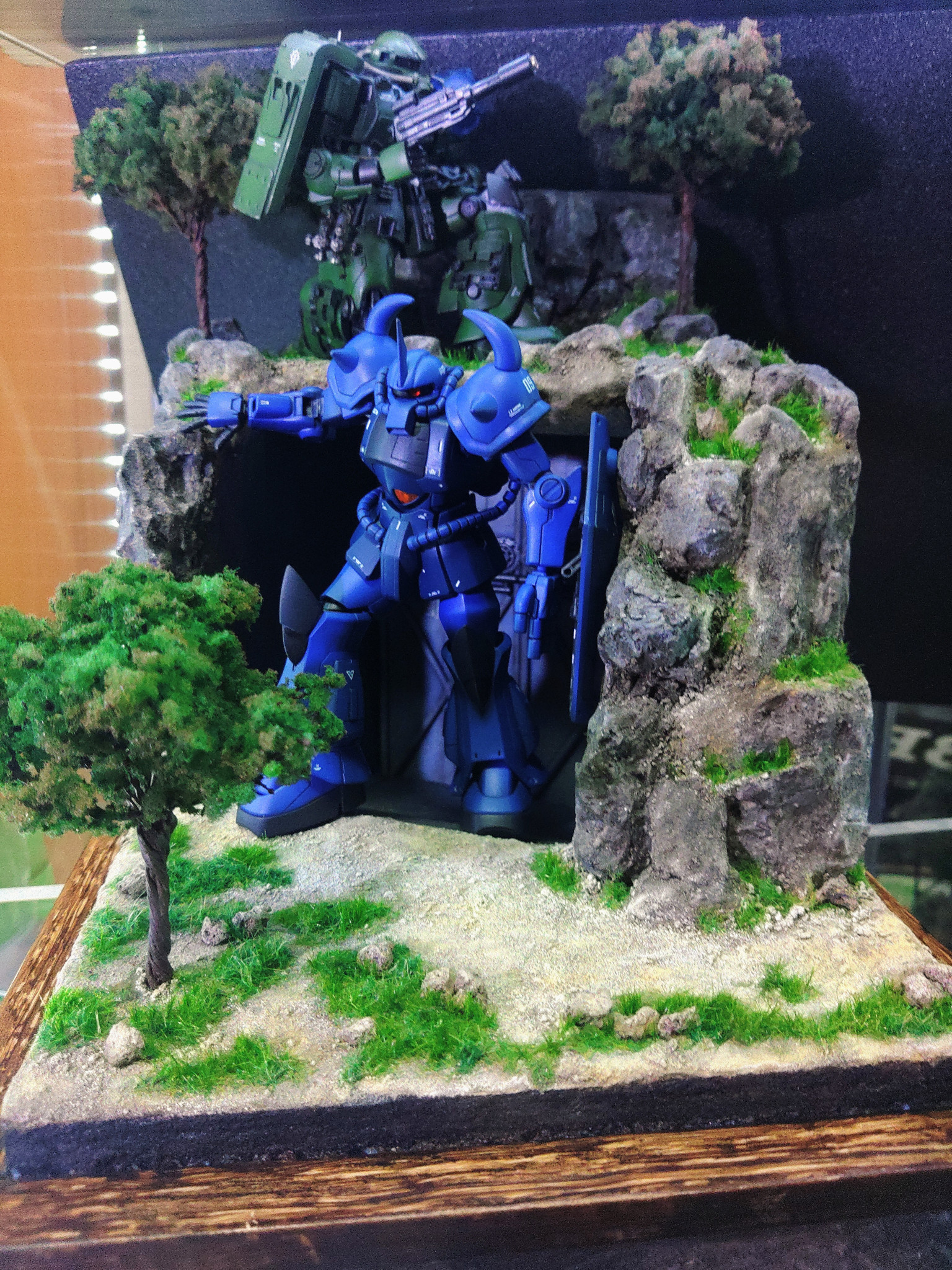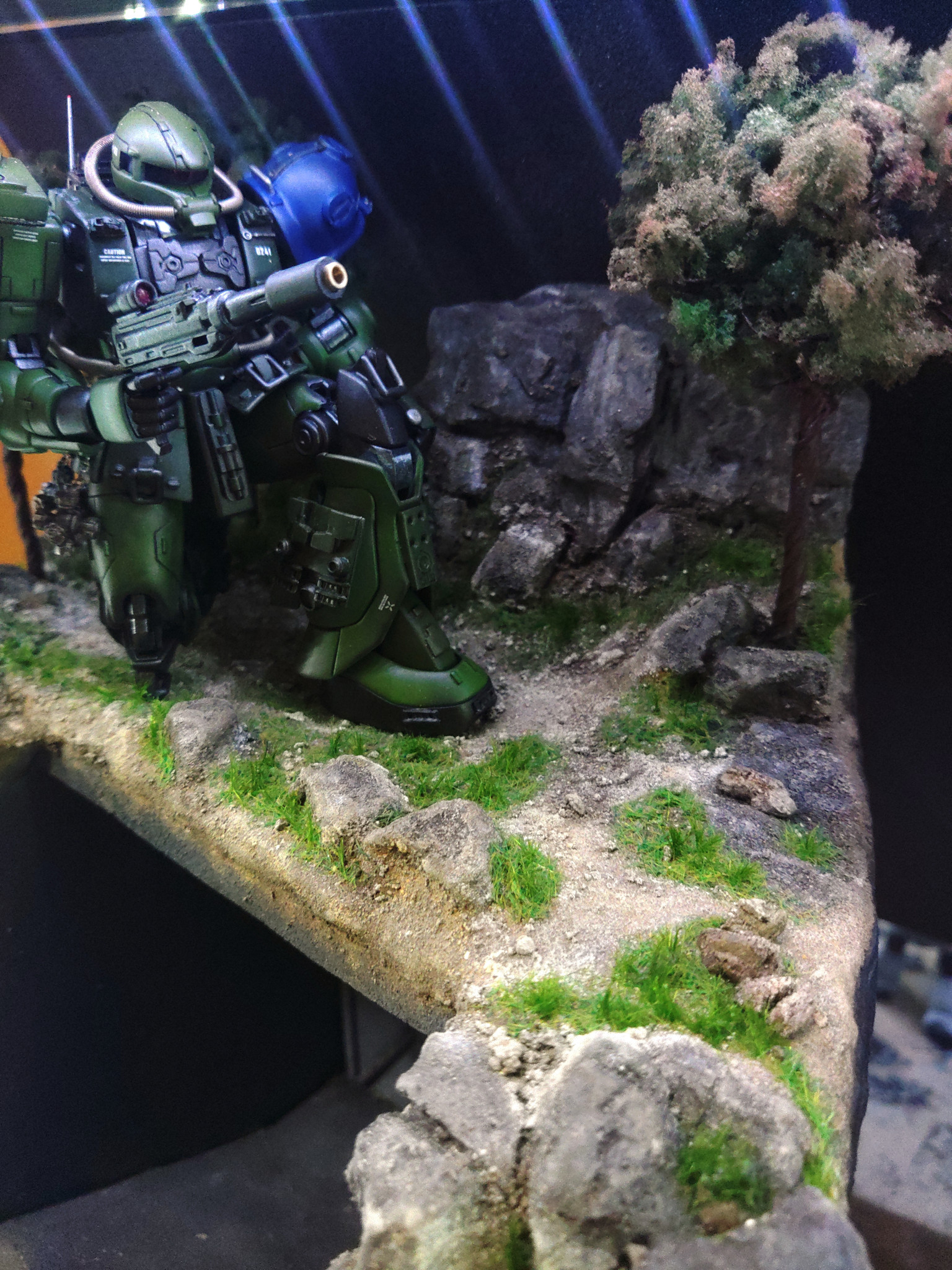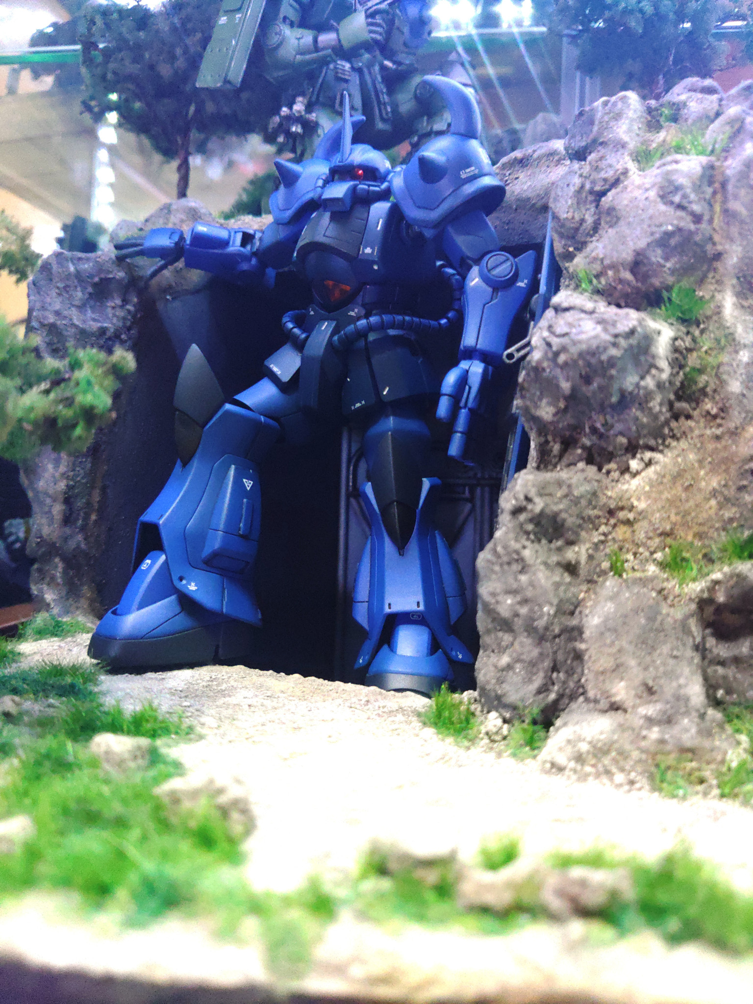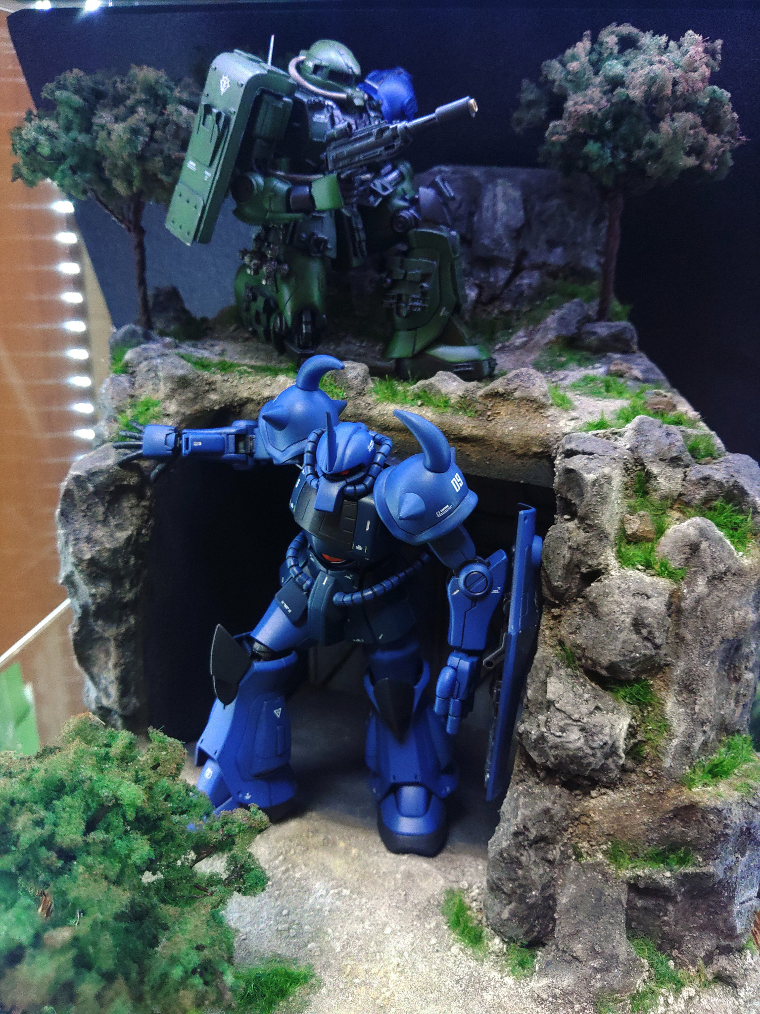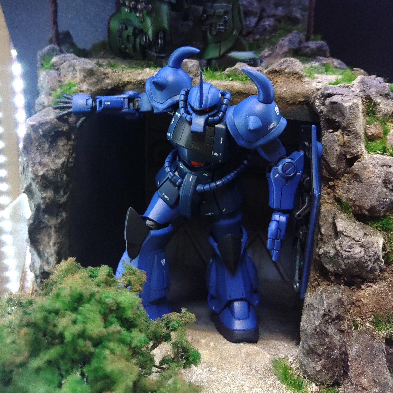 完成度の高いジオラマですねぇ!こういう隠れ家的な基地から出撃するグフ、とても似合います!