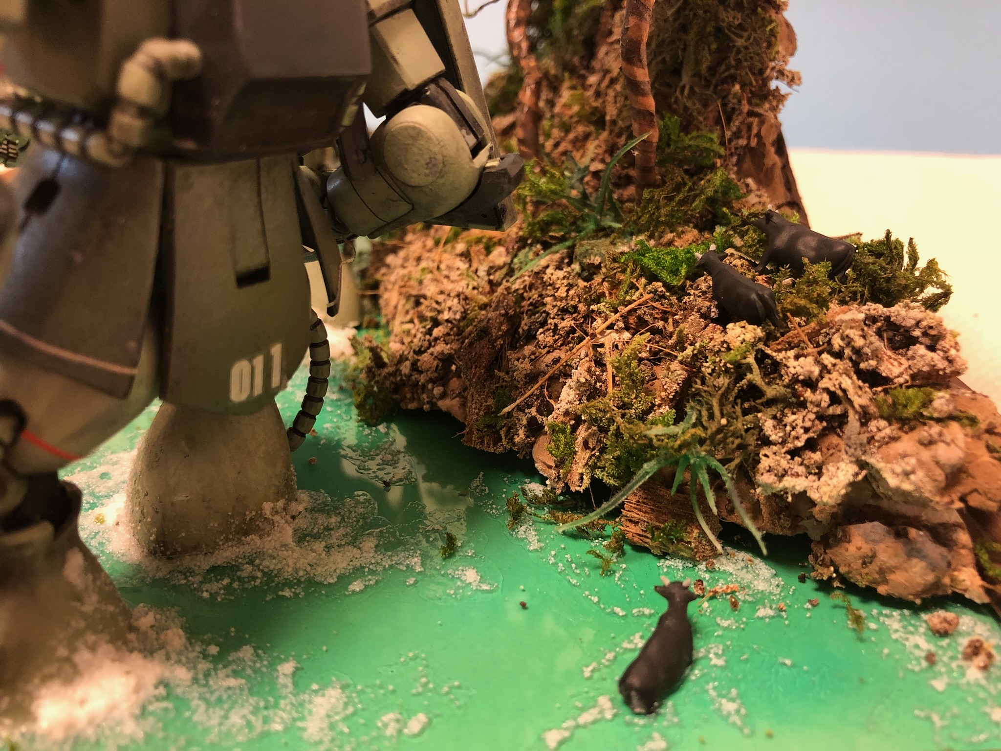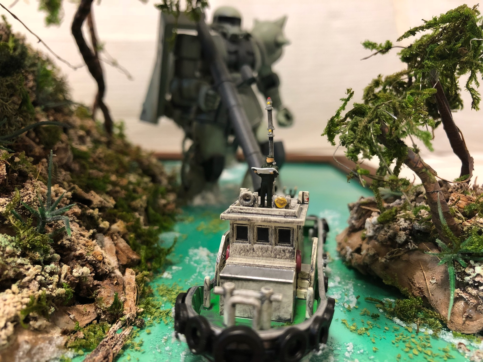 ザクの後ろを悠々と渡る水牛。トミーテックです。