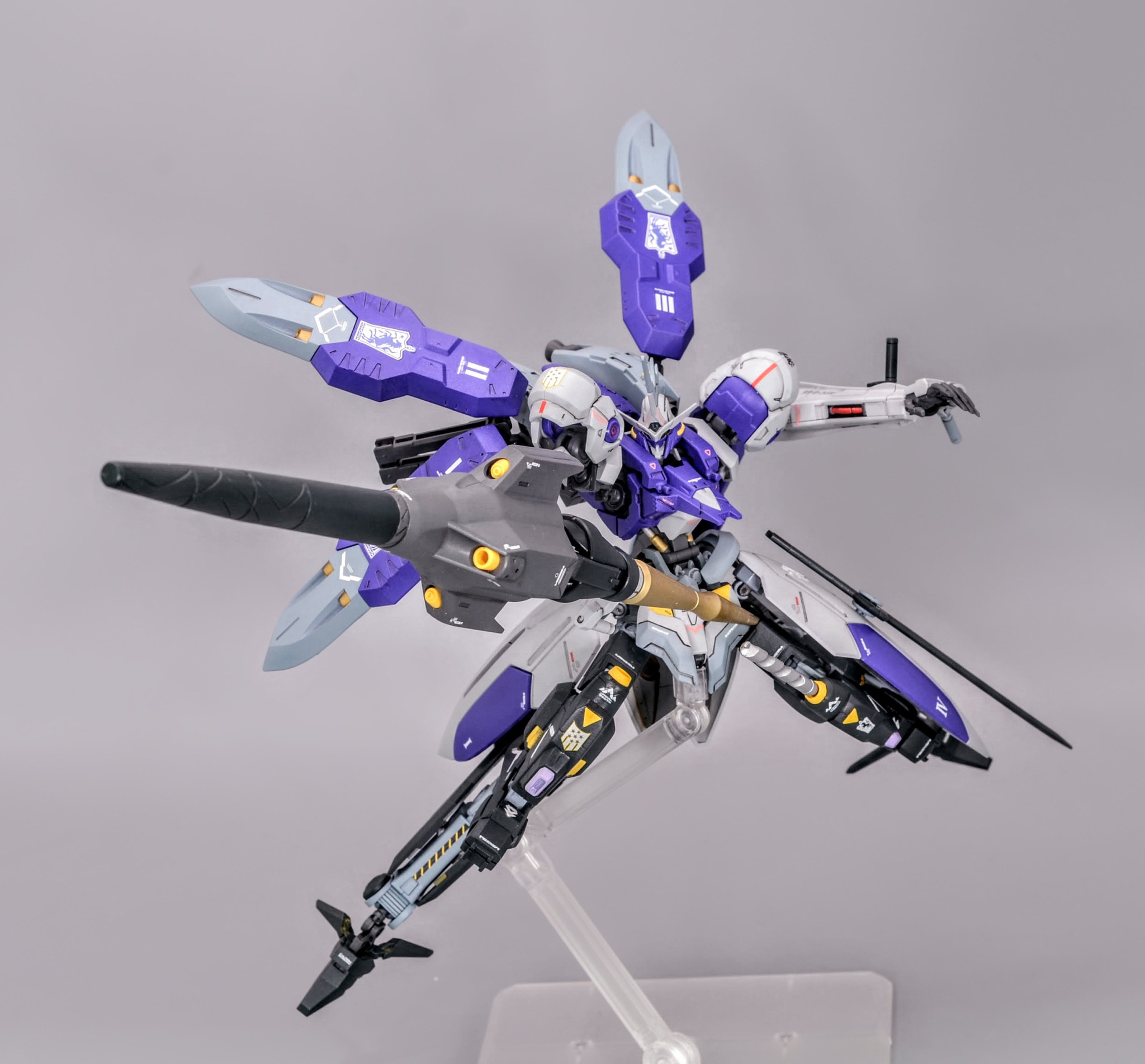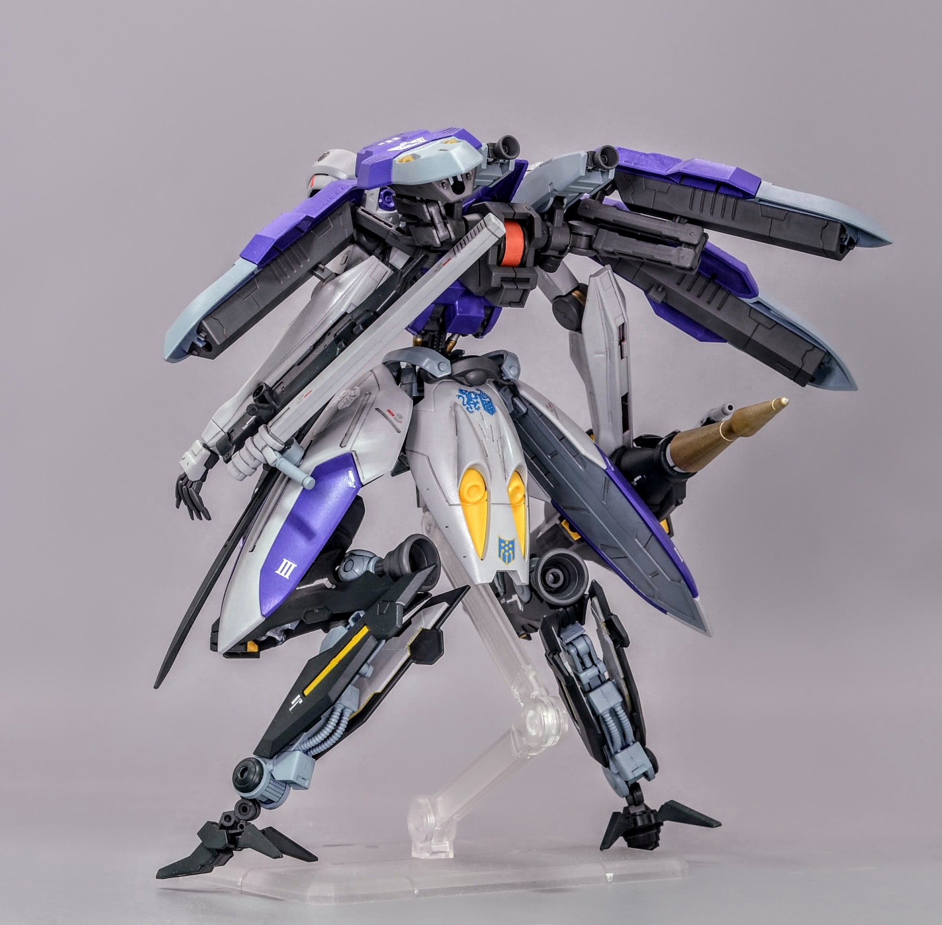 背部はレギンレイズから流用したブースターを装備、シールドも4枚に増設、サイドアーマーも大型化し内蔵バーニアによる瞬発力と防御力を両立している設定です