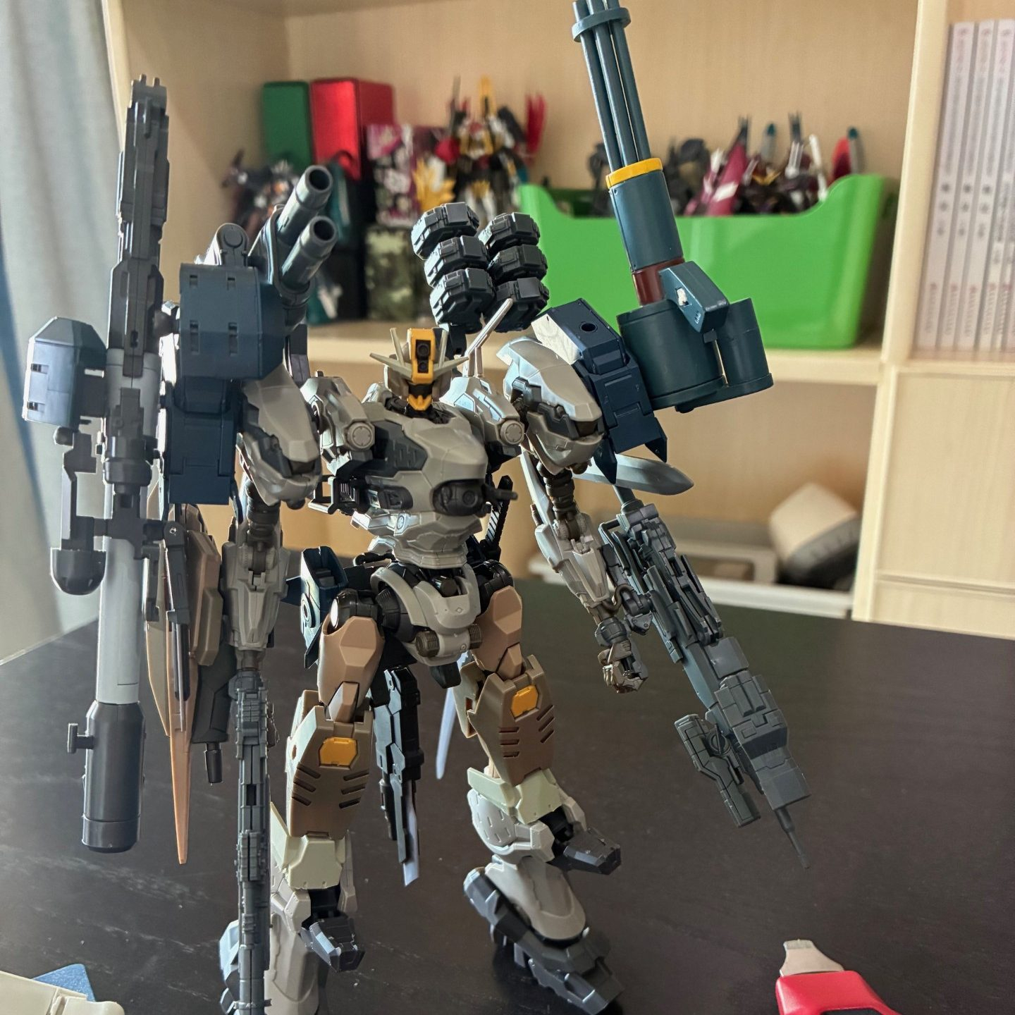 コマンドクオンタとアーマードコアナイトフォールプラスと確か境界戦機のキットと色々スペア武器でミキシングしました。苦戦した部分はコマンドクオンタのシールドの移植と足の連結。コマンドクオンタの顔が妙にナイトフォールの胴体と似合ってます。