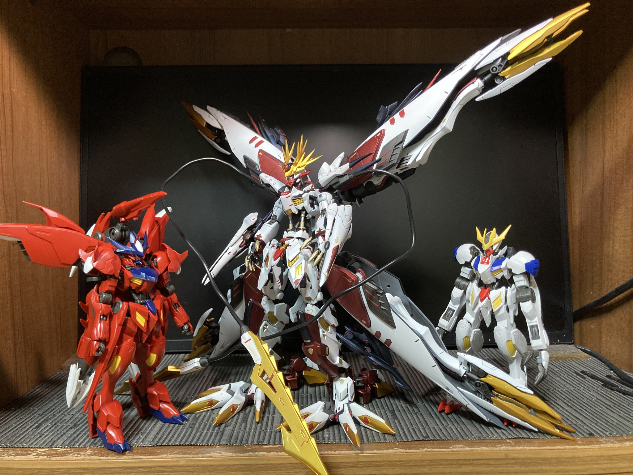 と、昔思ってはいたのですが、これを作ってる最中に風邪を引きまして、夜中咳でむせかえりながら八つ当たり気味なアイデアでこんな構図が浮かんだ、のですが今鉄血もレアキットなので見つけるのもお金もかかるか、とその夜中は諦めていたのですがその日の昼に妹が鉄血フェアなることをしてる模型店を出先で見つけて