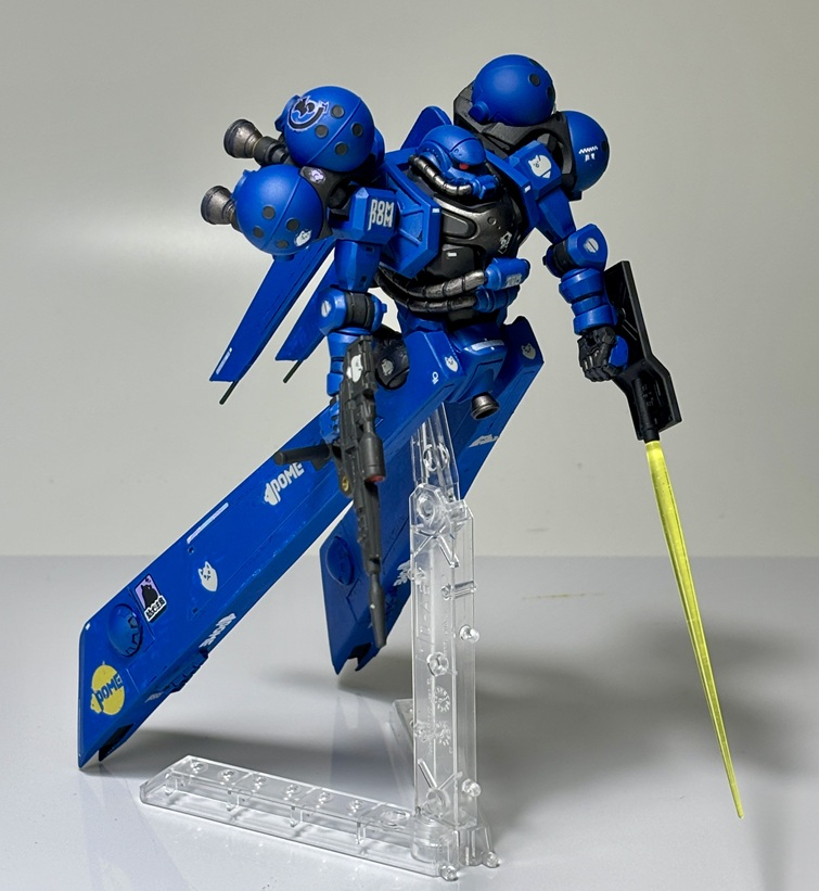 ジャンク屋で安く買った脚部が破損したザクとスペースシップの推進ユニットをドッキングして製作。軽キャノン用ビームライフルの払下げ品やビームサーベルを運用可能とするため、バックパックを増強してジェネレーターを強化した、といったところです。