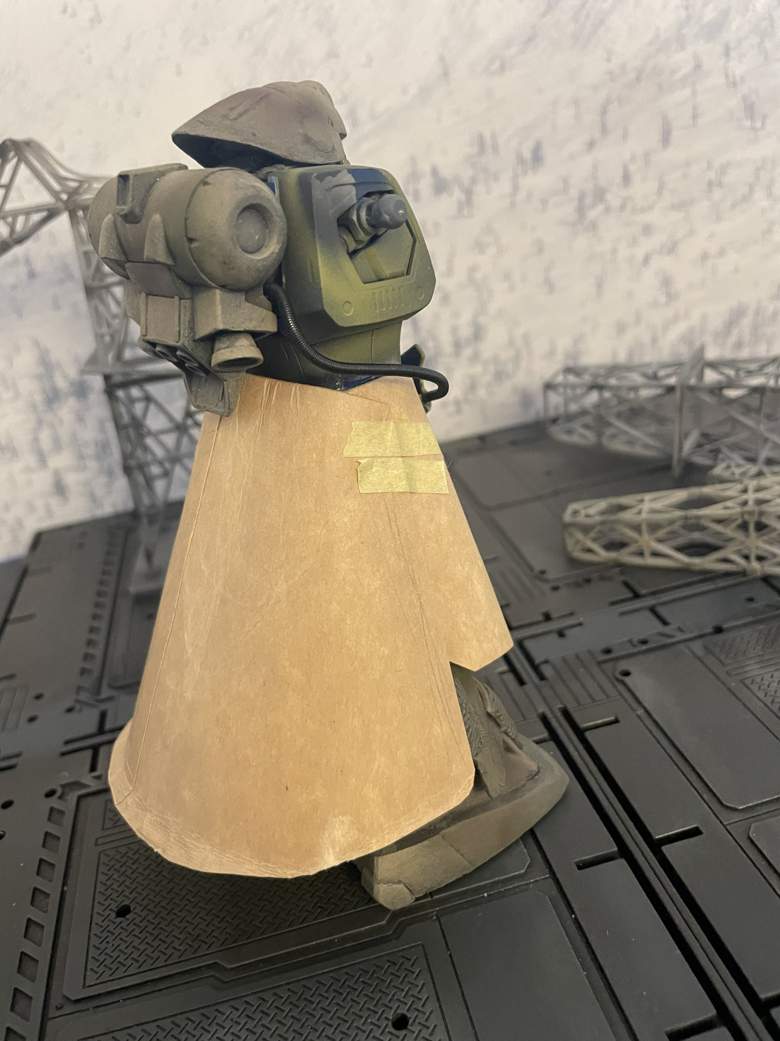 紙コップをばらしてオワン型スカートアーマーを製作しました。紙なので加工・微調整がしやすく(かつ塗料ののりもよい)おすすめの資材です。