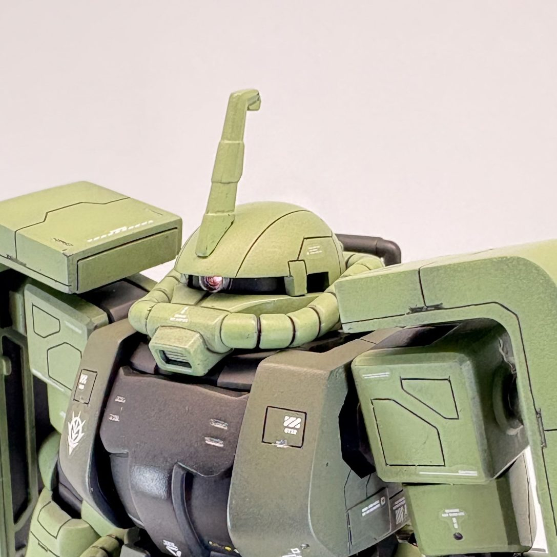 HGUC高機動型ザクをノーマルカラーで作成しました。主な工作は毎度変わり映えしませんが、全身のスジボリと水性ホビーカラーでエアブラシ全塗装、あとは手芸用ビーズでのディテールアップです。拙作ですが最後までご覧下さい。