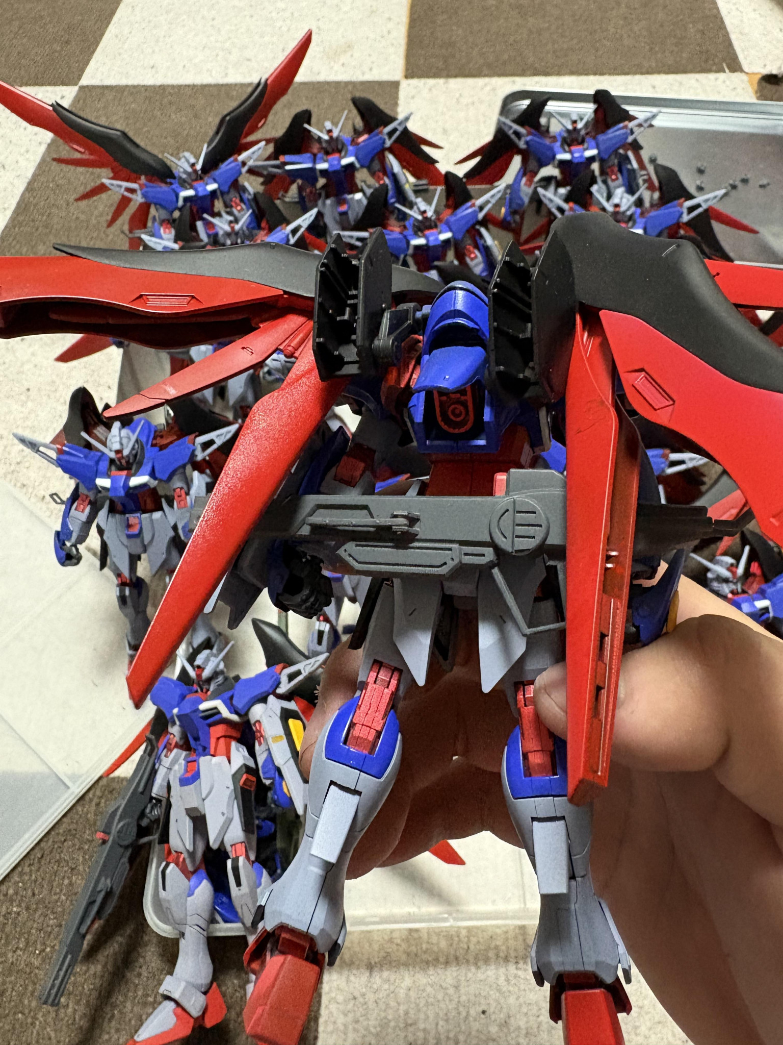 つっちー HG 2025.12/02更新 デスティニーガンダムSpec2 64 26 いいねしたモデラー(26) 0 0 作品を共有 デスティニーガンダムをSpec2カラーに全塗装しました。 分身はッ!こうやるんだぁぁぁーーッ!全部で22体塗装しました。(見えにくいですが全機レールガンを腰にマウントしてます)あまりにも数が多かったので展示会でないと全て並べられませんでした。ゲルググメナースのレールガンが長すぎるのでビームライフルサイズのレールガンを3DCADで設計し出力しました。マウントするとこんな感じ。レールガン持たせてパシャリ。地獄の始まりだ、覚悟はいいか?俺は出来ている。数の暴力。ひどい絵面。(一つだけガンダムヘリオスの頭混ざってるけど分かるかな?)おまけ(パーツ単位でのデスティニーとヘリオスの見分け方) 分身はッ!こうやるんだぁぁぁーーッ! コメント コメントをして応援しよう コメントにはログインが必要です つっちー 気ままに投稿します この作品をお薦め作品に設定する Please login to update your profile! Please login to update your profile! Please login to update your profile! Please login to update your profile!