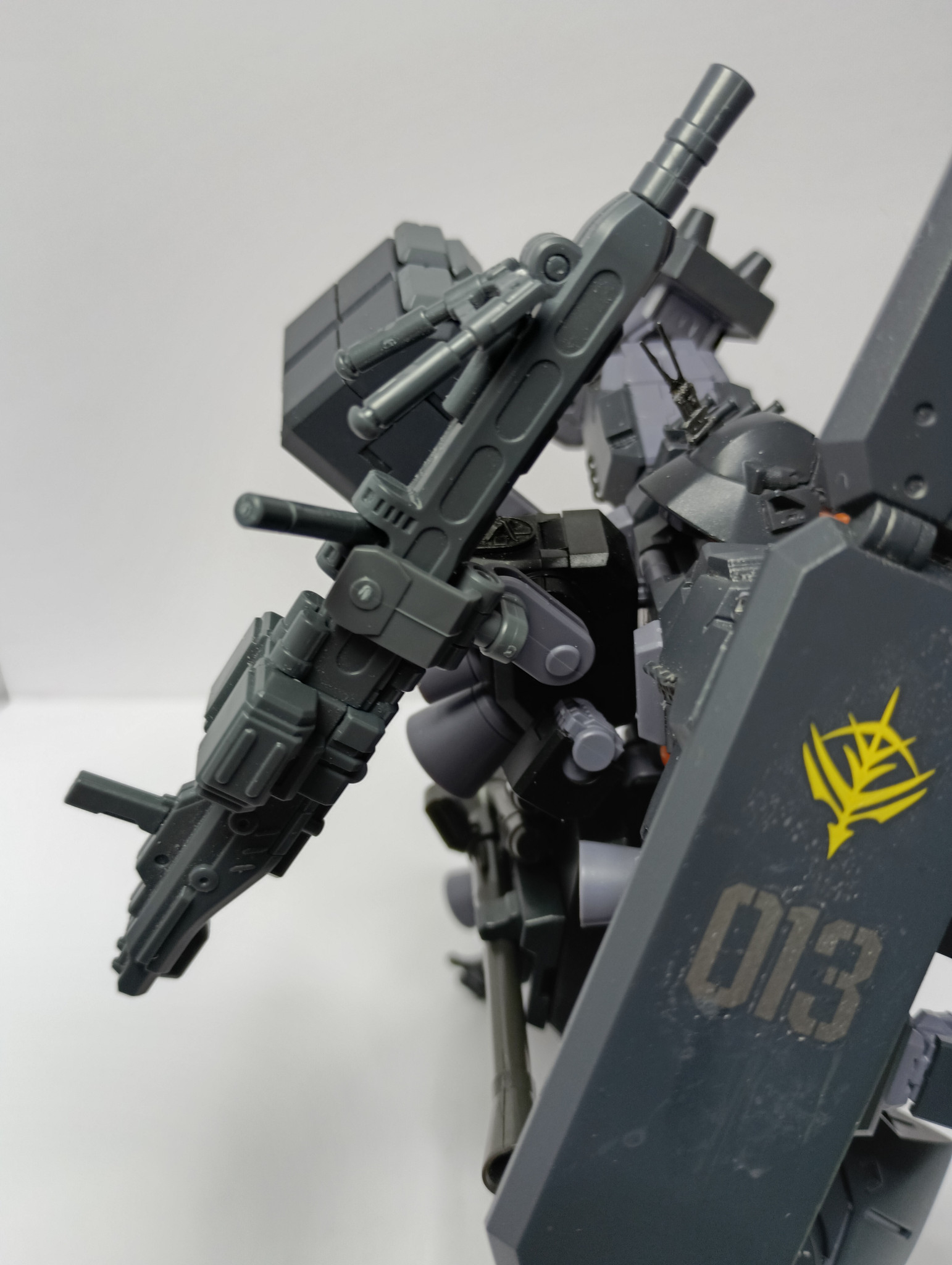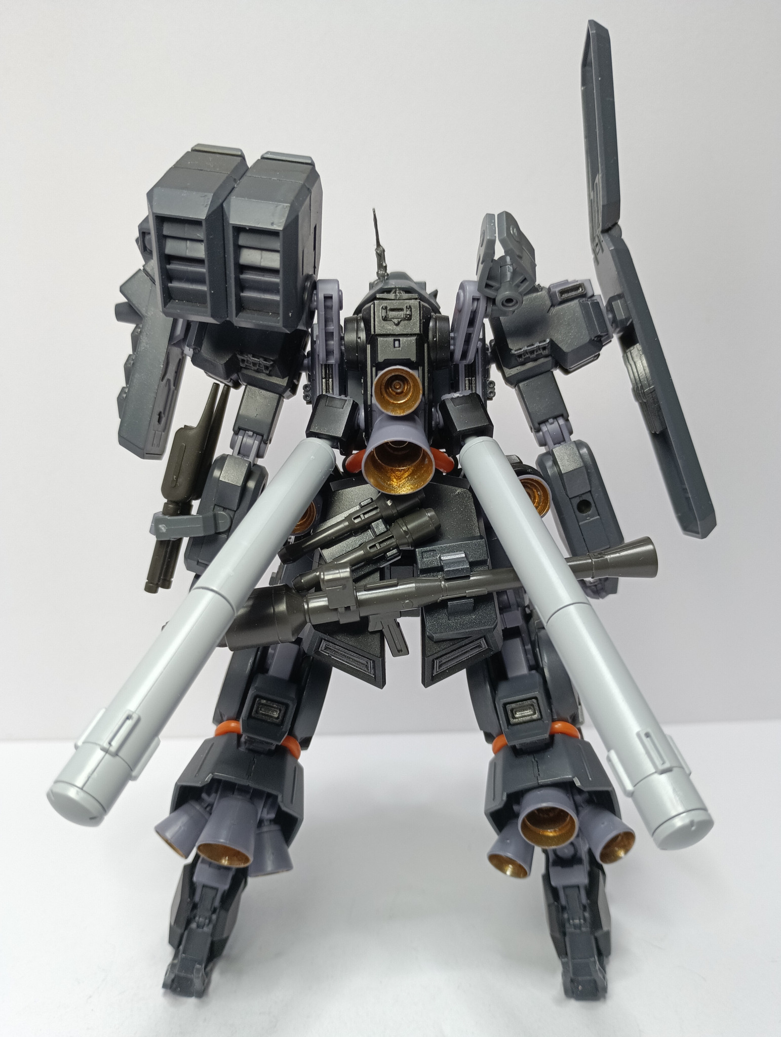 フル装備状態。左肩にシュツルムファウスト×4。右肩の盾裏にビームライフルの予備マガジンを装備しています。