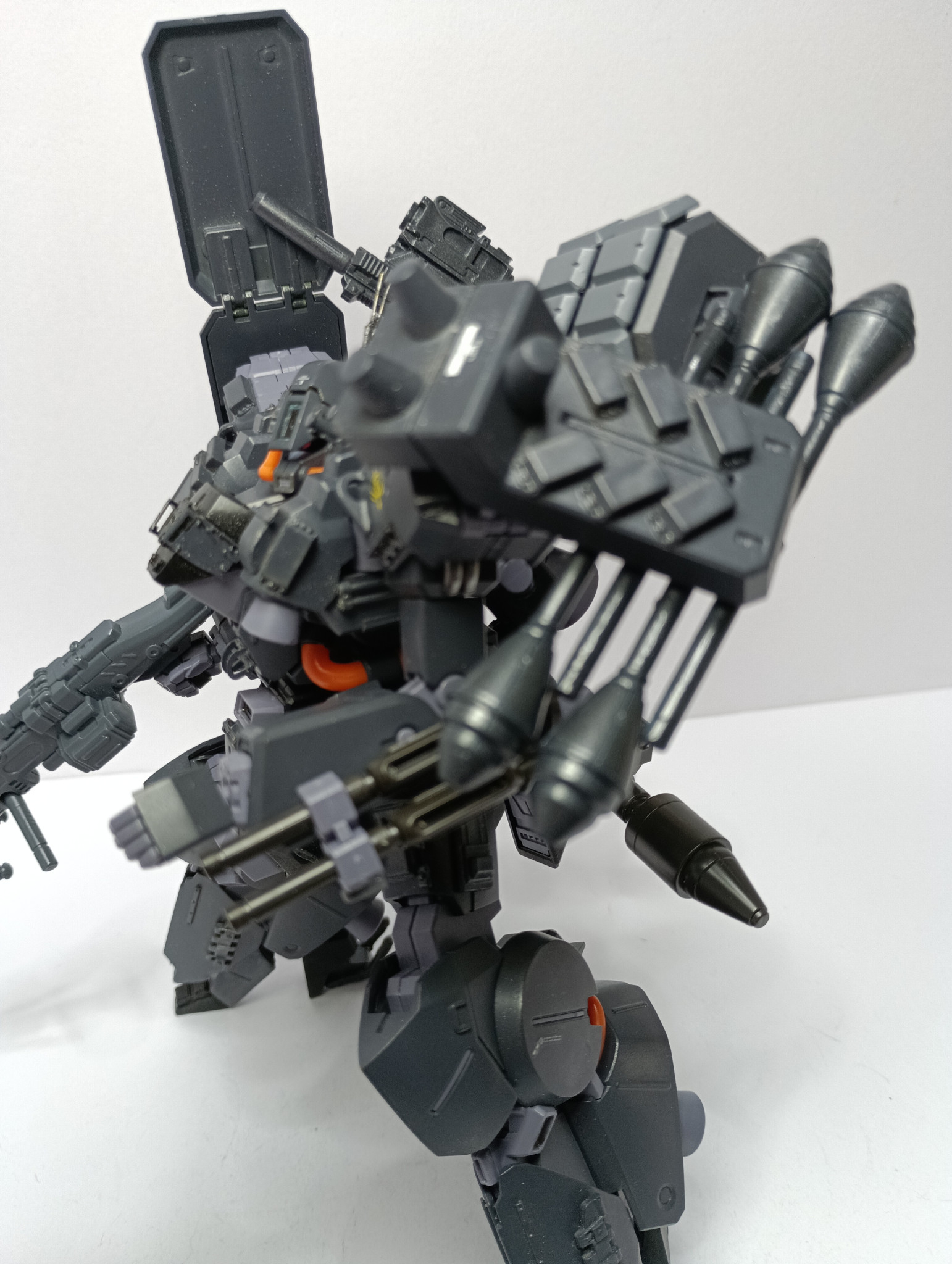 背部。ミサイルポッドは片側に寄せ、反対側に武器ラックを取り付け。あと、ギラズールのハンドグレネードとパンツァーファウストを装備しています。
