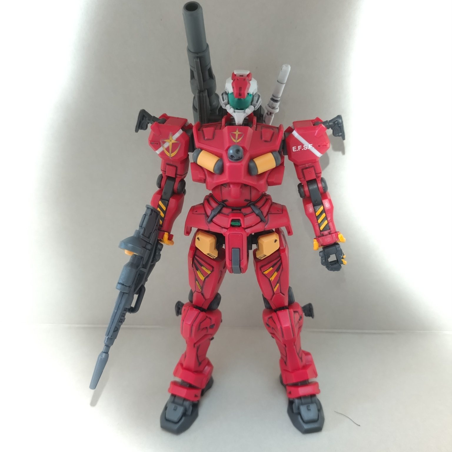 とりあえず…全身出来るだけスミ入れ、マーカーで部分塗装…一部メタリックシール貼って、あとは連邦軍のマーキングデカール貼って終わらせました。GQ世界において連邦軍の主力MS。正史宇宙世紀のRGM079ジムに当たる機体です。ただジムと異なりGQ世界でわシャアにガンダムを奪われたために仕方なくガンキャノンをベースに残存した01ガンダムのデータを組み合わされて完成された量産機。ガンダムと手足等は共通部分があります。強力なビームキャノンがあるため後方支援による射撃は敵MSとって脅威だったとおもいます…ルナチタニウム装甲にコアブロックシステム搭載…それにより高コスト化……。その分正史宇宙世紀のジムのように簡略化されてなかったので生産性は低下したため数を揃えられなかったか…また高機動戦でわ敵のガンダムをベースにした簡易量産型ジオンのゲルググに対してビームキャノンがあるため重量増加で近接格闘戦は不利になったんでないかとおもいます…また正史のアムロの戦闘データがなかった…。それでもソロモンでセイラ専用軽キャノンがビグ・ザムを撃破してるので性能は決して悪かった訳でわなかったとおもいますが…それでも結果ジオン公国に敗北してしまった悲しい結末になってます……。