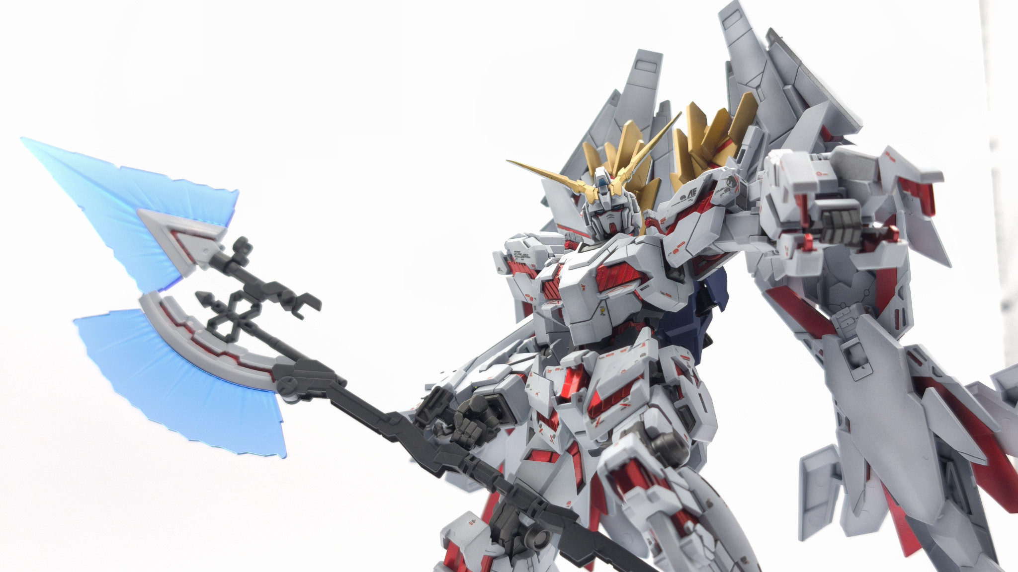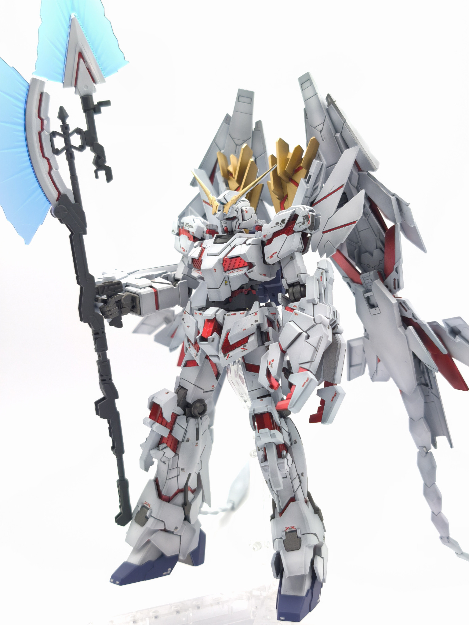 HG ユニコーンガンダムペルフェクティビリティを黒立ち上げ塗装+ガイアノーツさんのパールプレミアムレッドブリリアントを使用して塗装しました!青もいいけど個人的にユニコーンはやっぱり赤サイコフレームが好き。塗装は白部分はサーフェイサーevoブラックからホワイトにダークブルー少量足したものをグラデ風に2回塗っています。いい感じの重厚感になりました。サイコフレームはスターブライトアイアン→スターブライトシルバー(一部)→上記のレッドとすることで、グラデーションのあるサイコフレームとなっています。下地の透ける塗料は工夫しがいがあります。フレームはスターブライトアイアン、グレー部はメカサフスーパーヘヴィ、青部はティターンズカラー1、金色はexゴールドと赤白以外は低燃費ですw。デカールはrgユニコーン用を使っています。スジボリやプラバンのディティールアップもしましたが、一番力の入れた塗装がいい感じで満足です。