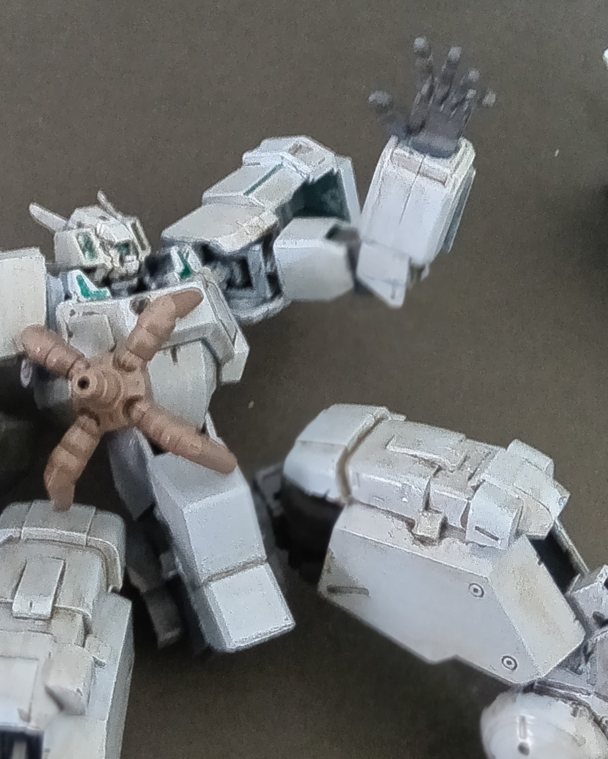 使用した塗料はタミヤの呉海軍工廠グレイにホワイトとブルーを混ぜた自作グレイ。間接部や武装は同じくタミヤのジャーマングレイです。塗装後トップコートの半光沢を吹いてスミ入れ塗料で軽く汚しました。