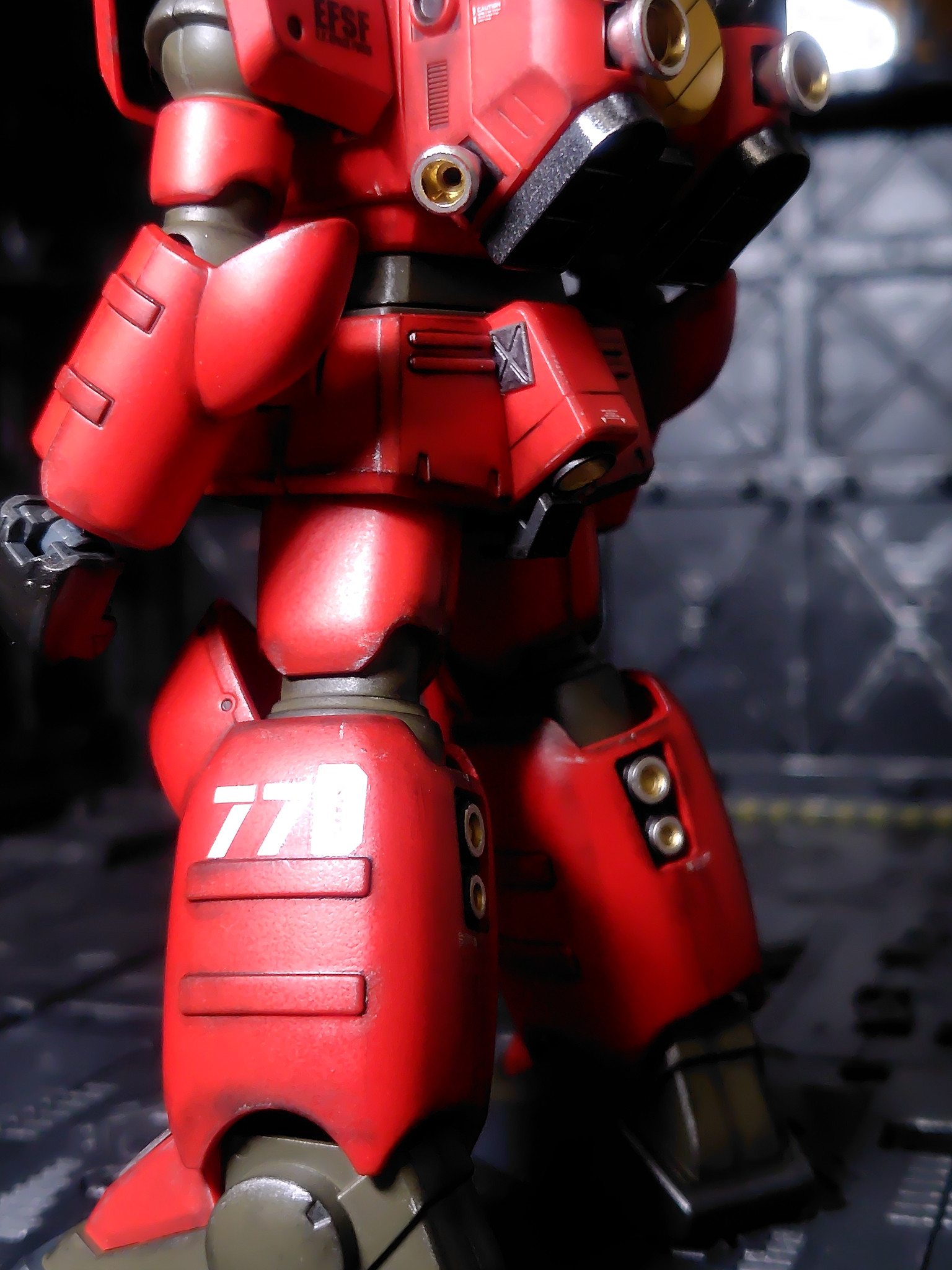 実は腰、腿、二の腕、足の甲は成形色のままで、他の赤は合わせ目消しのためモンザレッドでスプレー塗装しています。もっとツートンカラーっぽくなるイメージだったんですが全然違いが無い(zaku-kao4)