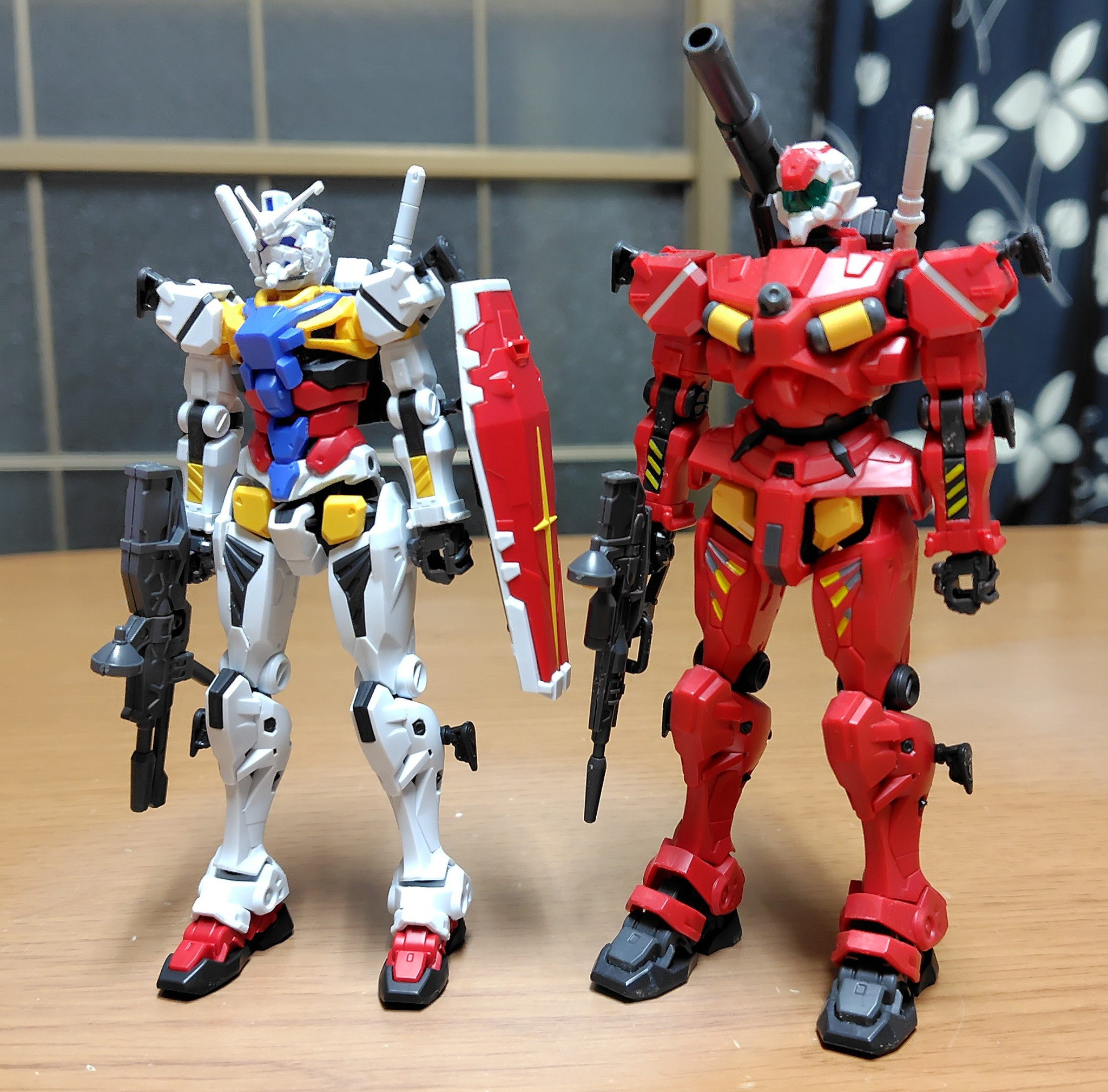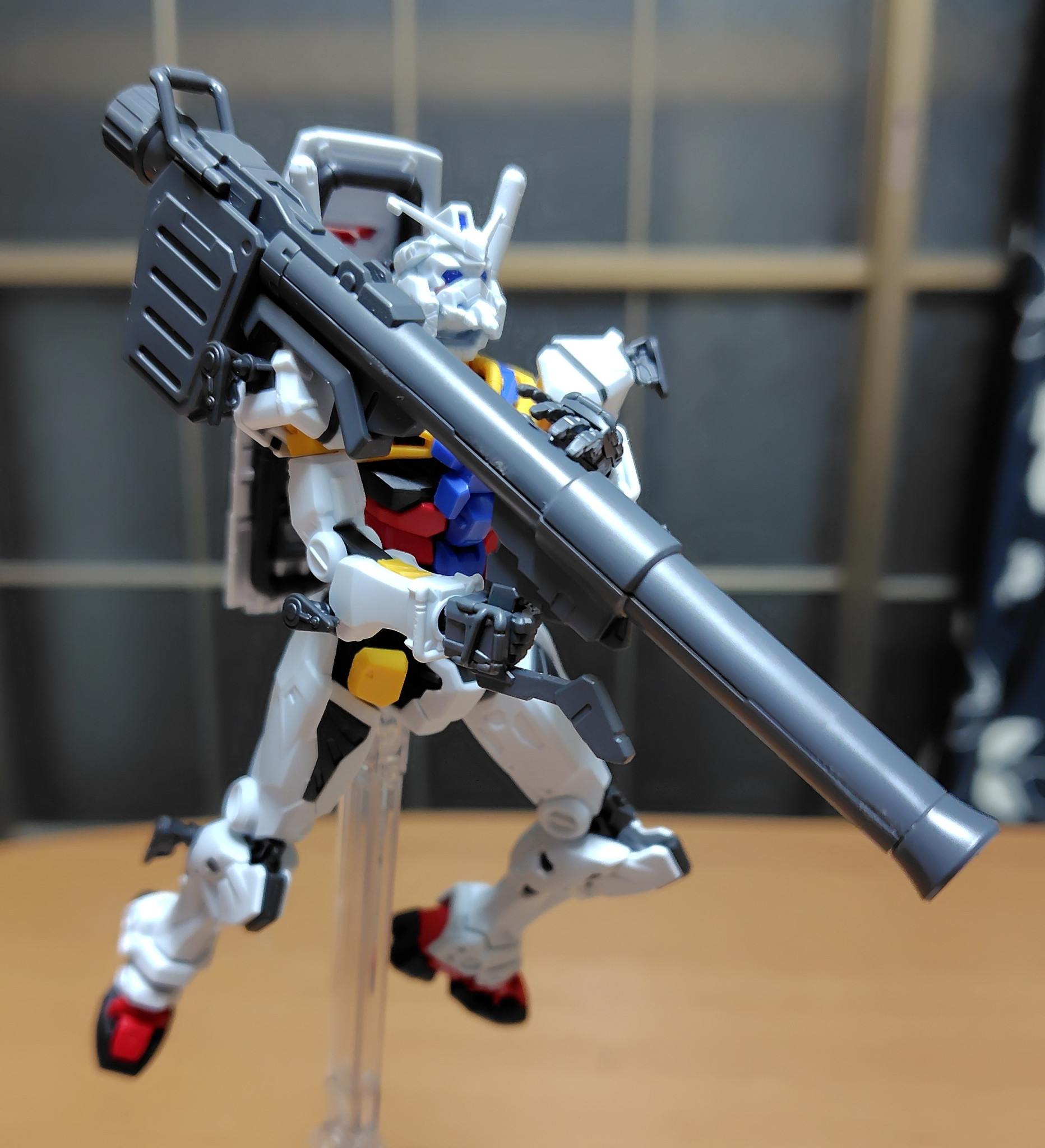 V作戦の兄弟機。量産化された軽キャノンの並べて。頭身もライフルもまるで違う他、流用されたという四肢も太い等差があります。