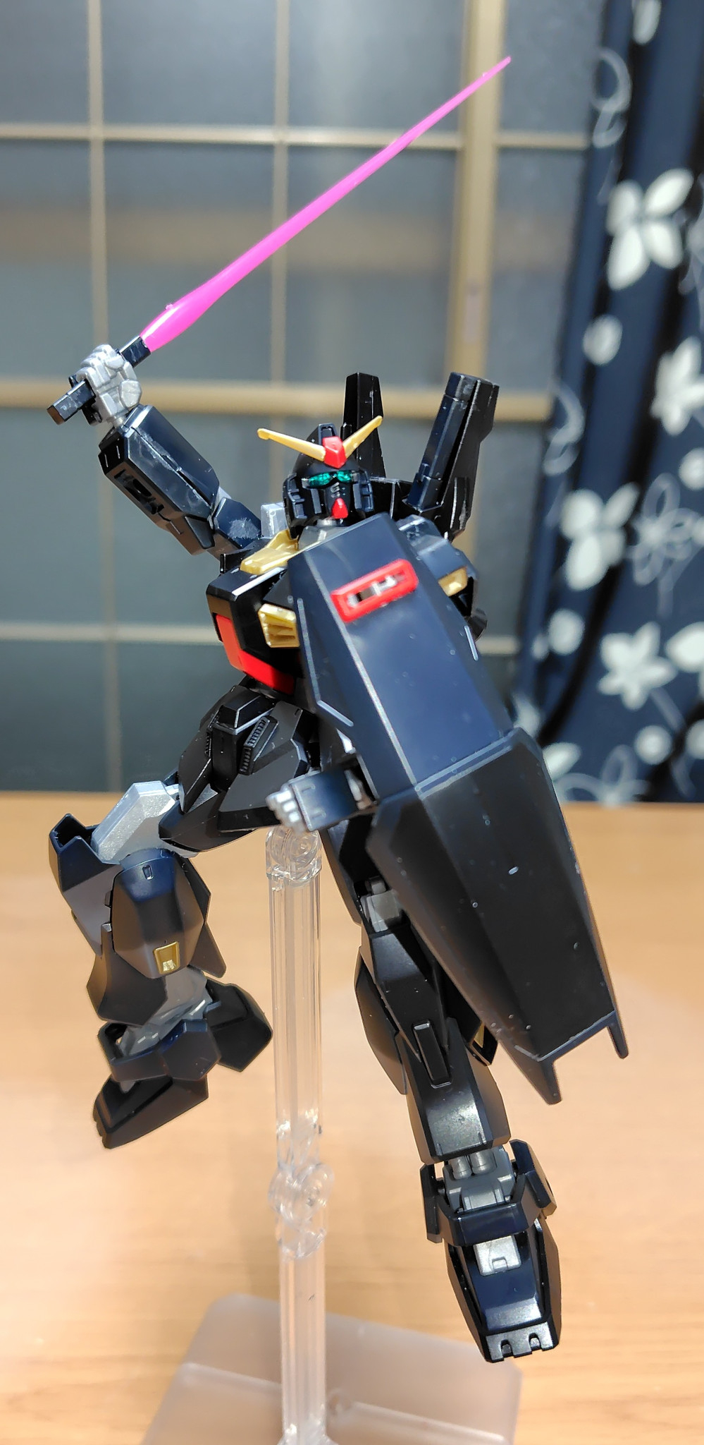 フル装備でのフロント。ベース限定だとティターンズブルー1と2で胴体と四肢に差が有るが、この限定品は全身光沢感の黒一色!更に武器もメタリック成形色の物に替えました。