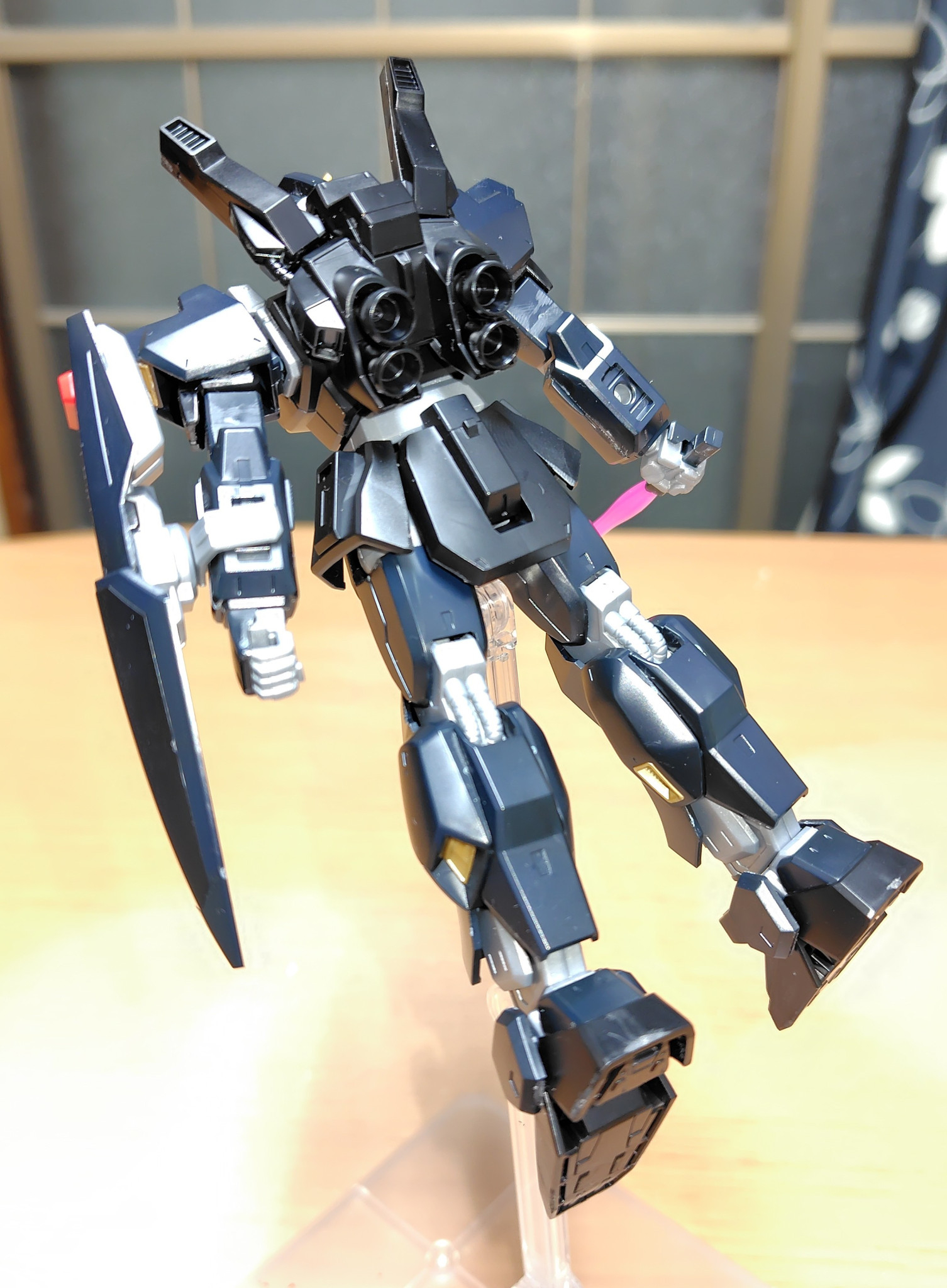 飛行してのリア。バックパックは下部に2対4発スラスター、上部にサーベルラック懸架出来る可動スラスター計6発で細かい機動が可能となるようです。