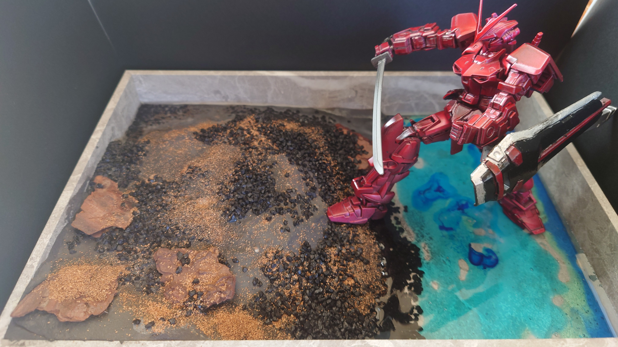全体図です。ジオラマ作成は相変わらず楽しい。水面はレジン3色に水用ジェルを使用しました。
