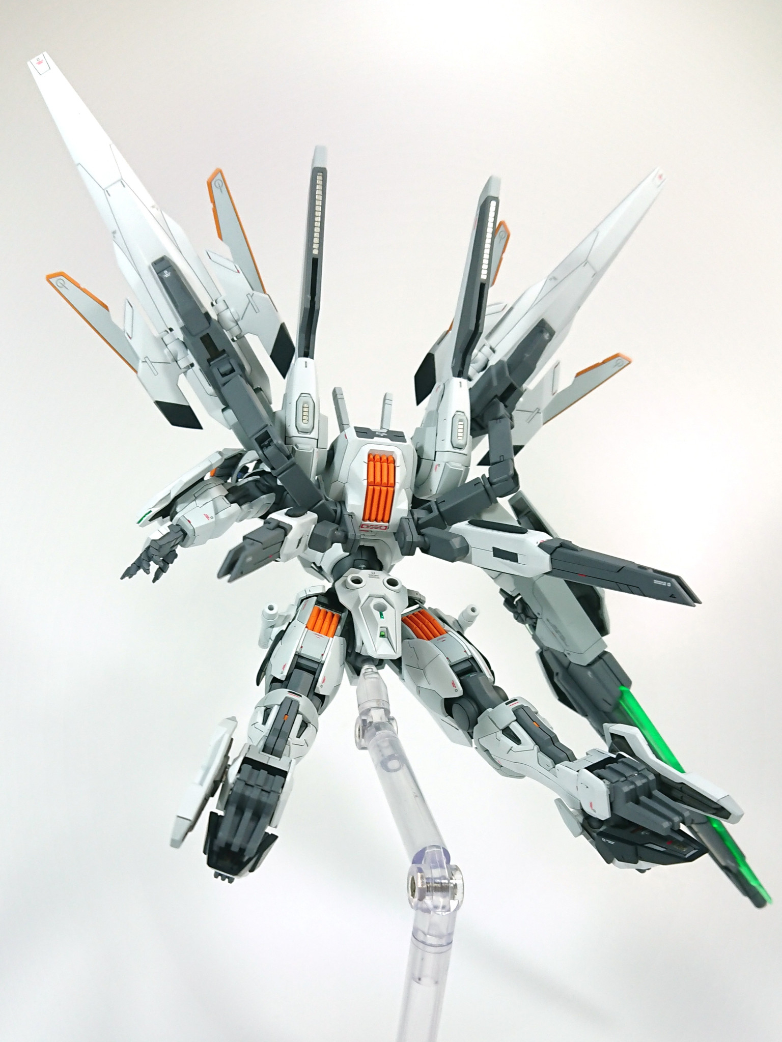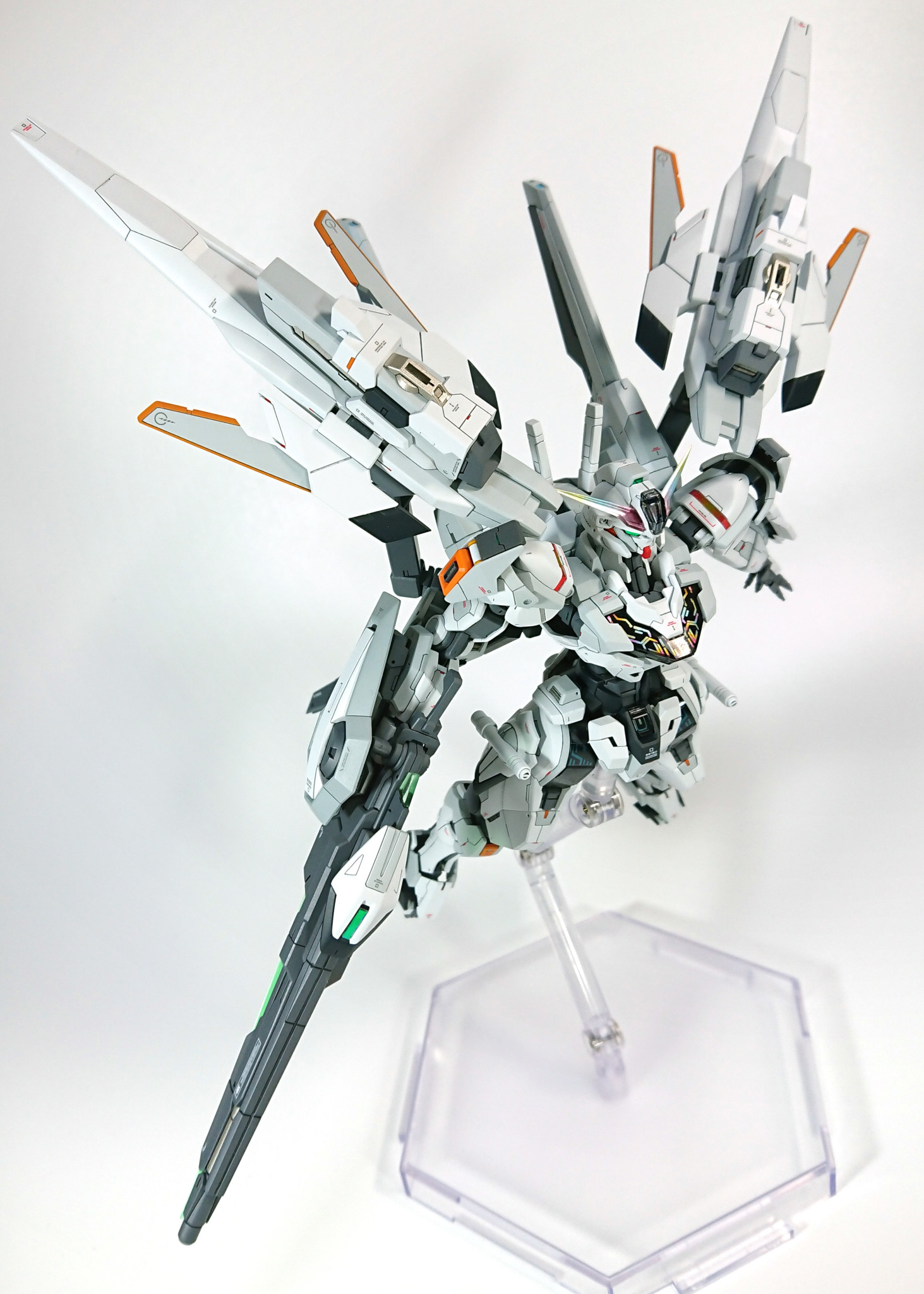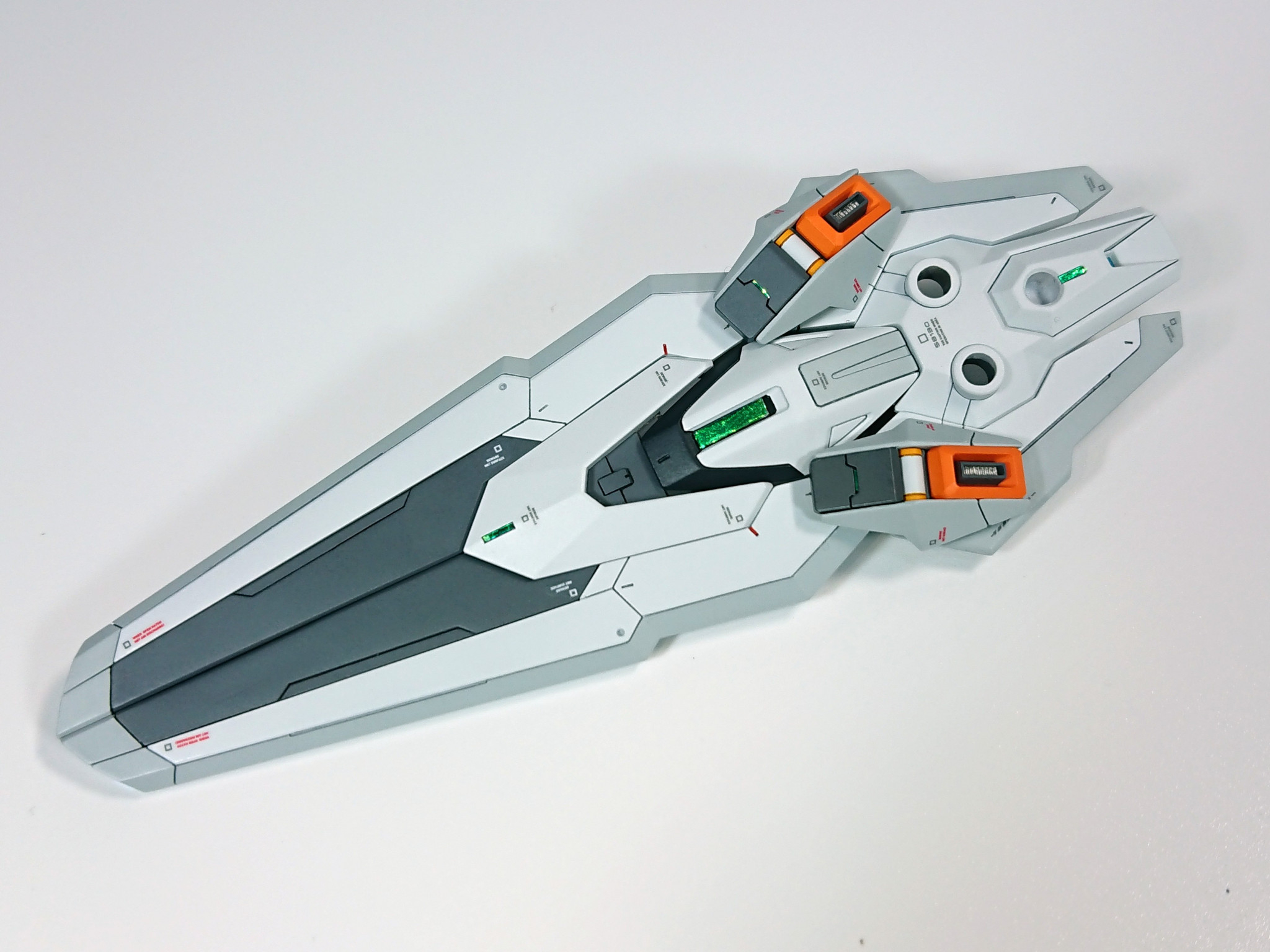 バックパックは左右下部に3mm穴を開けて自作ジョイントを介してパワードアームズパワーダーのアームでオーライザーのバインダー、ユニバースブースターのビーム砲を追加。バインダーにはセラヴィーのバズーカを短くしてプラ板とジャンクパーツでデコレーションしたものを接続。