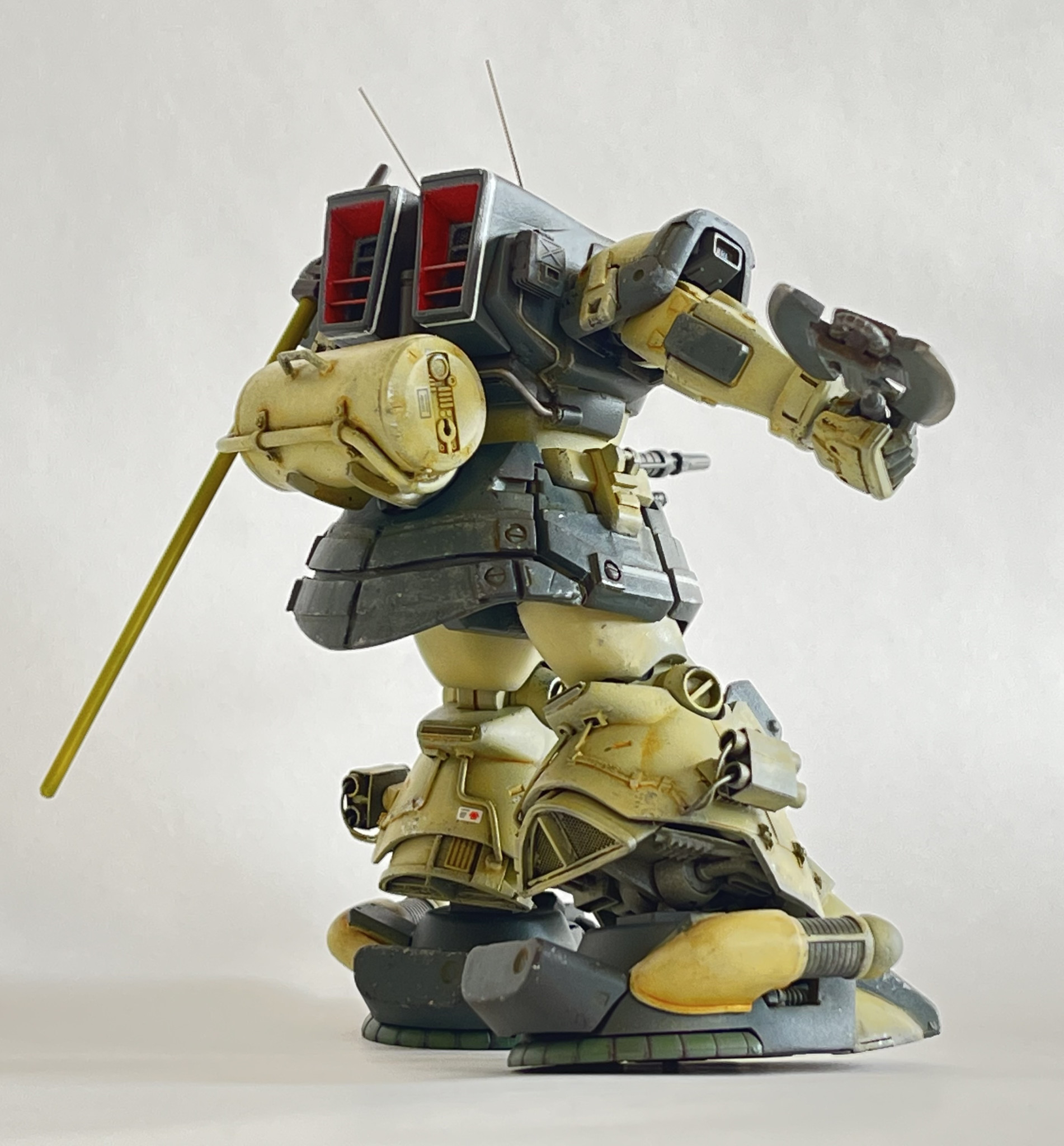 ジオン残党軍をイメージして、露出配管や配線を這わせ現地調達のジャンクパーツでなんとかやり繰りしてる感じやロートル感を出してみたつもりです。両脚の側面に付けているはアクティブ防衛システム(APS)です。散弾を発射し飛来するミサイルやビームを迎撃します。レクイエムではソラリザクがジムのビームを無力化してました。