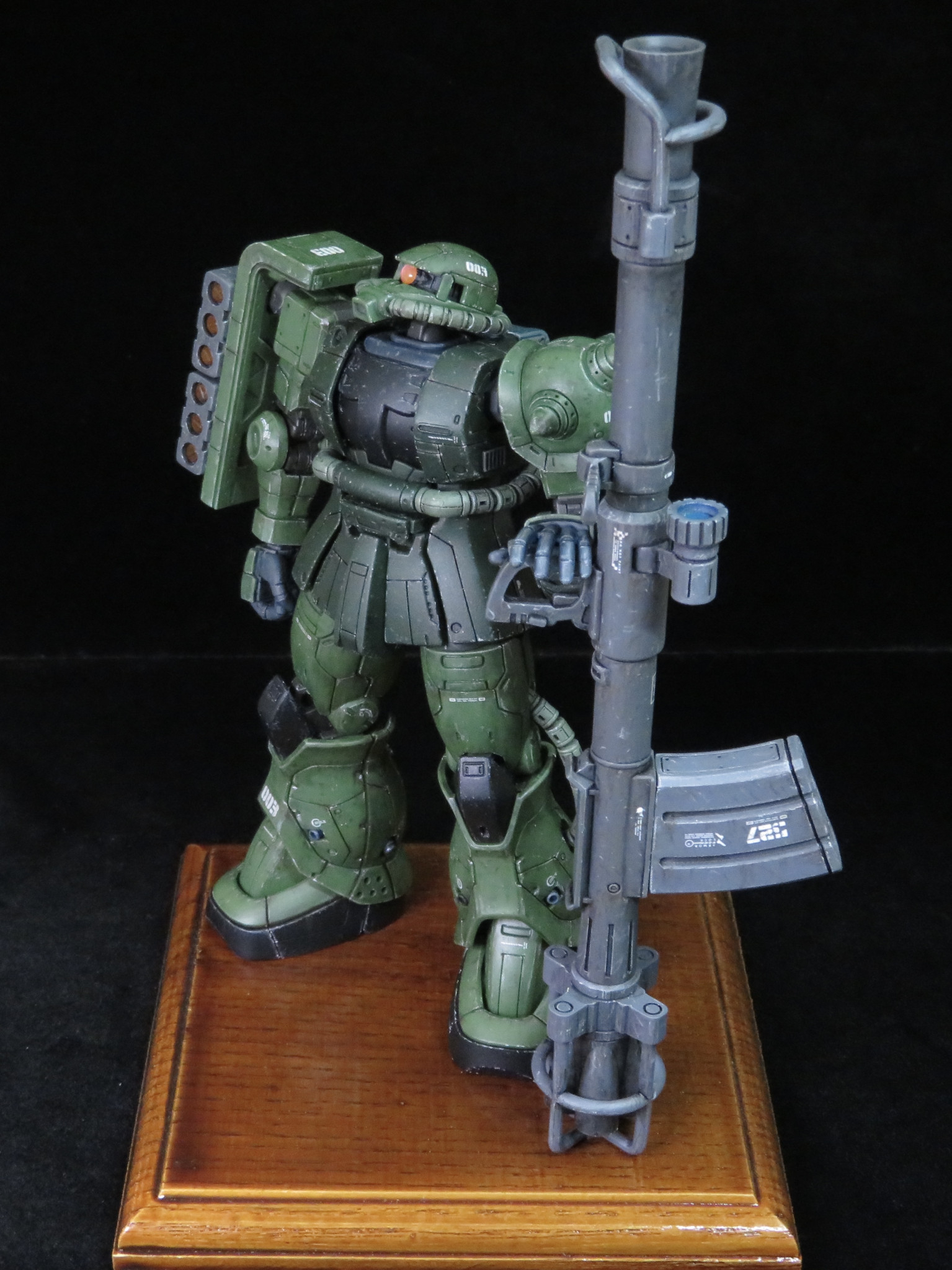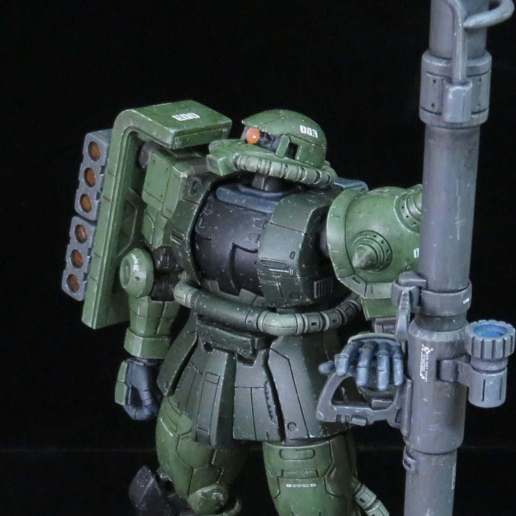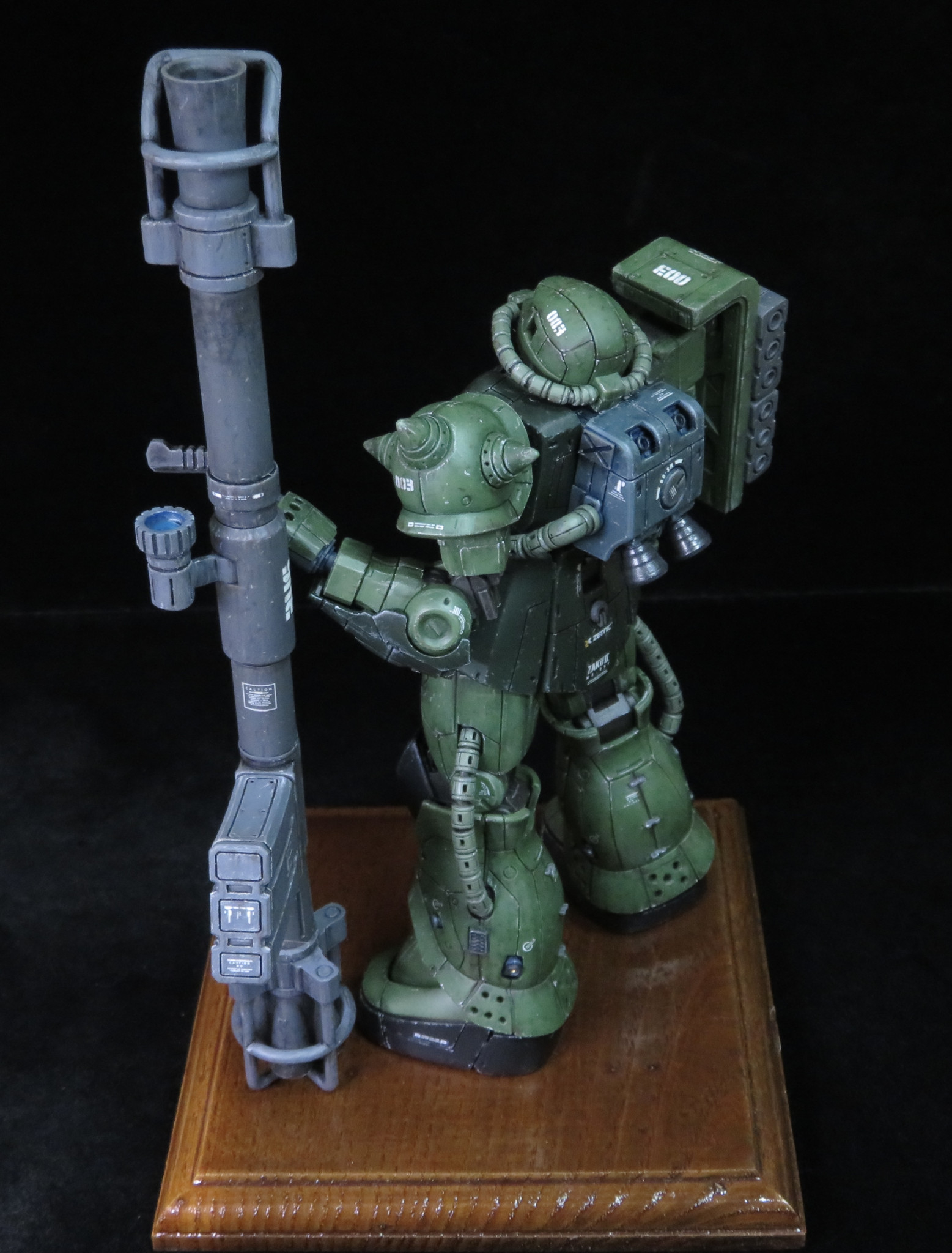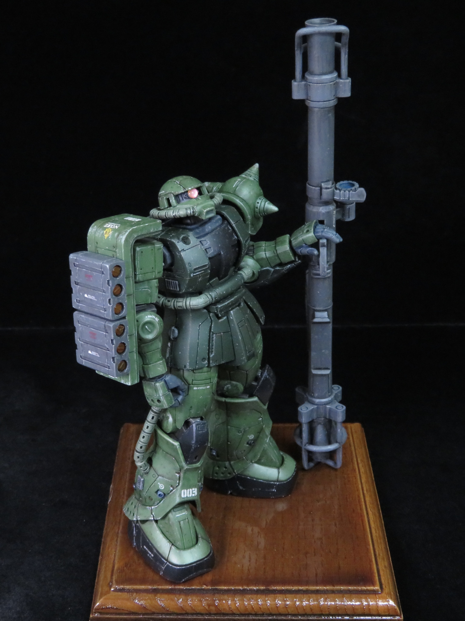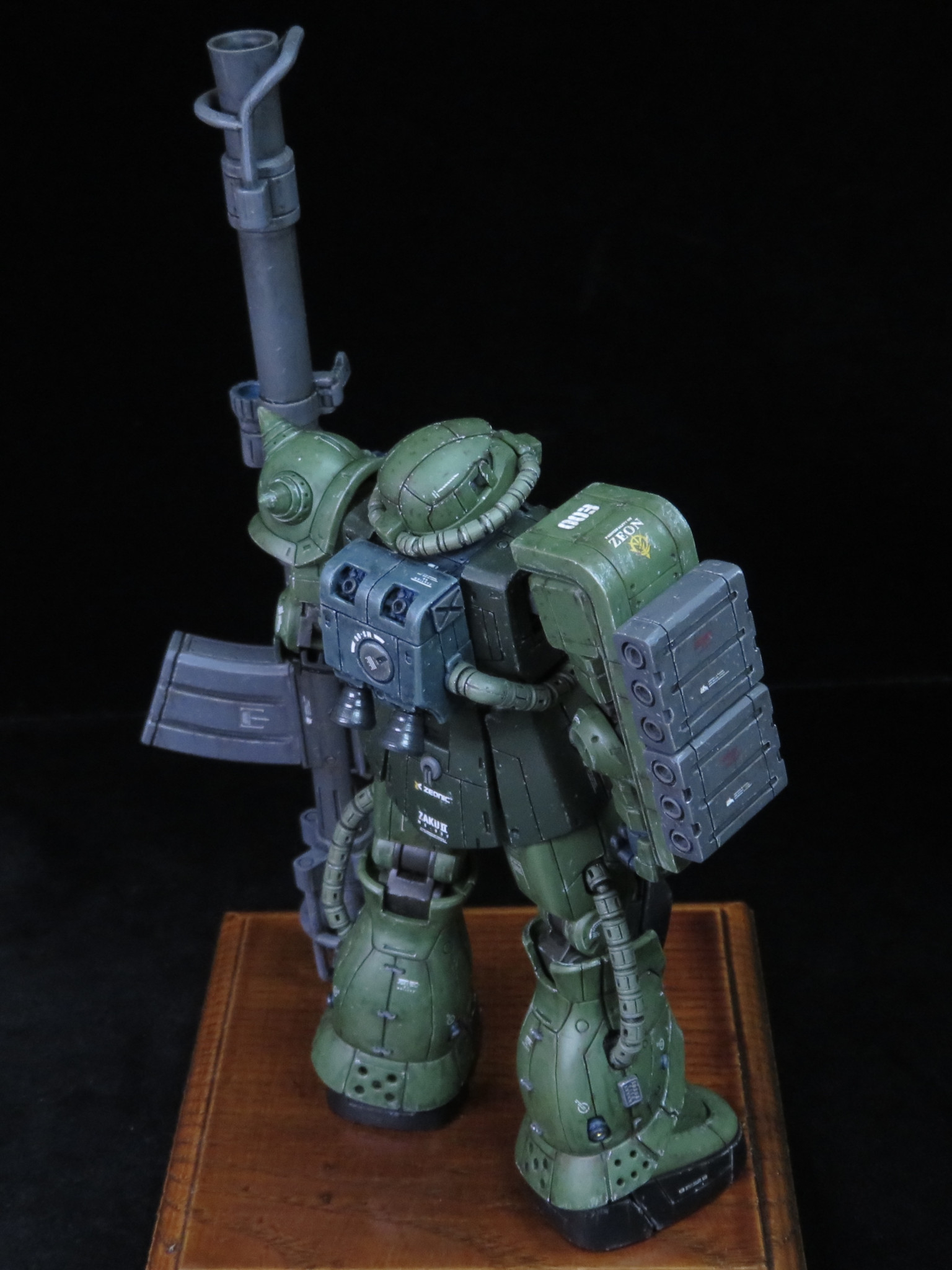 HGオリジンザクを筋彫り、フィルタリングとウェザリングして、改造パーツの一部に3Dプリント品を使っています。