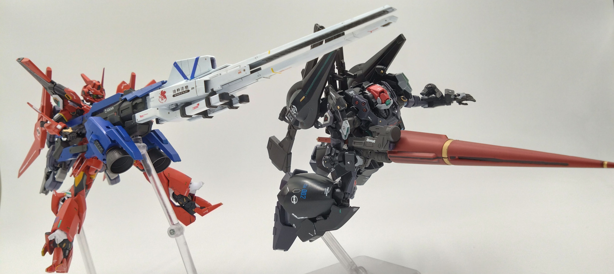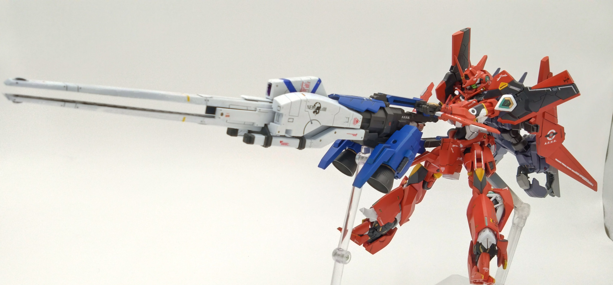 最近でたプレバンRGハイニューガンダムメガバズーカランチャーとコトブキヤメタルギアレックスのレールガンを漢の接続でWカラーリングは前身はエヴァのポジトロンライフルカラーに後身は百式メガバズーカカラーに分けて塗装しました!