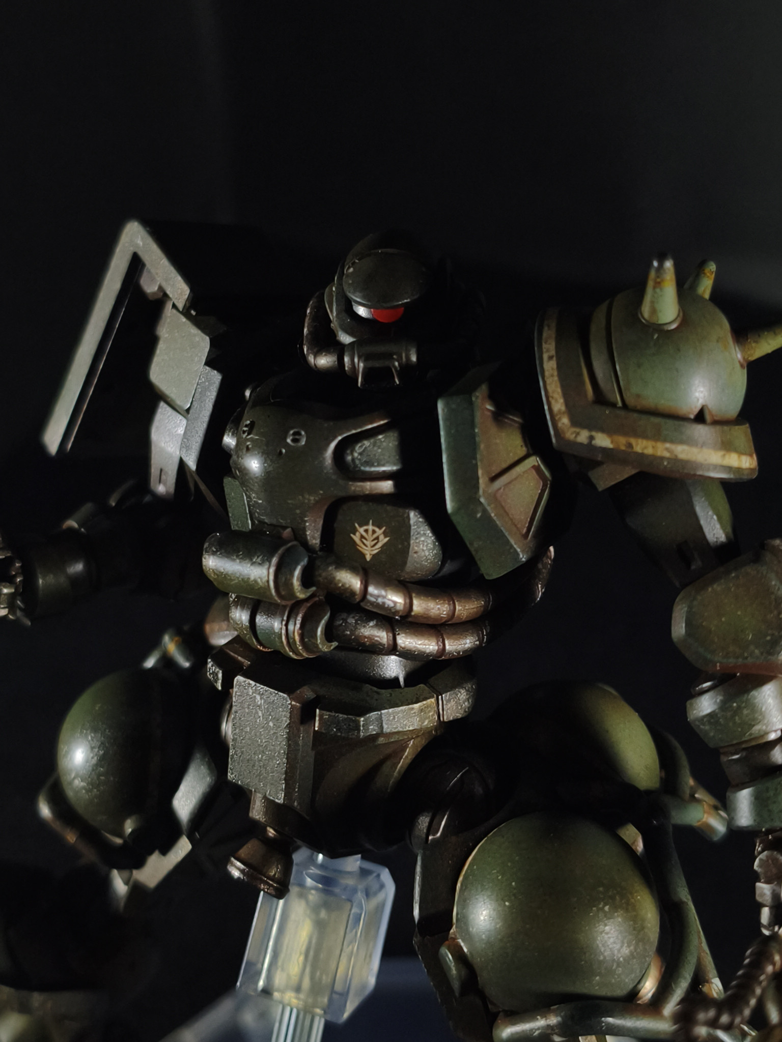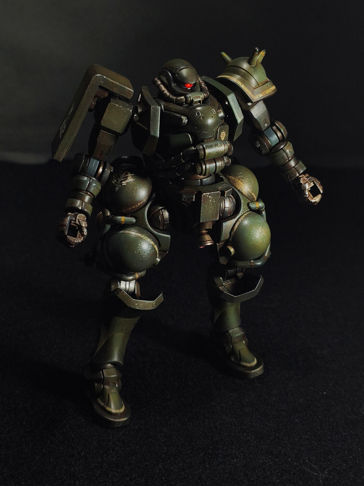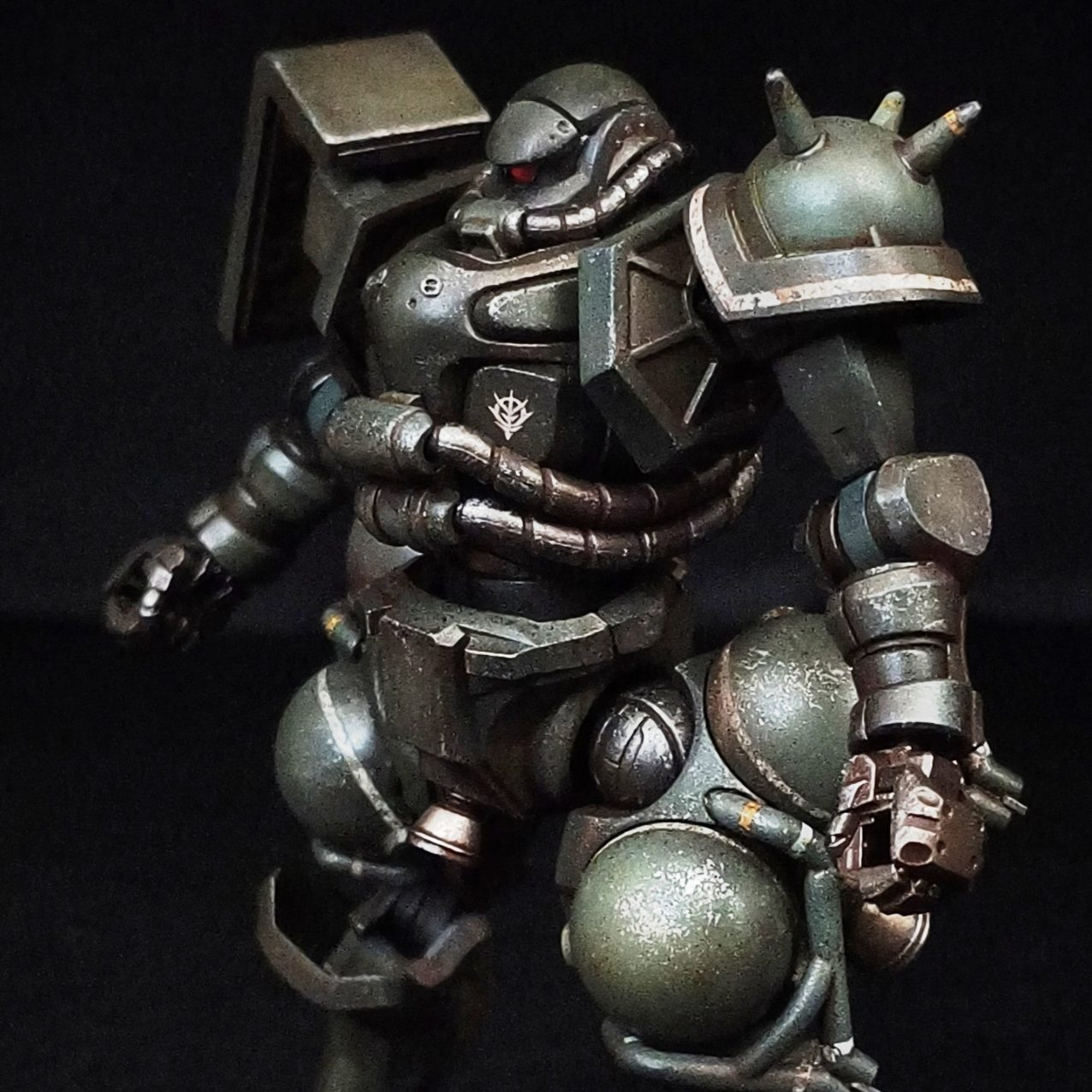 黒立ち上げからのグラデーション塗装→ウェザリングカラーでウォッシング→ウェザリングマスターで錆や煤汚れの表現→エナメルのシルバーとガンメタルでチッピング→ガンダムマーカーで細かい汚れを表現しました。