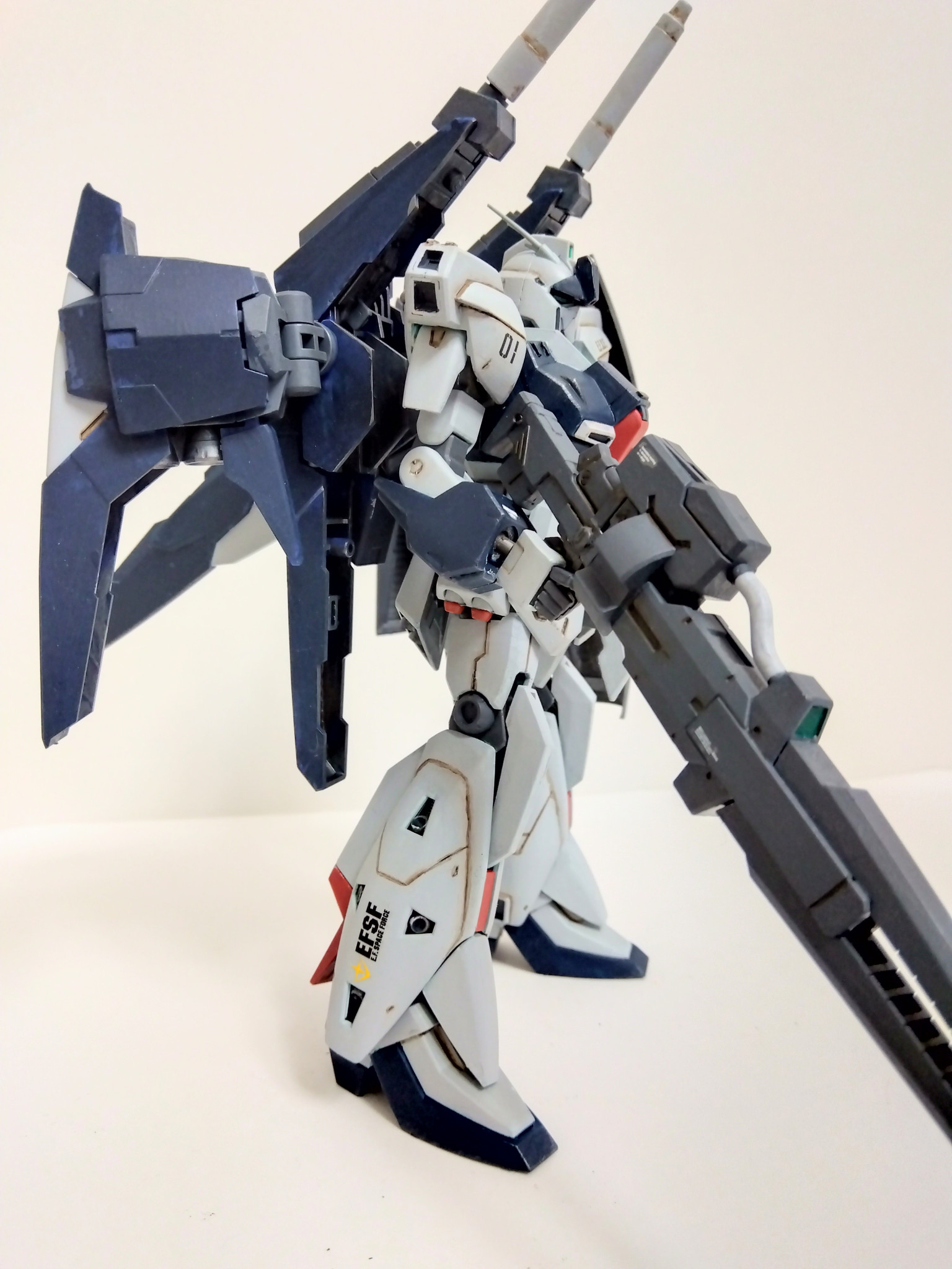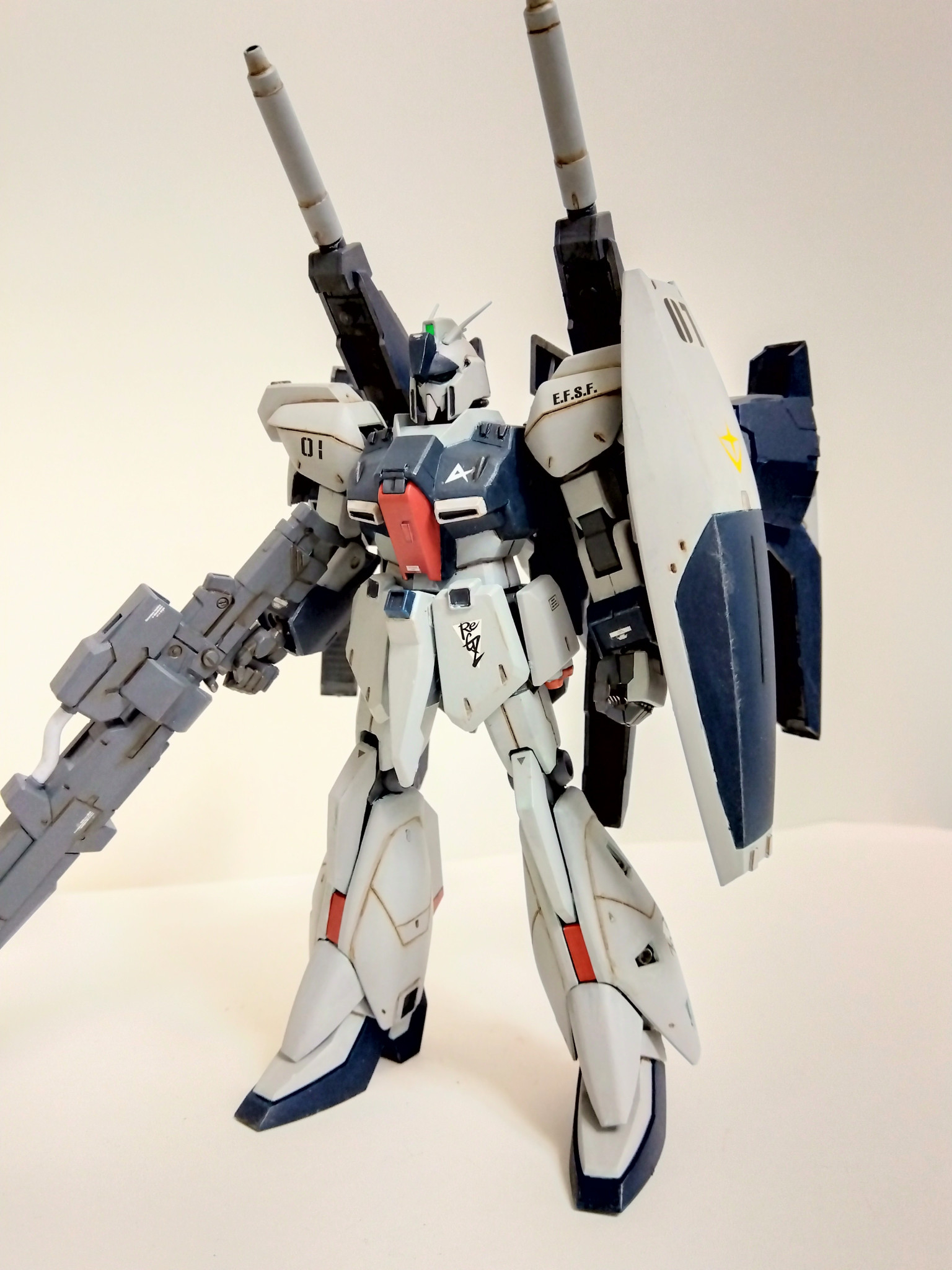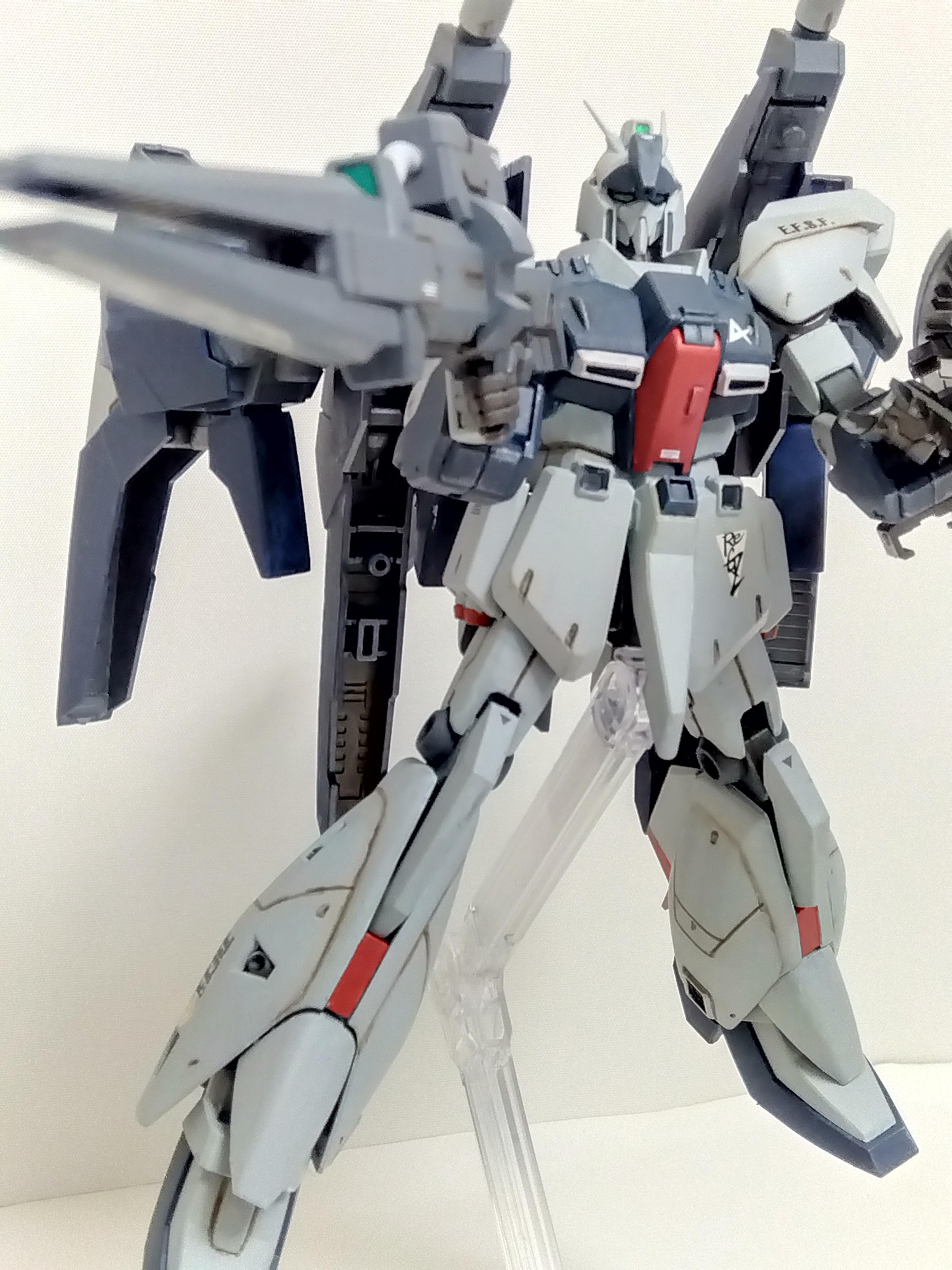 リ・ガズィ本体はプラ板でディテールアップしたぐらいでほぼそのまま、ビームライフルはリ・ガズィのライフルを半分にしてバックウェポンシステムMark−Ⅱの武器を貼り付けました。