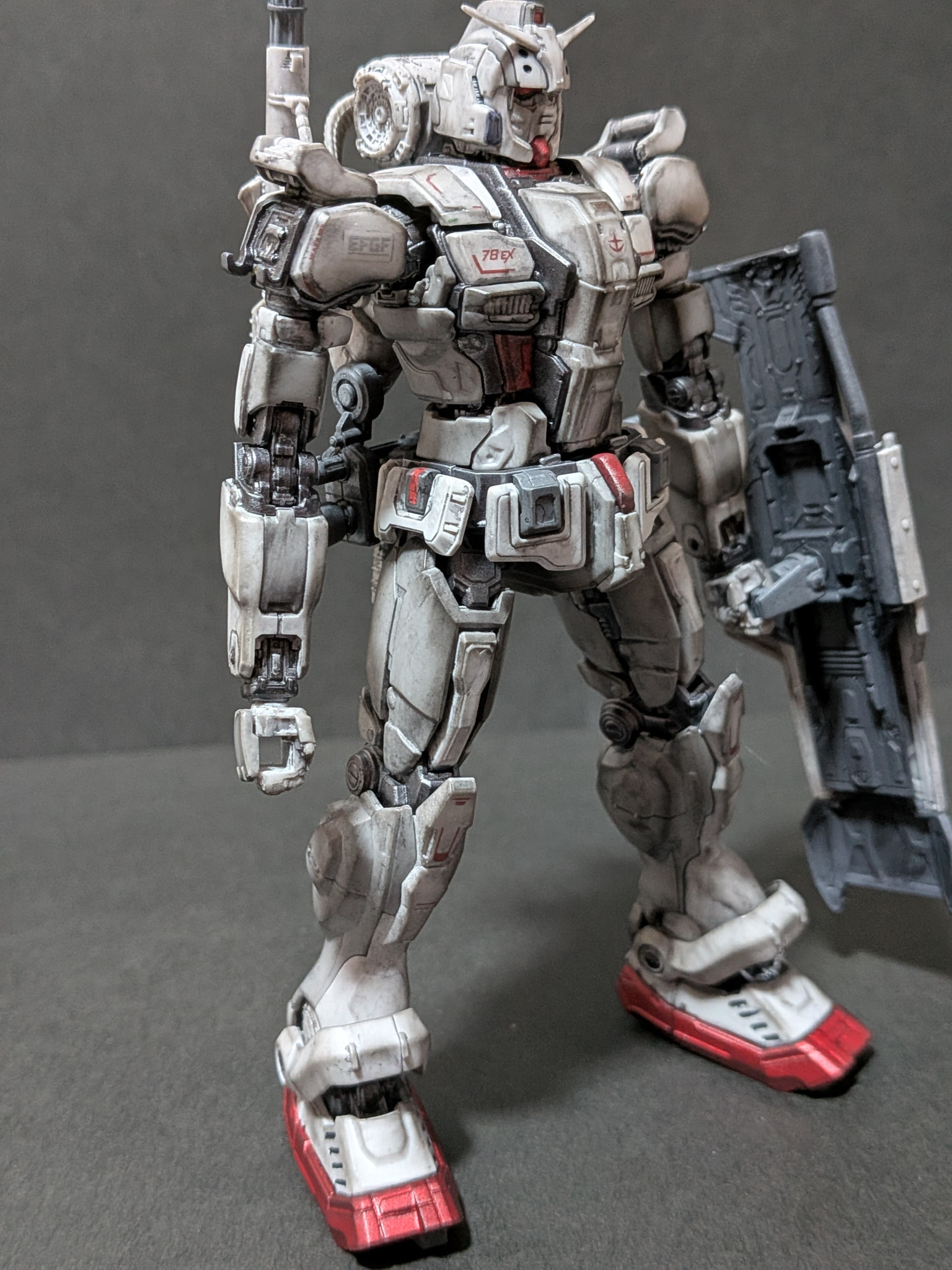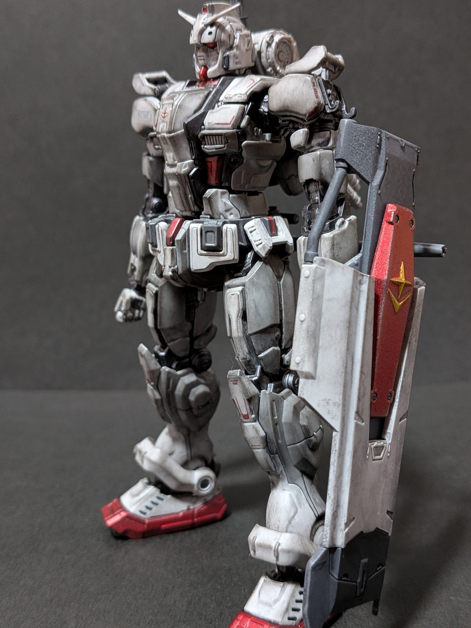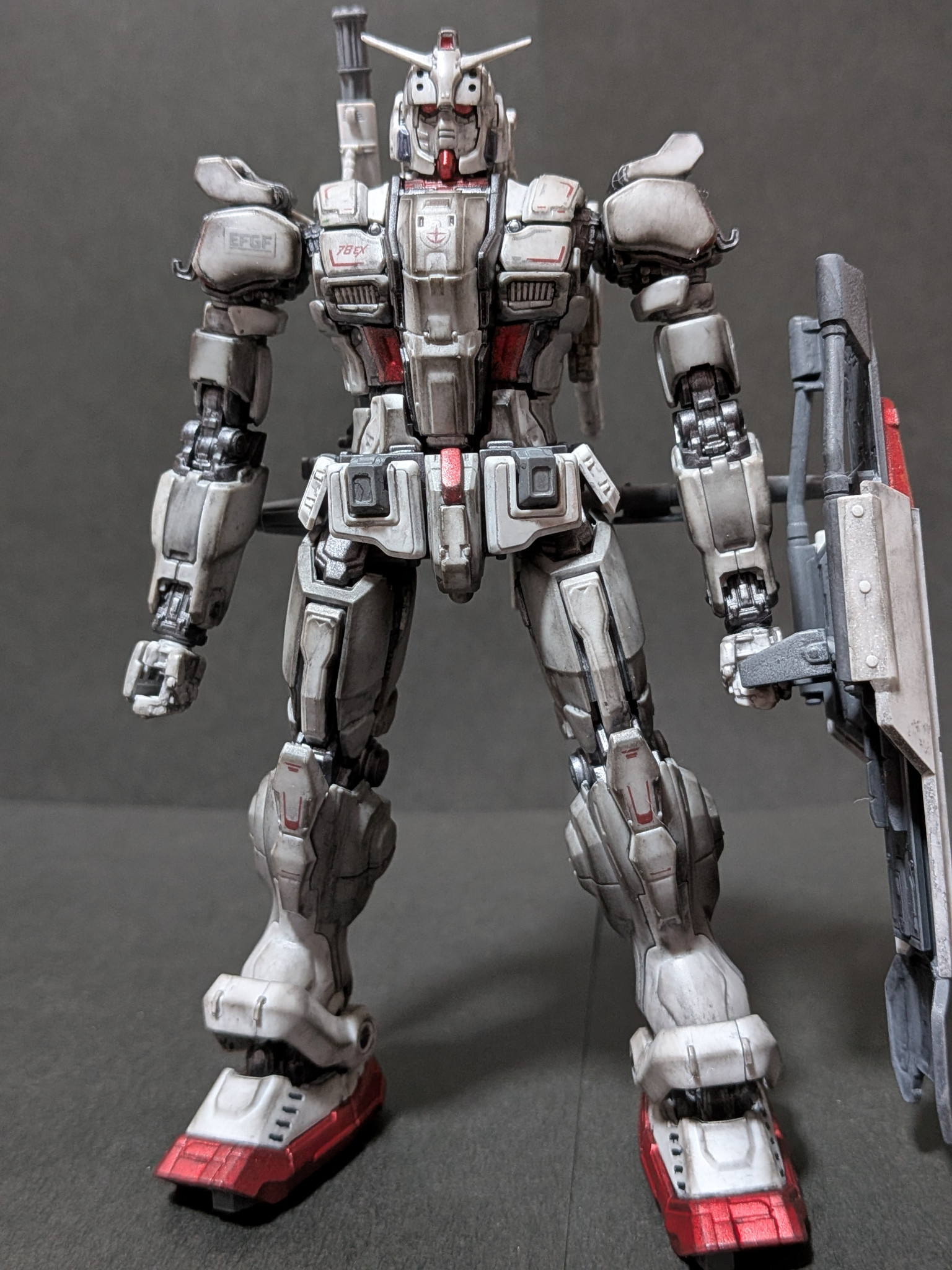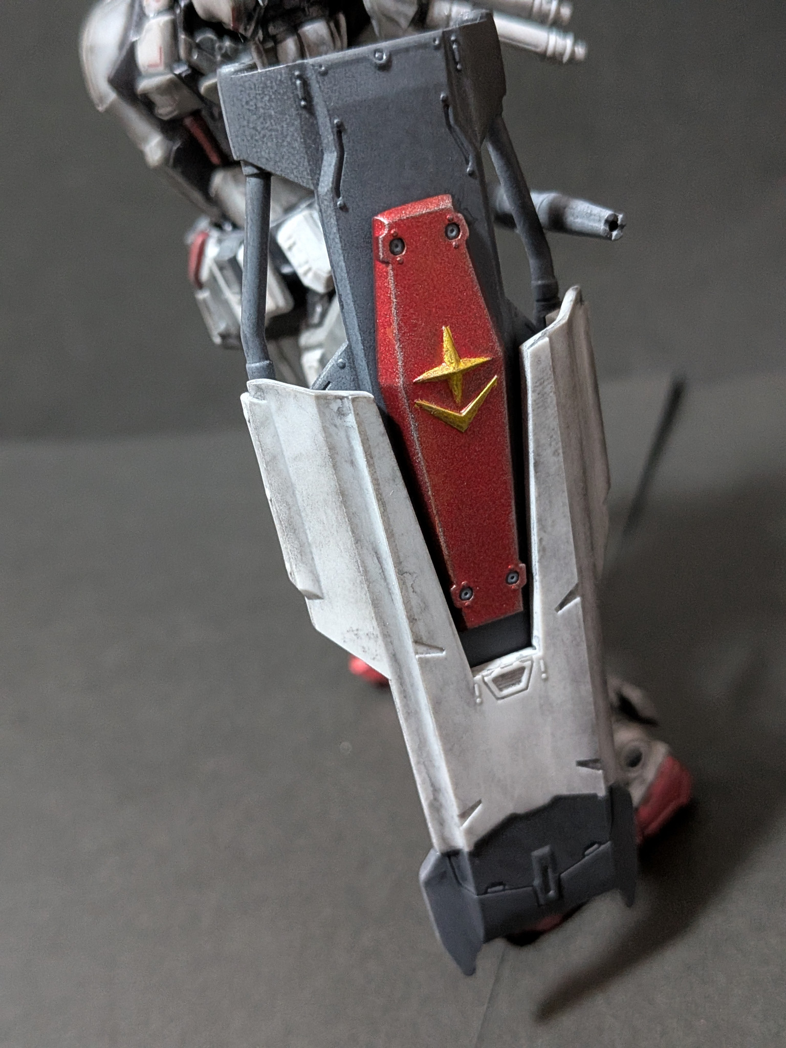 塗装はメタリックレッド(スリッパパーツ等)、ジャーマングレー(ビームライフルやショルダーガトリング等)、MSファントムグレー(シールド)、ガンメタル(関節)残りは成形色でしました。ウェザリングはパーツ割れが恐いので前回同様ターナーのアクリルガッシュでウォッシングしウェザリングマスターで全体を煤多めに塗布しました。今回ビームライフルはサブ扱いなので腰にマウントしたままです。(ビームライフル用のハンドパーツをウェザリングし忘れていたなんて言えない…)