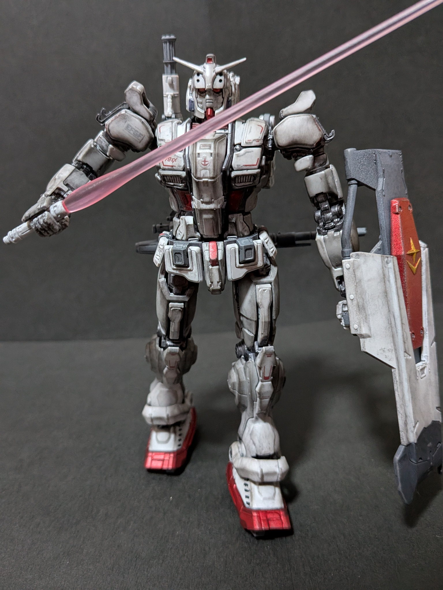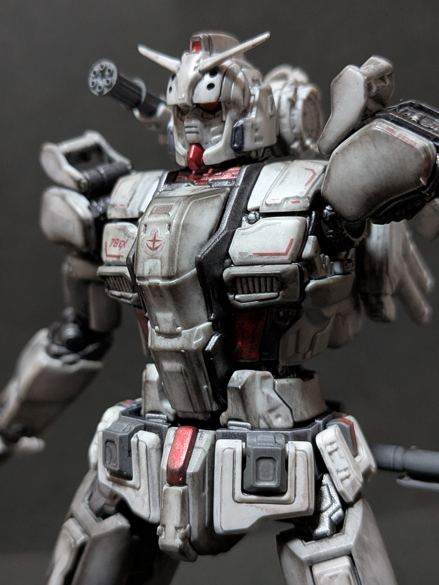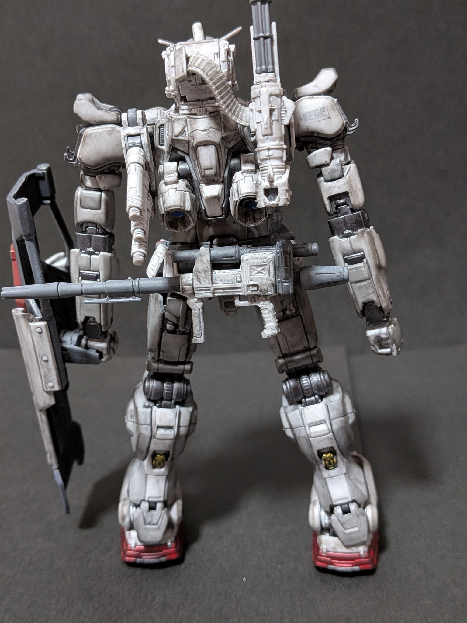 塗装はメタリックレッド(スリッパパーツ等)、ジャーマングレー(ビームライフルやショルダーガトリング等)、MSファントムグレー(シールド)、ガンメタル(関節)残りは成形色でしました。ウェザリングはパーツ割れが恐いので前回同様ターナーのアクリルガッシュでウォッシングしウェザリングマスターで全体を煤多めに塗布しました。今回ビームライフルはサブ扱いなので腰にマウントしたままです。(ビームライフル用のハンドパーツをウェザリングし忘れていたなんて言えない…)