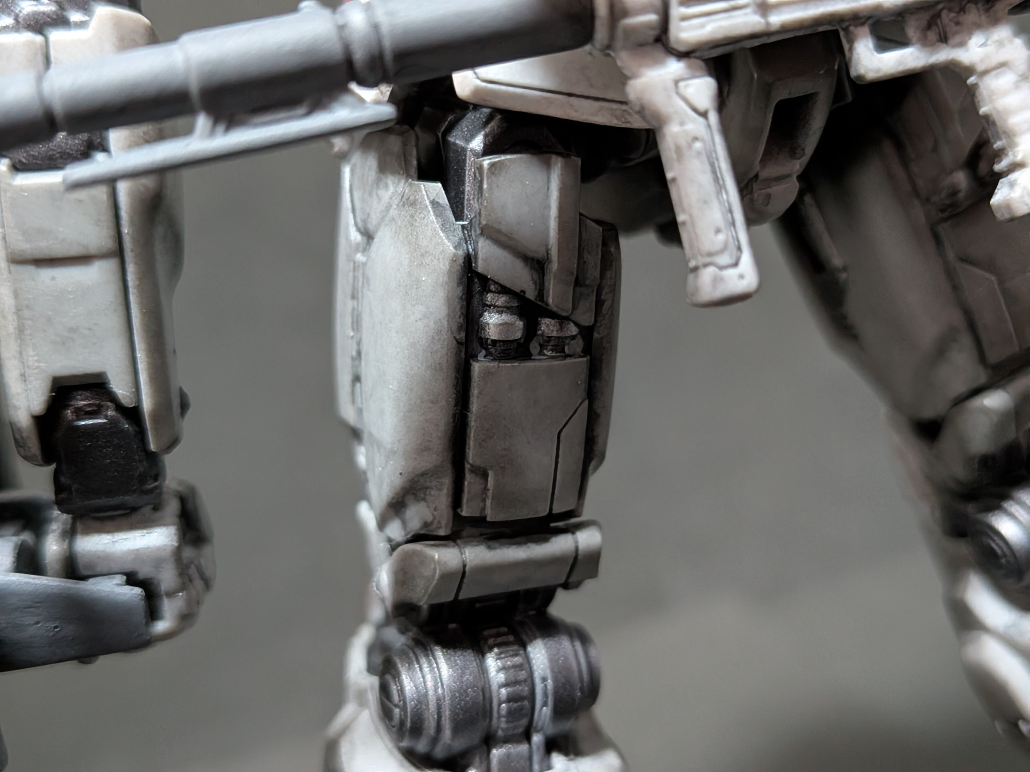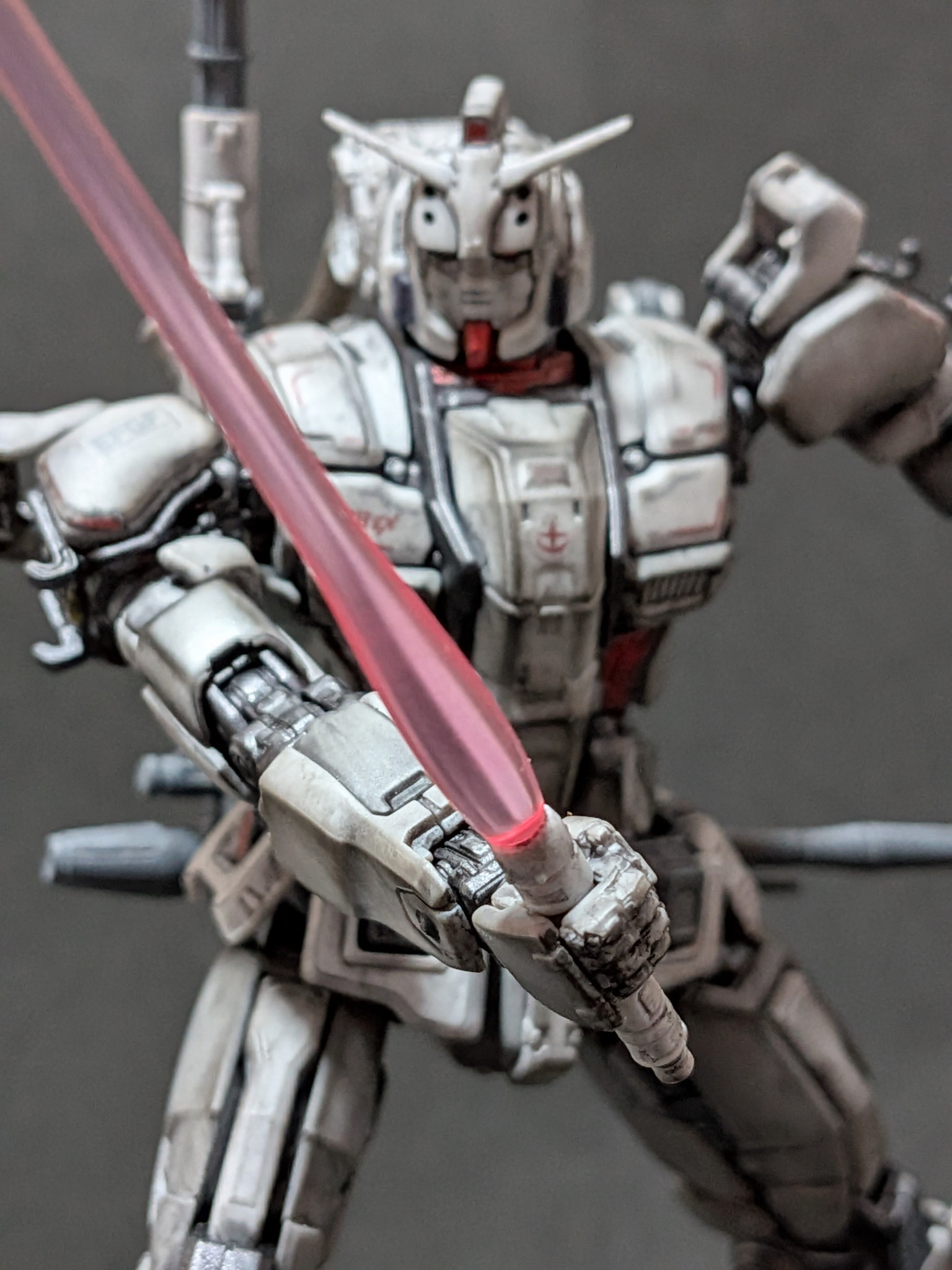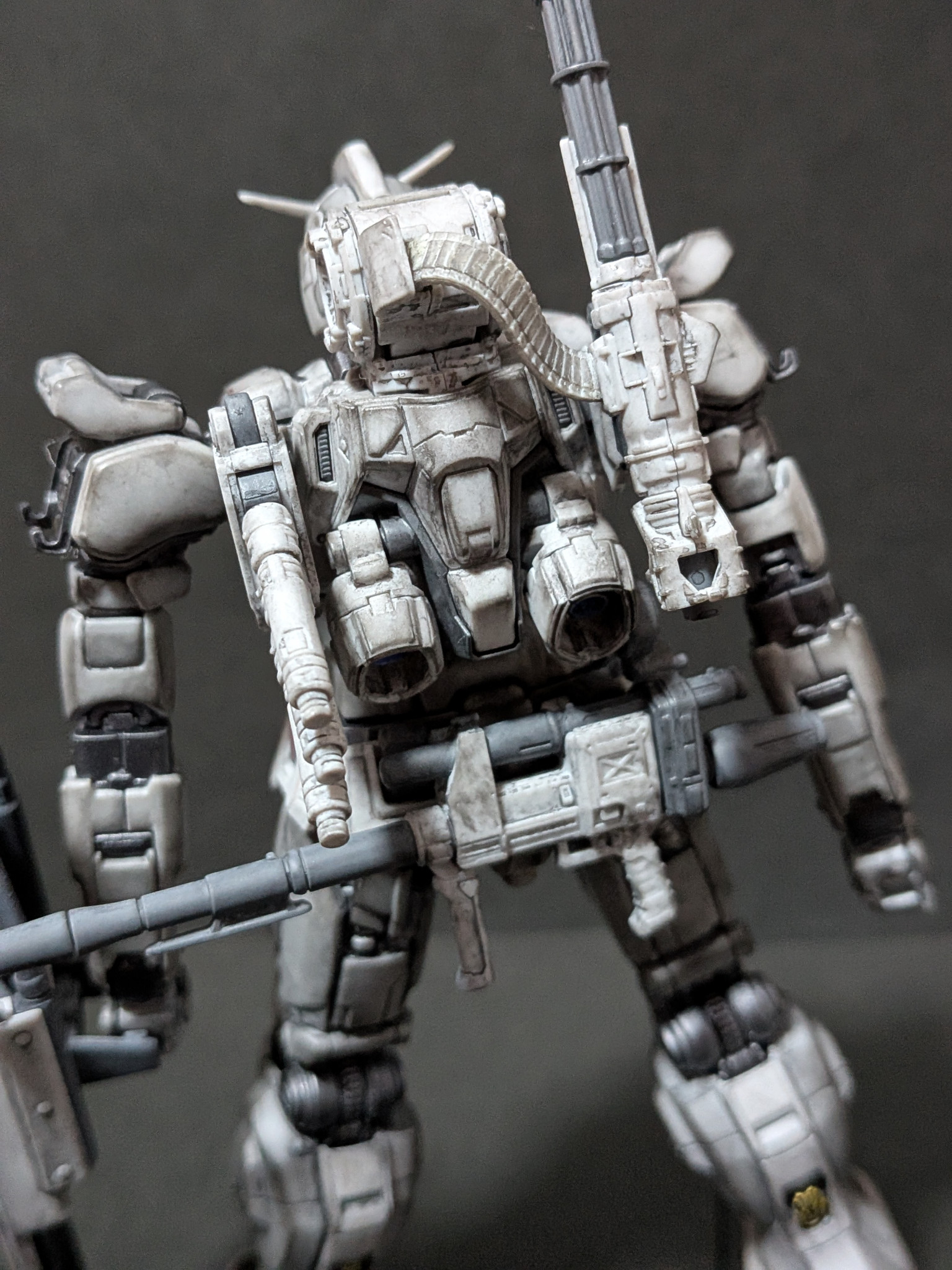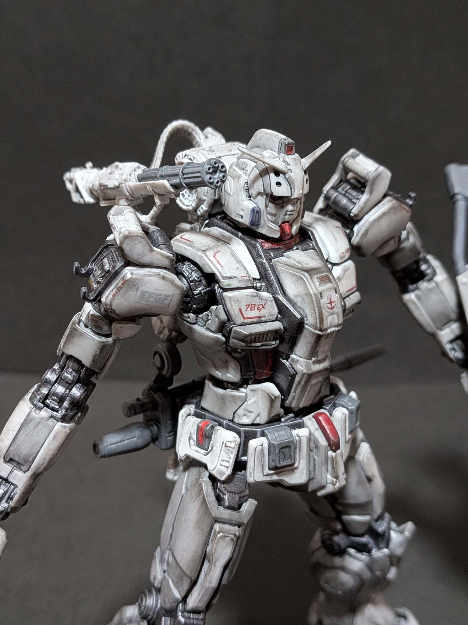 塗装はメタリックレッド(スリッパパーツ等)、ジャーマングレー(ビームライフルやショルダーガトリング等)、MSファントムグレー(シールド)、ガンメタル(関節)残りは成形色でしました。ウェザリングはパーツ割れが恐いので前回同様ターナーのアクリルガッシュでウォッシングしウェザリングマスターで全体を煤多めに塗布しました。今回ビームライフルはサブ扱いなので腰にマウントしたままです。(ビームライフル用のハンドパーツをウェザリングし忘れていたなんて言えない…)