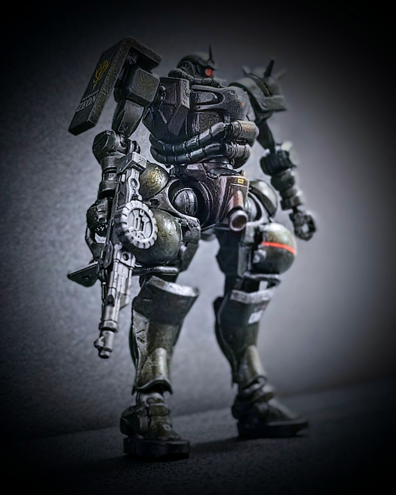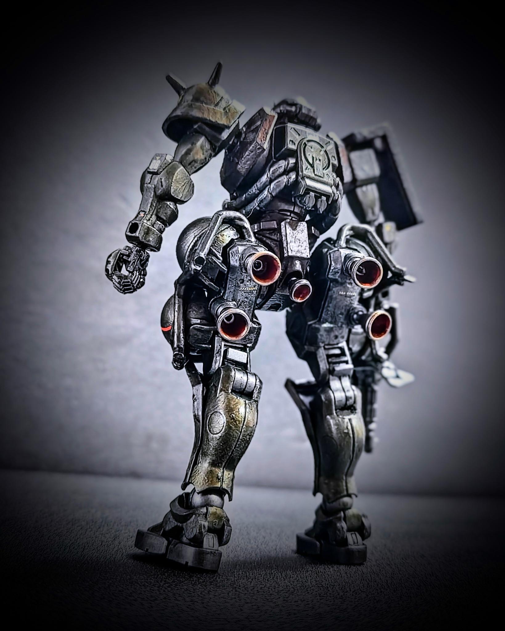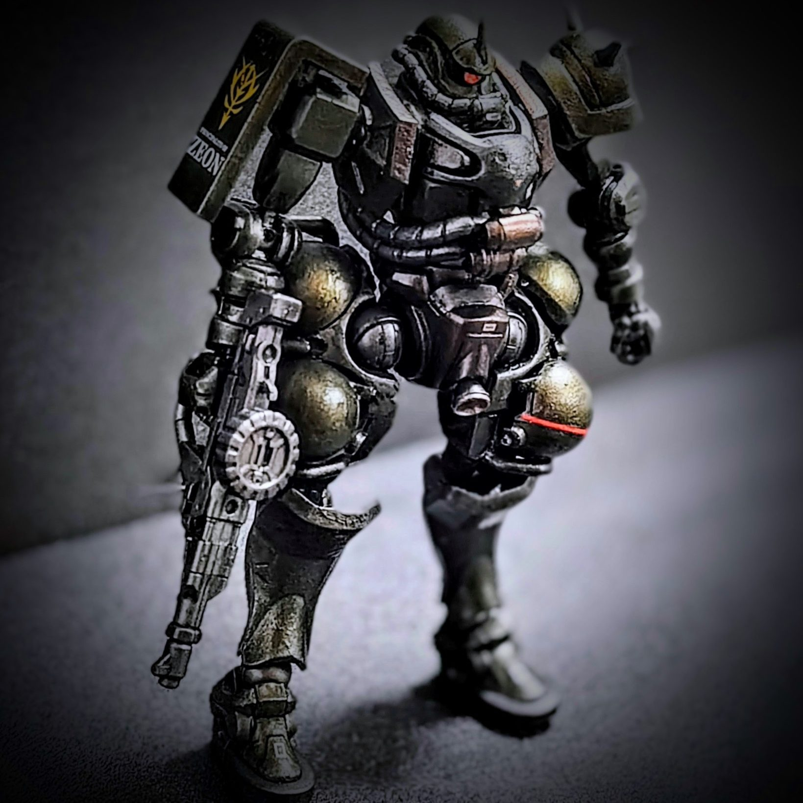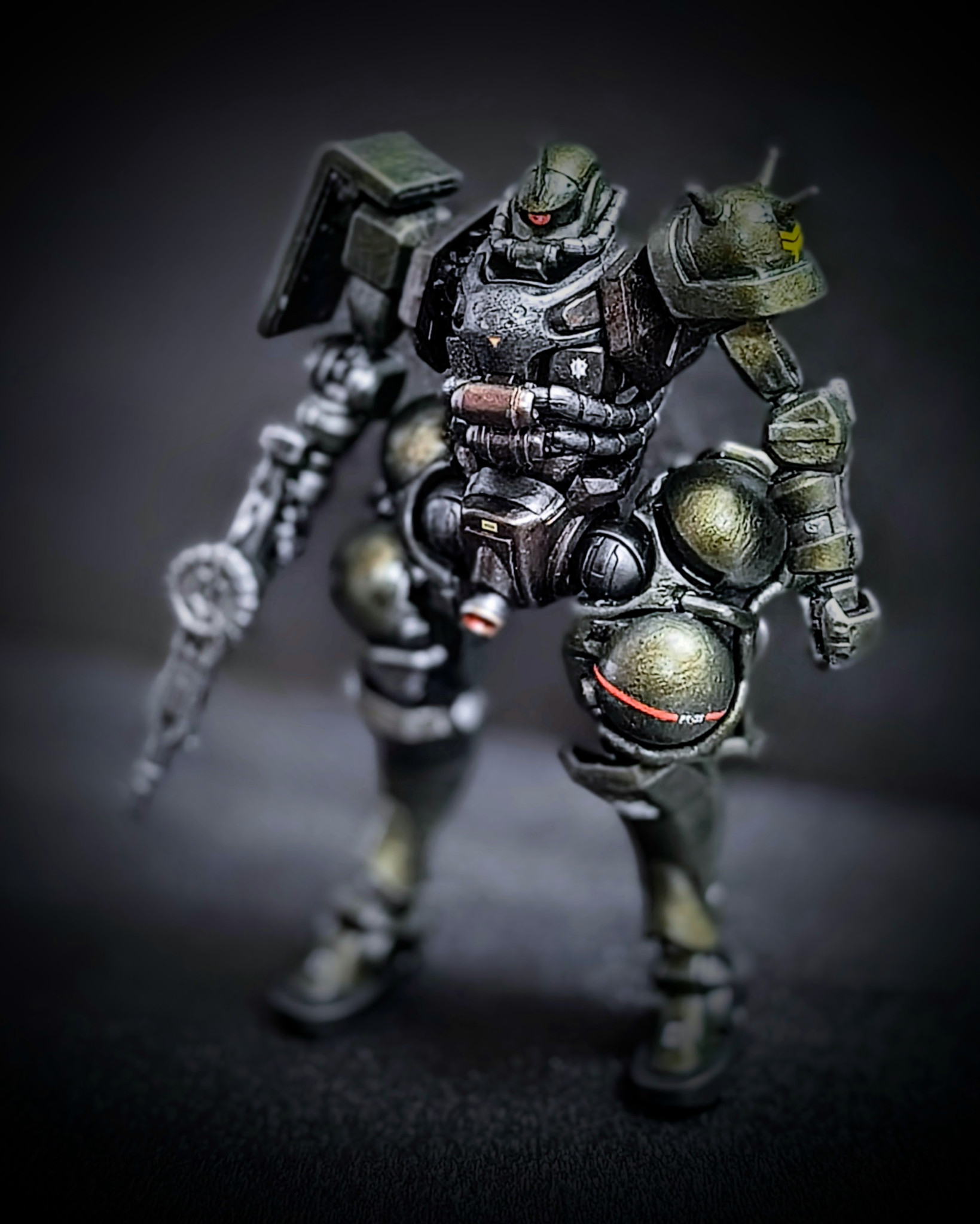 全体的に溶きパテを施して鋳造感を出し、シタデルカラーの筆塗りで全塗装しています。モノアイはラインストーンシールに着色。
