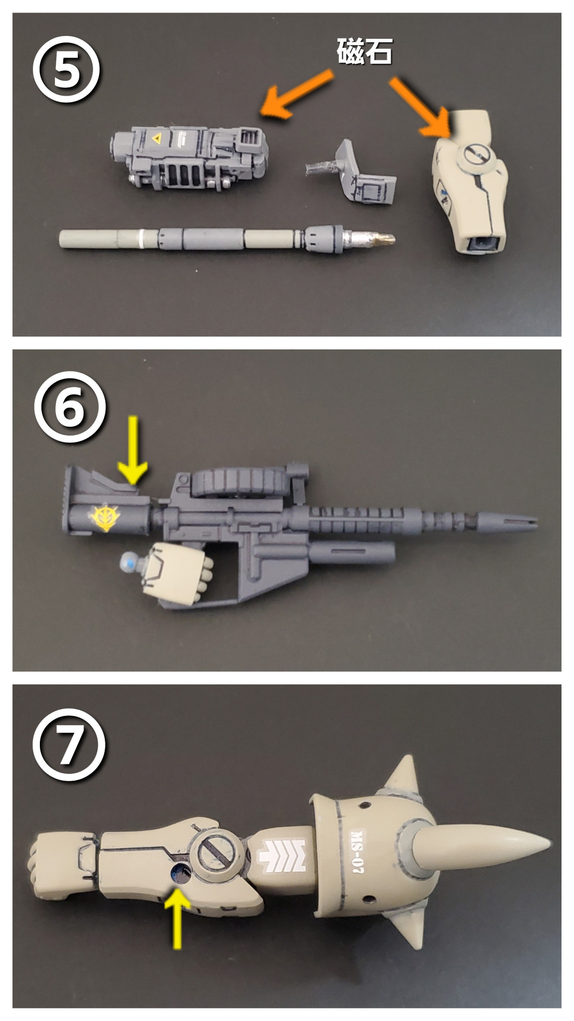 最初接続パーツをプラ板て自作したのですが、それだけでは固定力が弱かったので悩んだ挙げ句、温存していたマグネットによる接続にチャレンジ🌟いたしました👍️マグネットはランチャー基部と右腕肘関節に仕込み固定❕イメージ通りの密着感が得られました😊🎶