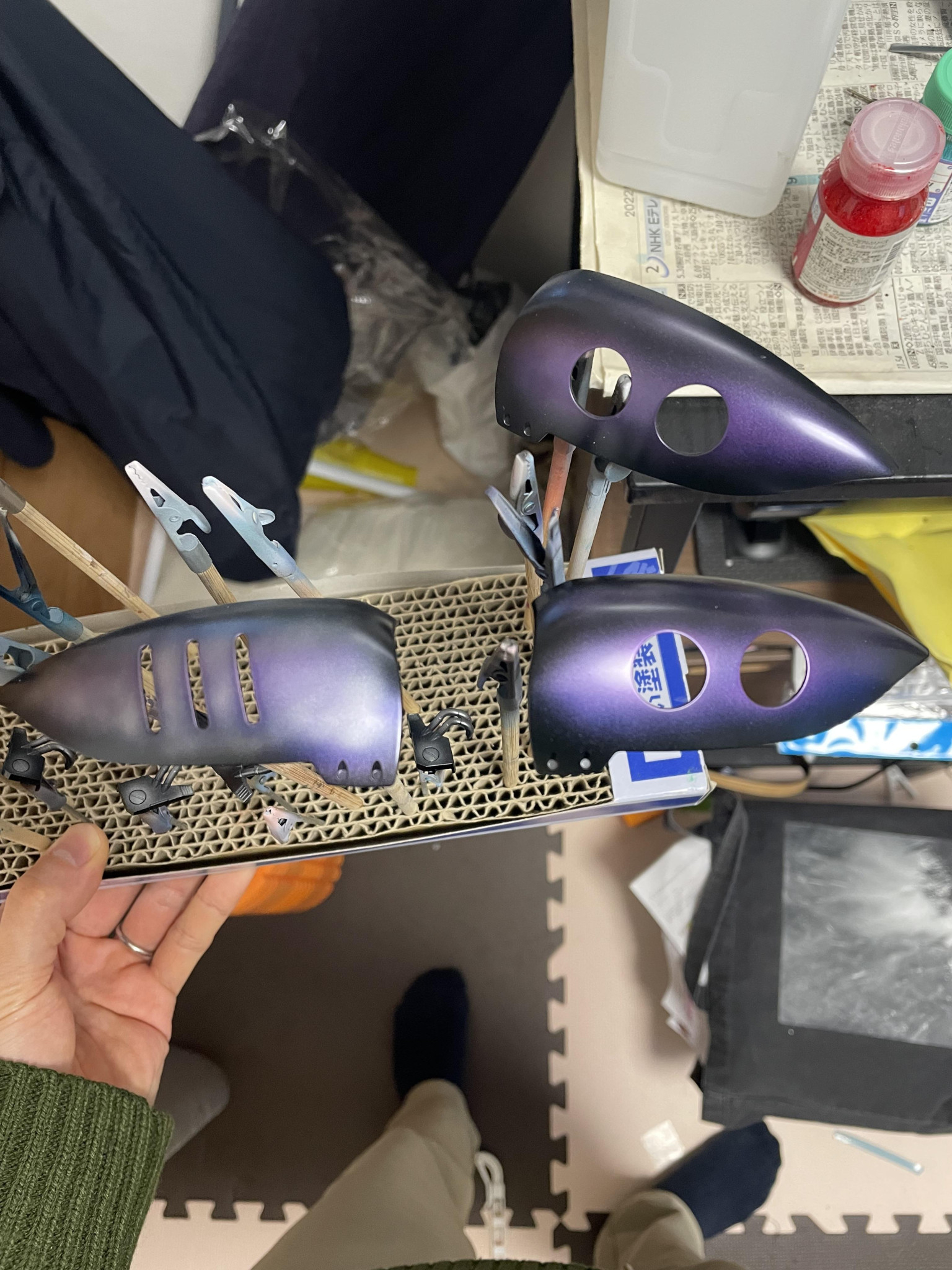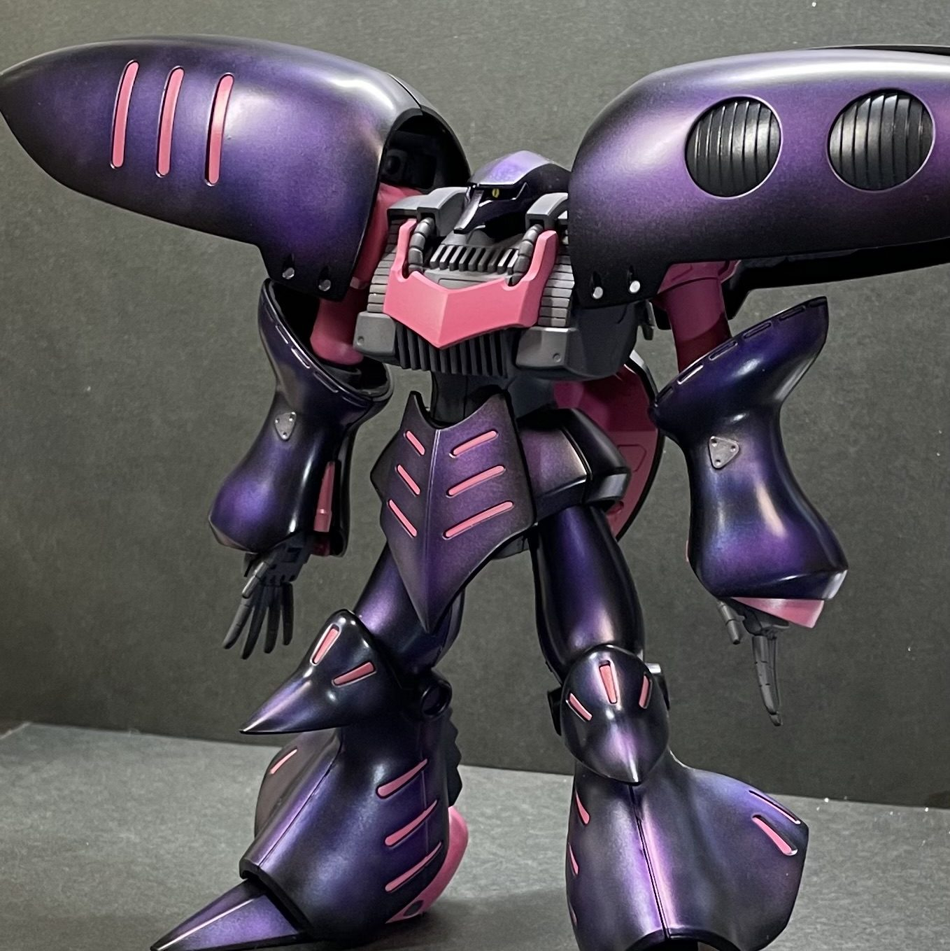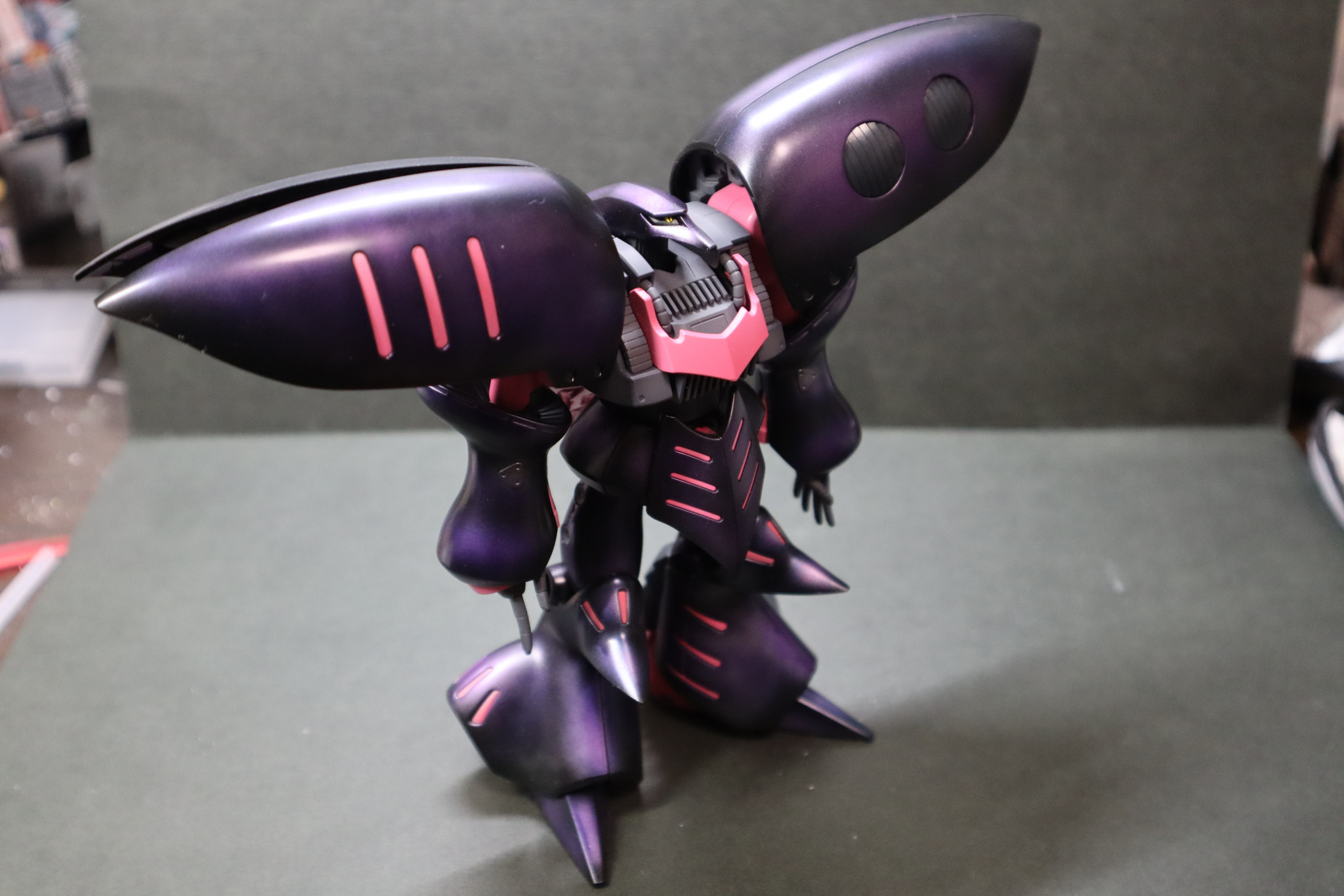 グラデーションキャンディ塗装っぽくしたいなというのは最初に決めていたのですが、塗り重ねていくうちにマットなほうが重さが出ると思います、外装はセミグロスクリアーで仕上げました。プレバンのキュベレイマークIIは成形色がツヤツヤなので、それをいかしたかったのですが、研ぐのも時間かかり今回のテーマにそぐわないなとおったので、半々艶くらいを目指しました。