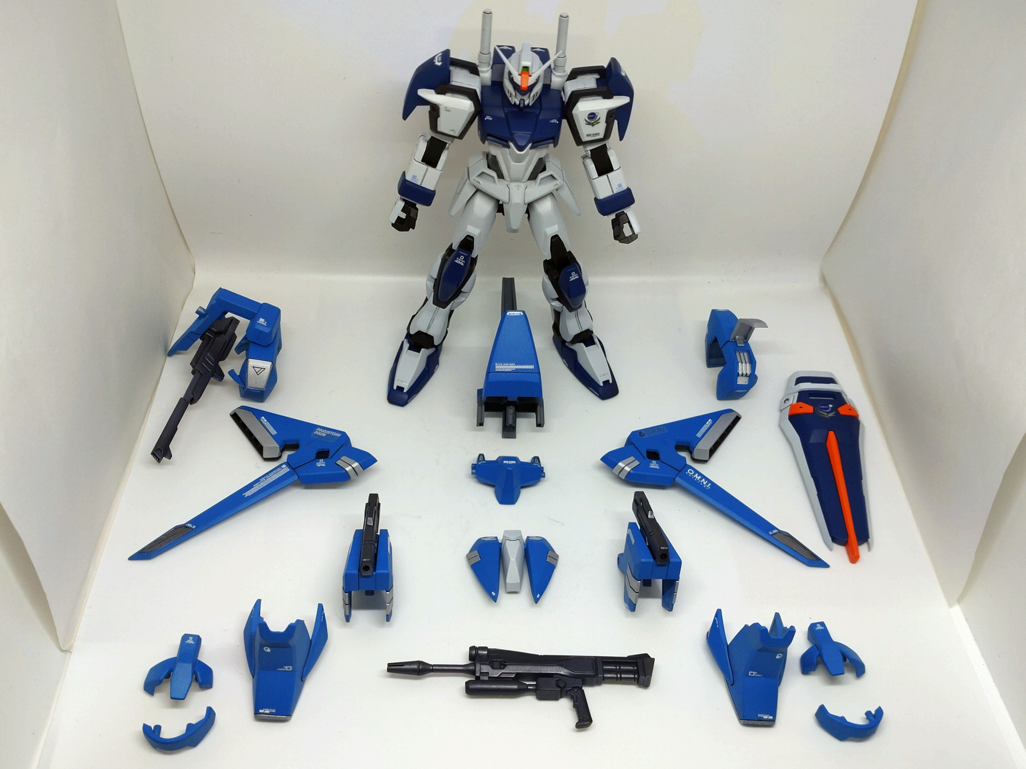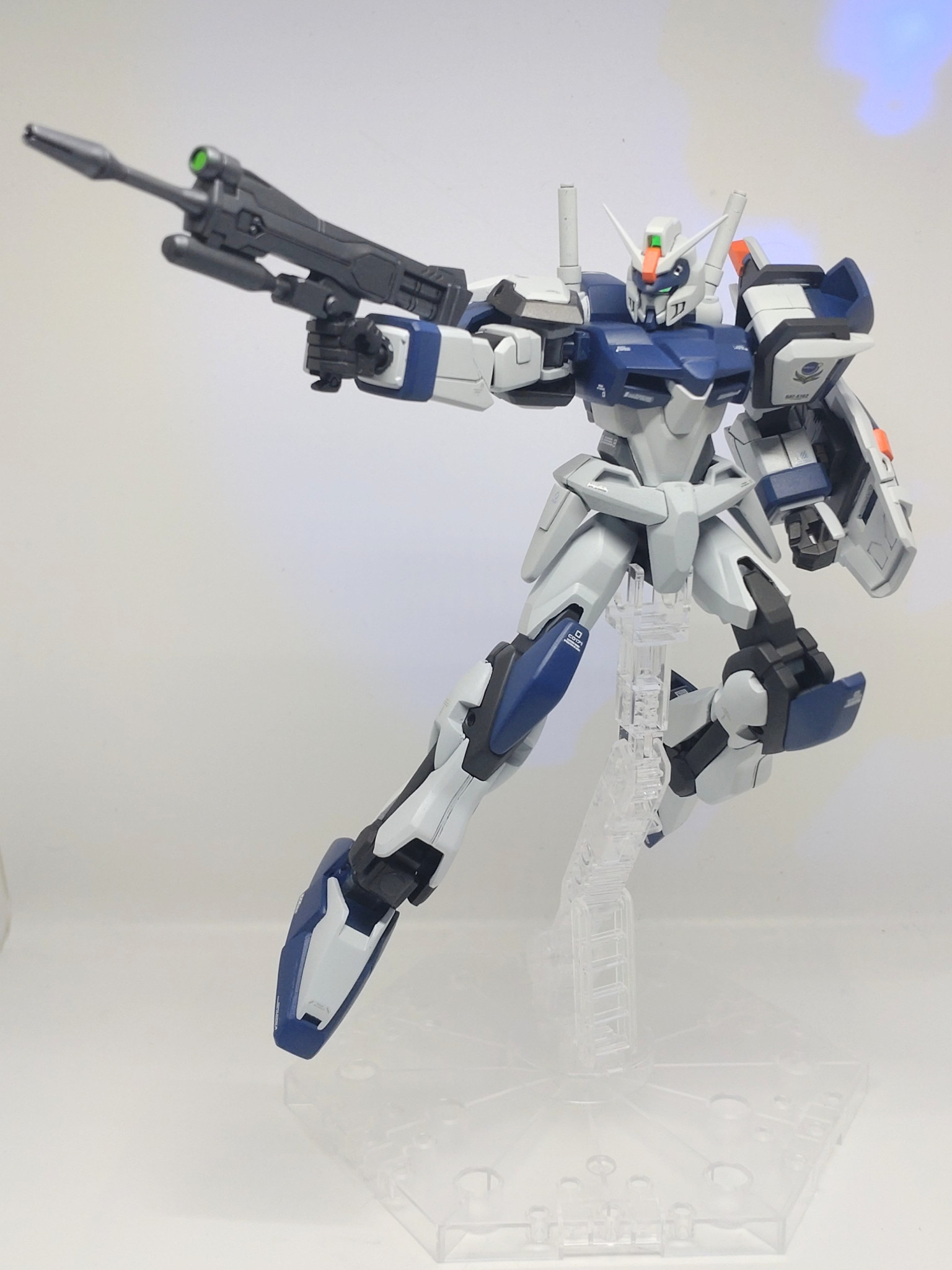 シルバーと調色したブルーで落ち着いた色合いにしました。脚部アーマーがモナカ割りで左右から脚に挟む形式で、真ん中の合わせ目ができてしまうため、ここだけネオジム接続にして合わせ目を消しました。脚部の延長、SEED系旧HGの安定感抜群過ぎるスリッパの小型化を行いました。