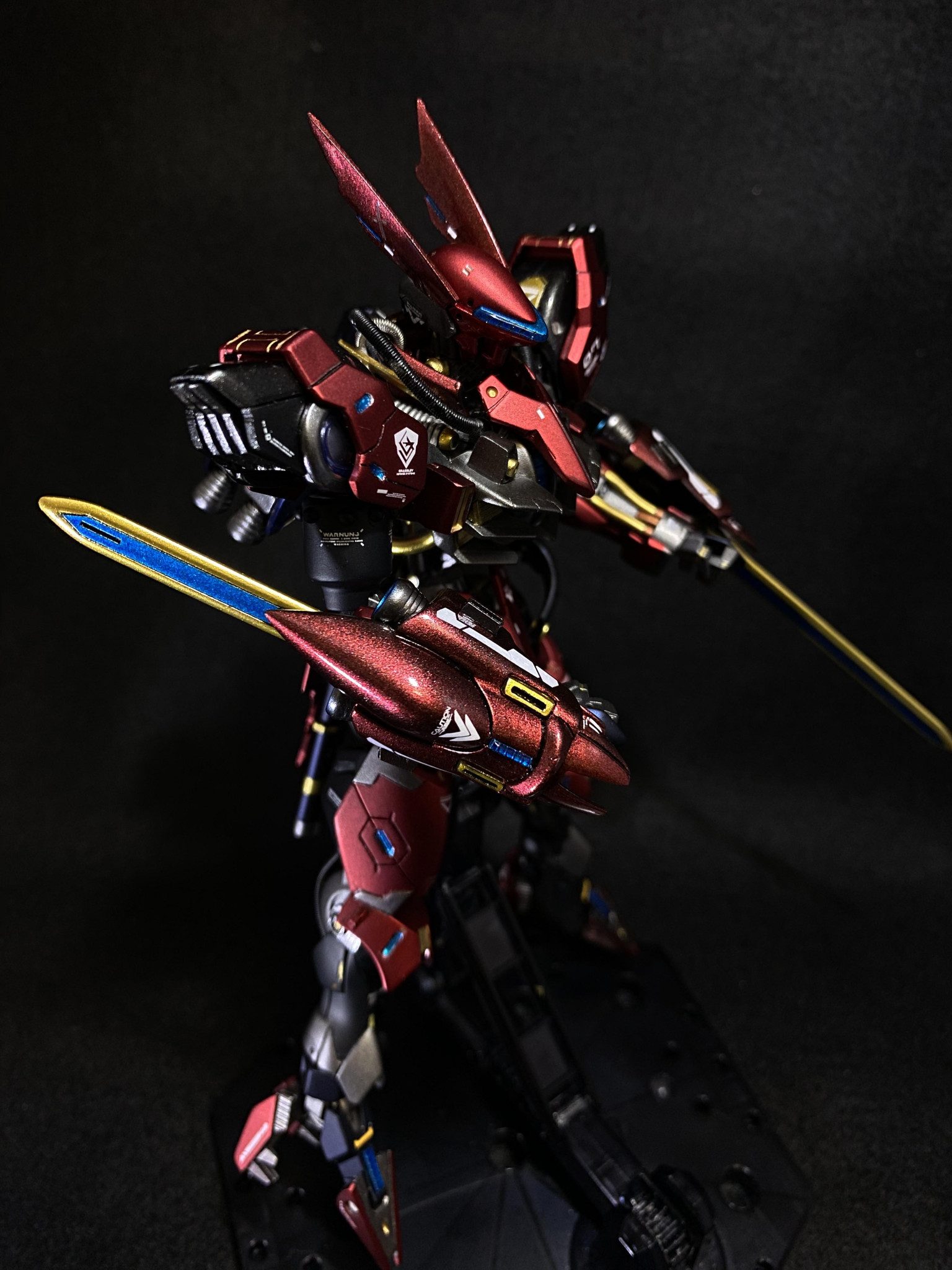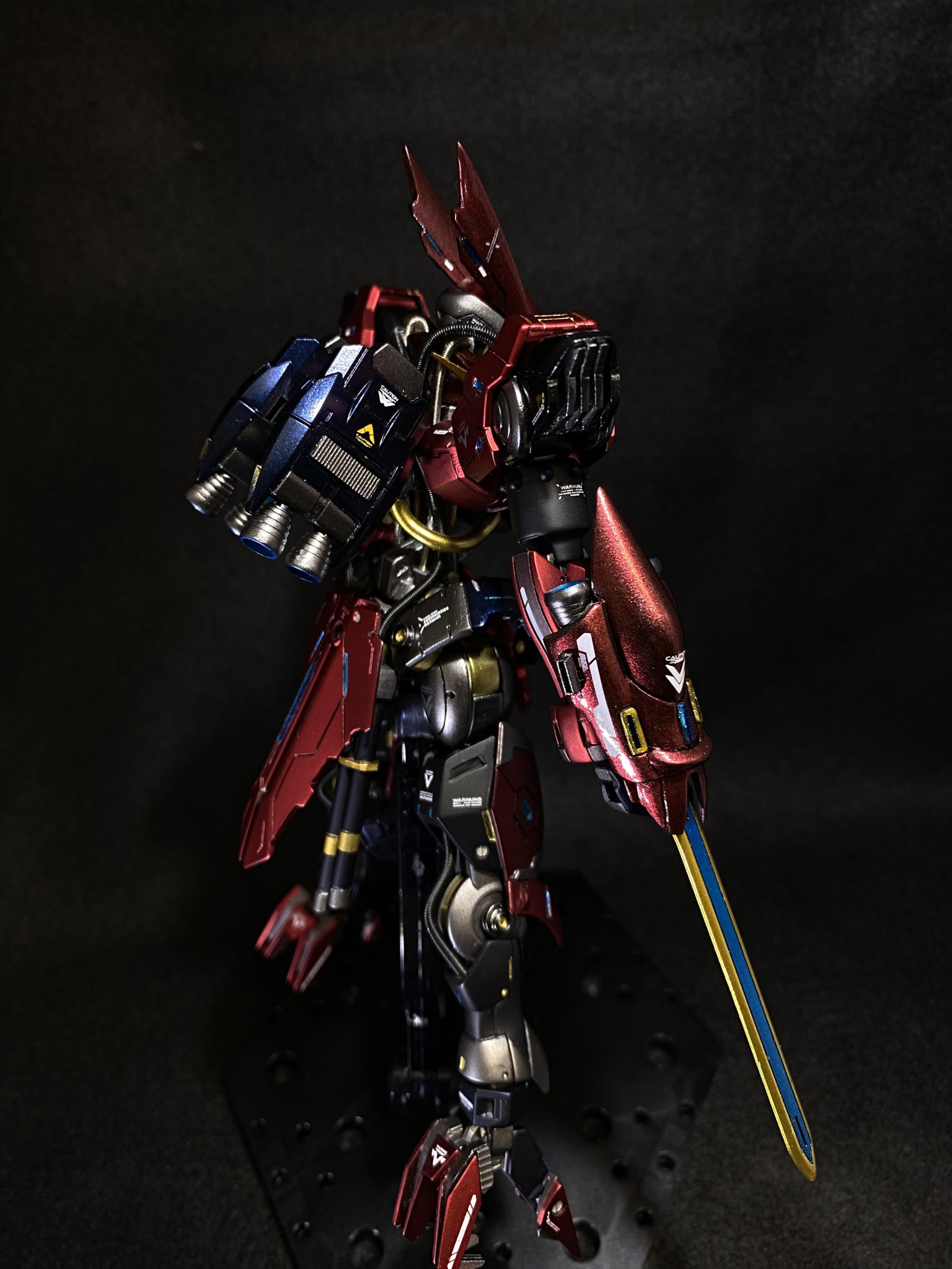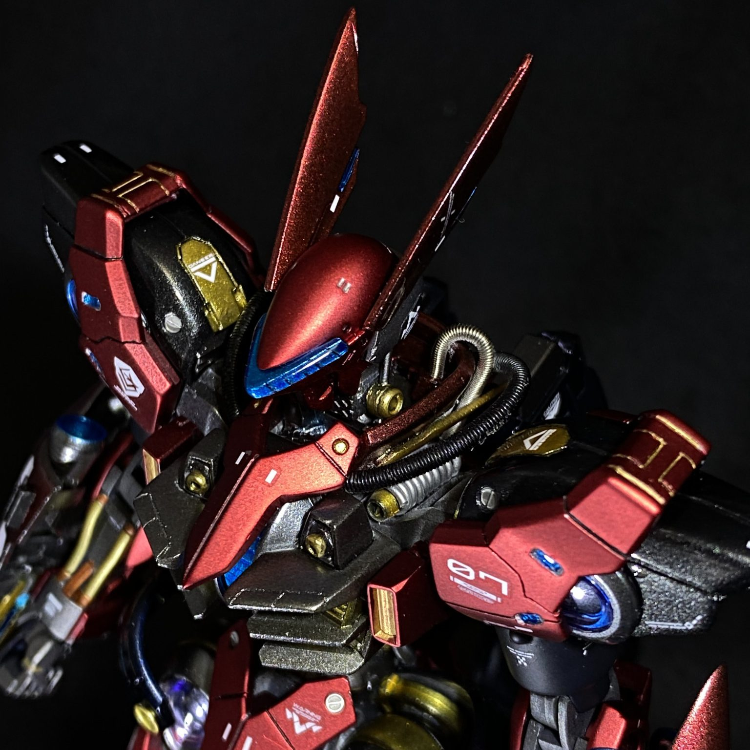 その他の工作:プラ板、プラ棒で胸部バルカン•肩のしいたけディティール•リアスカートの裏に細い2連のプロペラントタンク、目のセンサーなどを作製。画像だと全然見えてないですが、胴体部分にスプリングでパイピングしてます。