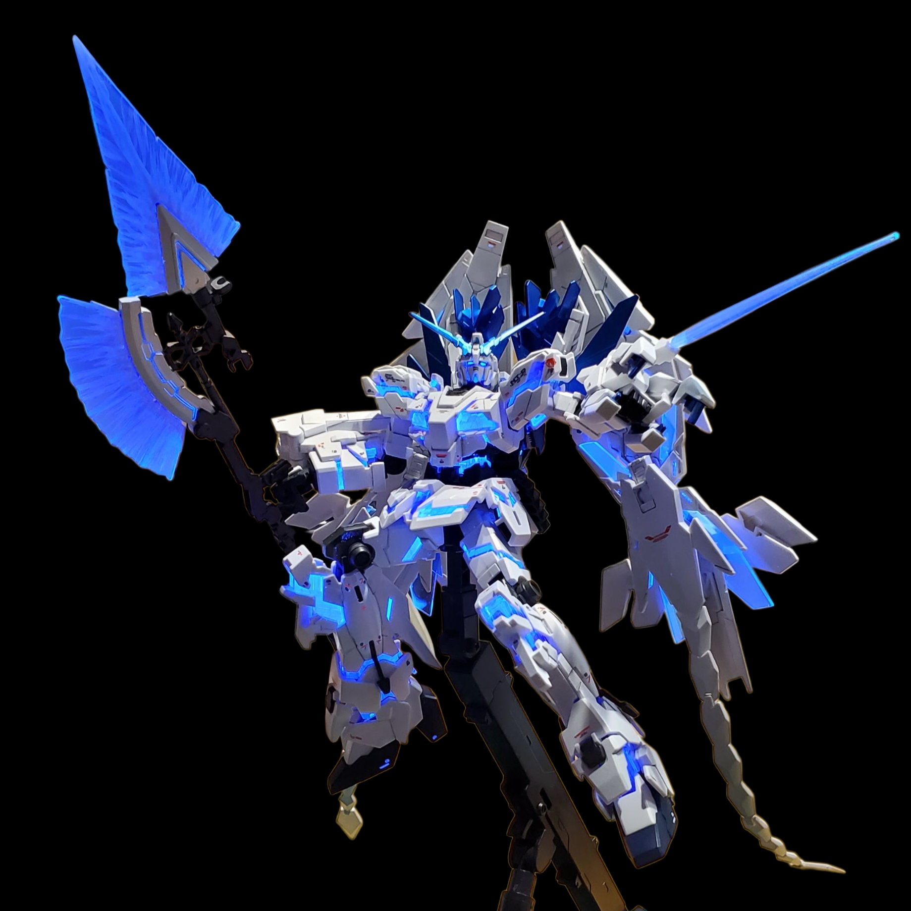 サイコフレームは成形色のままですが、蛍光クリアを塗布しUVライトで光るようにしてます。カメラアイとビームジャベリンにも同じ施しで光るようにしてます。