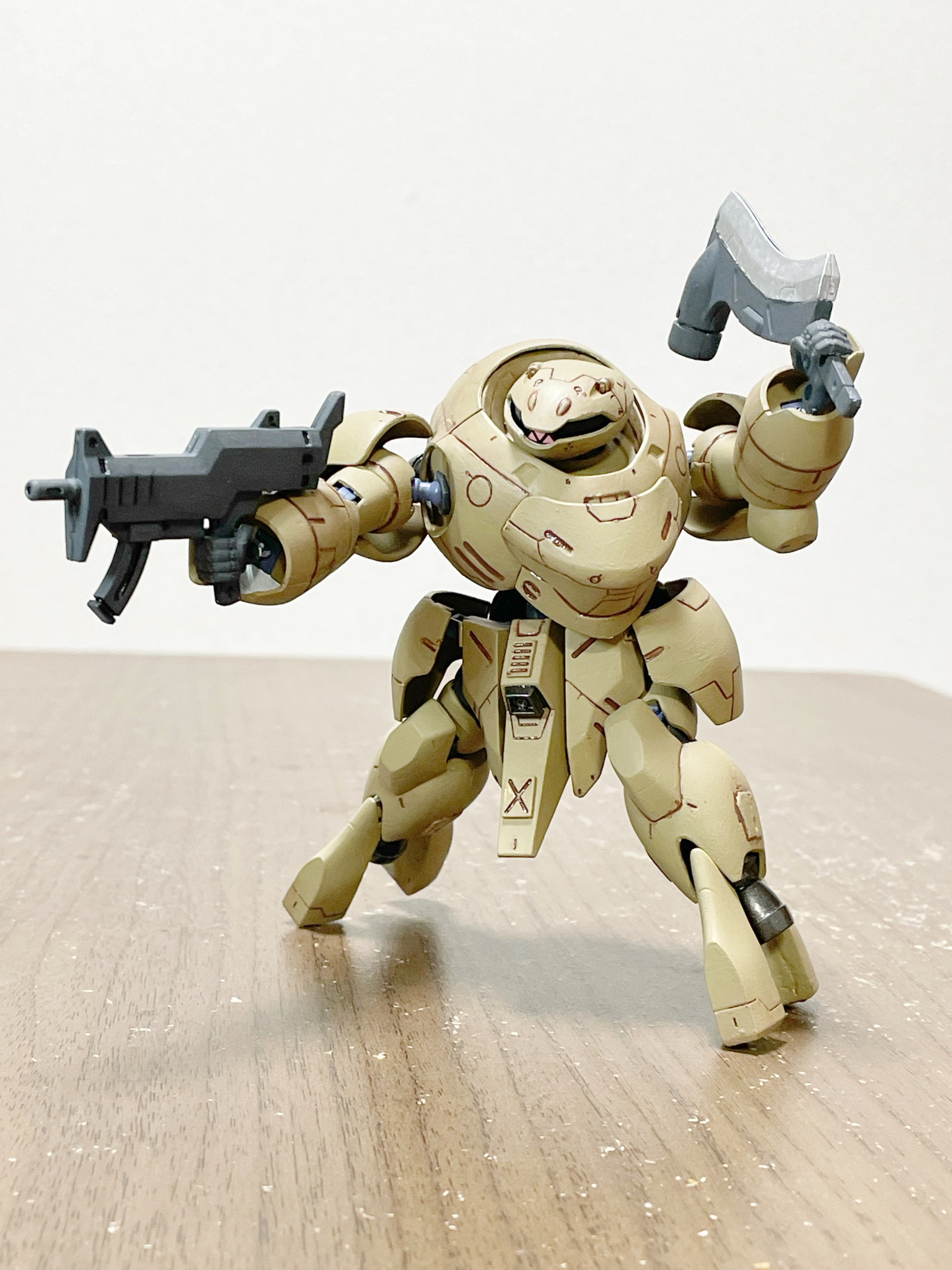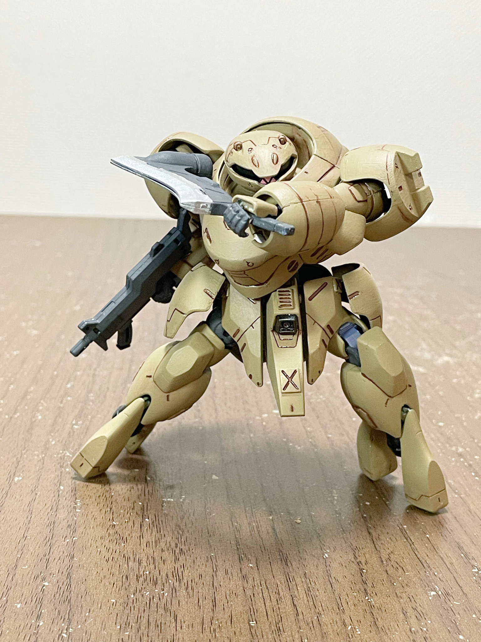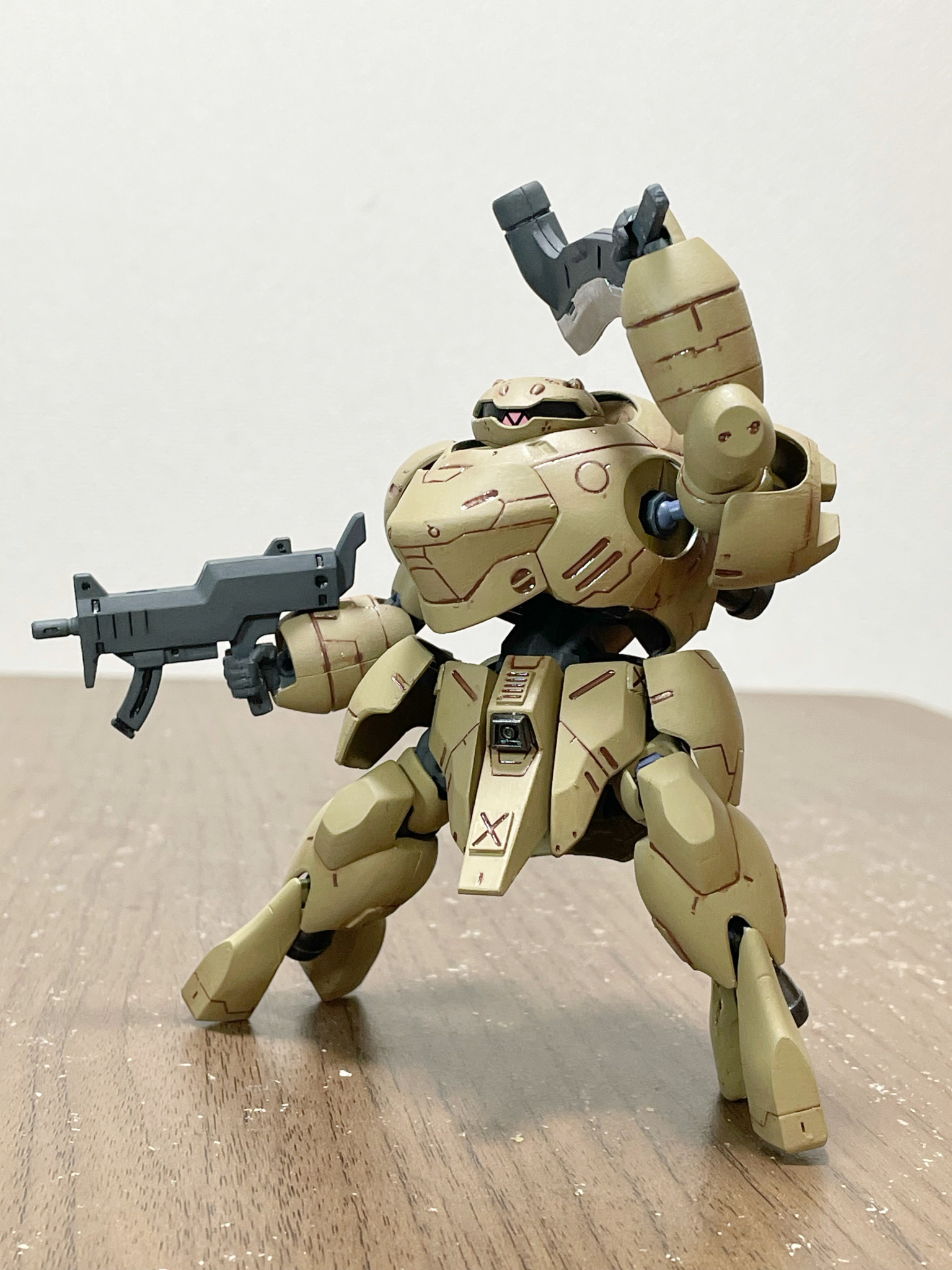 一応ブルワーズ壊滅後、ある傭兵の手に渡る→輸送船団の護衛等真っ当な仕事で稼ぐ主義ゆえブルワーズままのカラーリングではクライアントの印象が悪い→だからとりあえず手っ取り早くリペイントという適当設定が後付けしてあります😅
