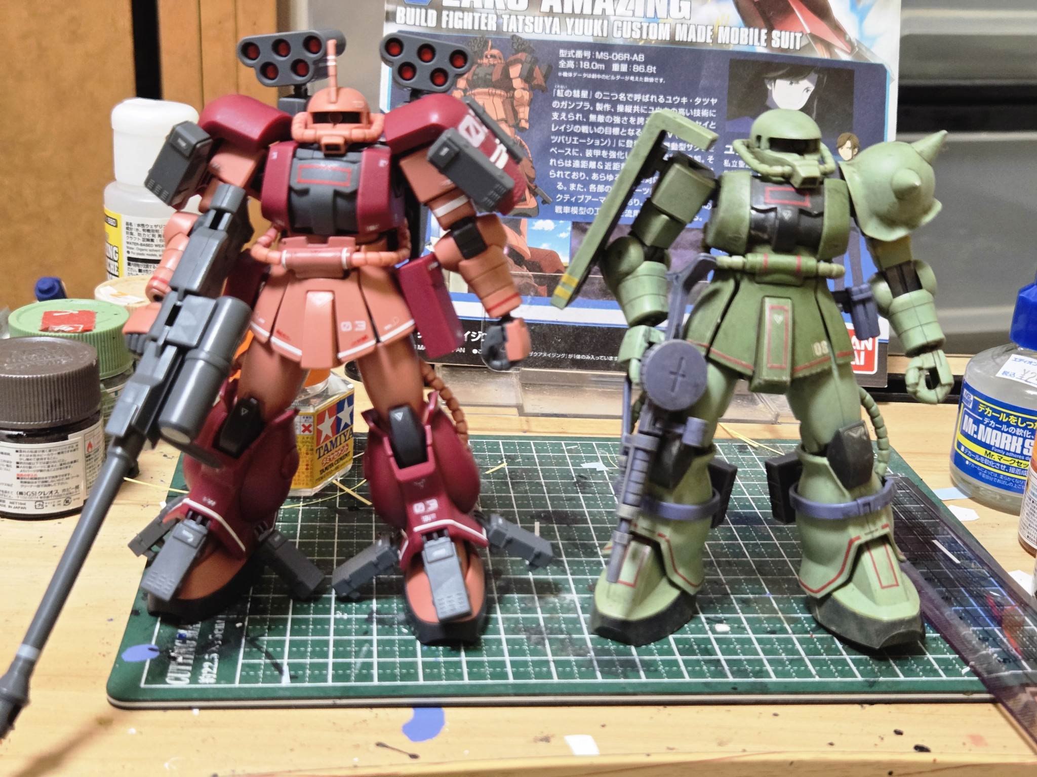 前回、部分塗装までして投稿した食玩Gフレーム黒い三連星ザクで…